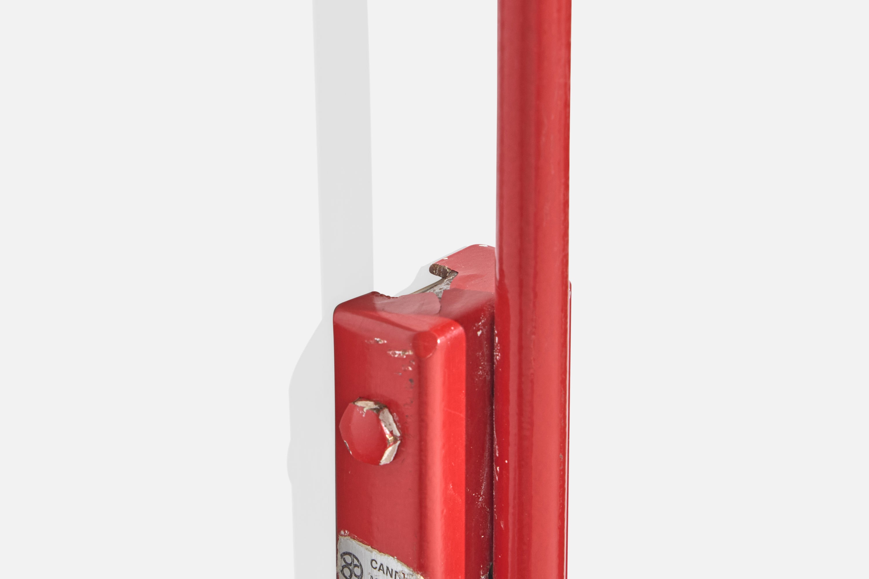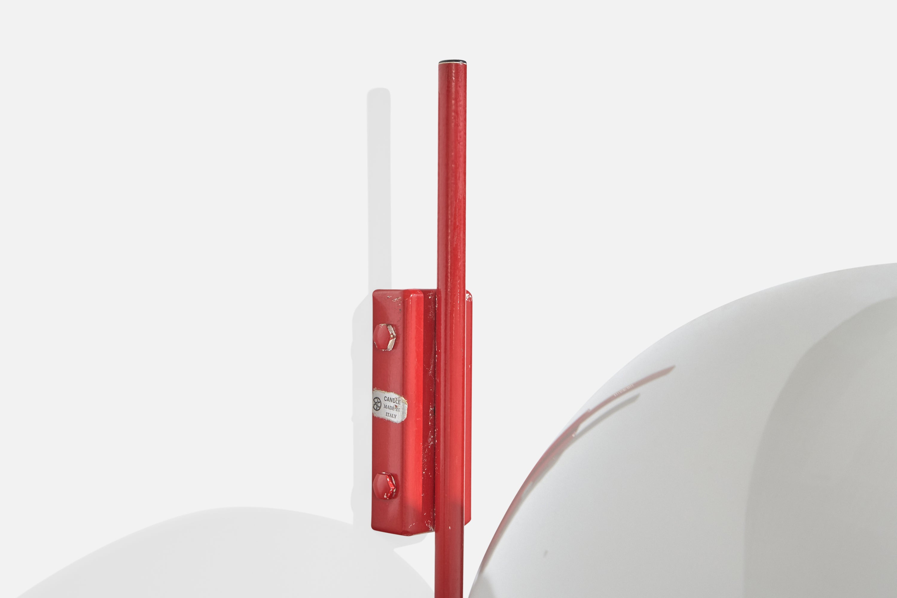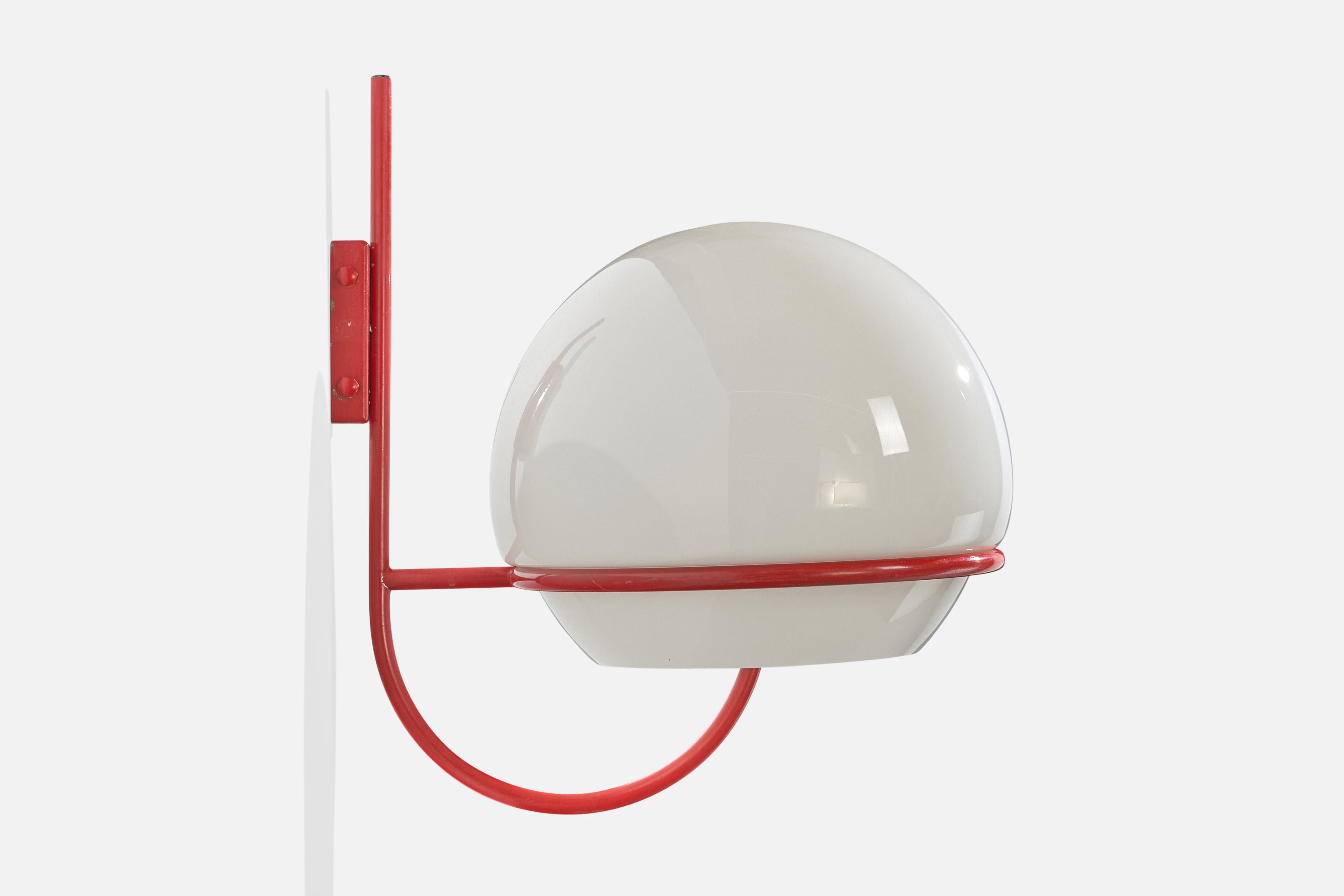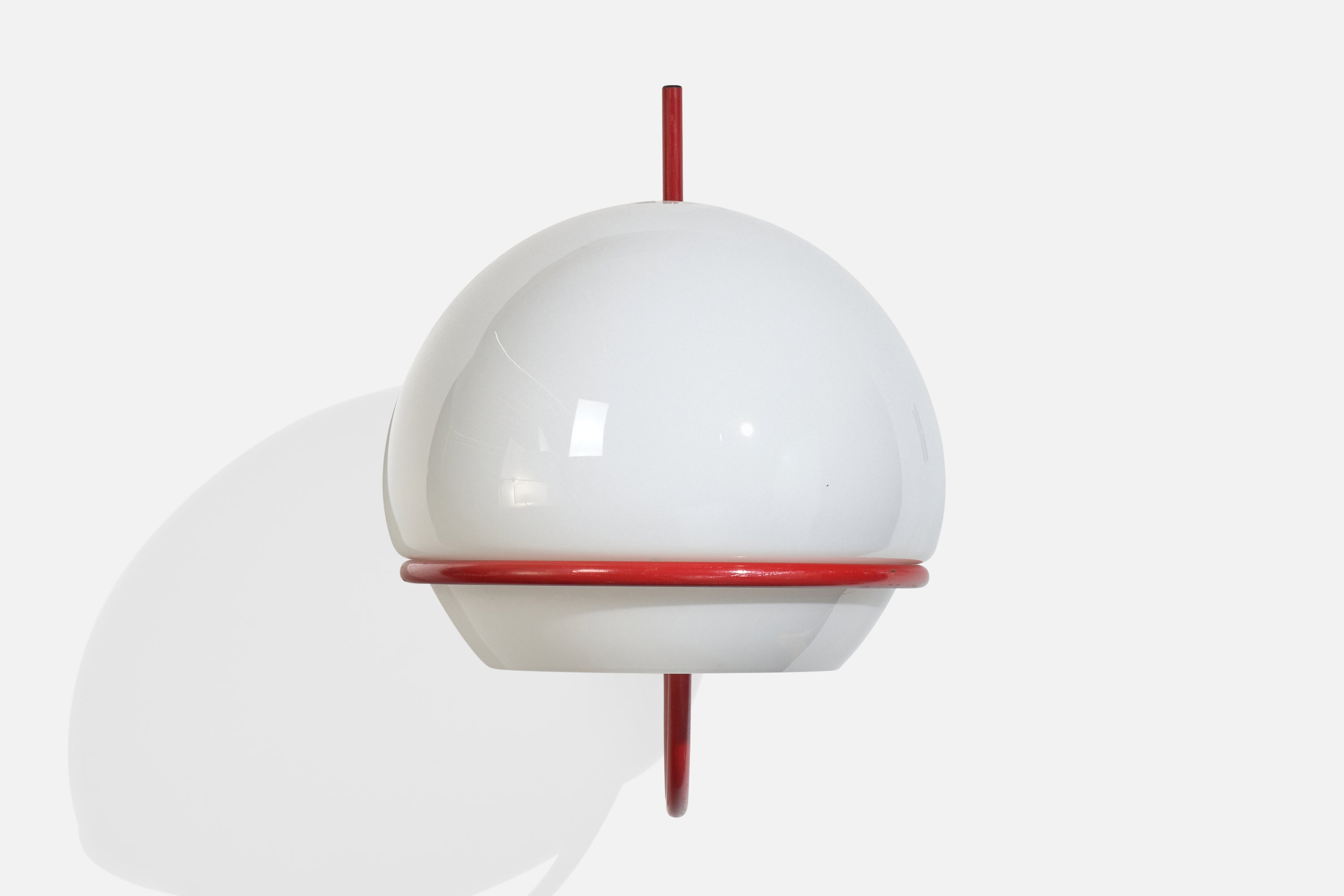 A pair of red-lacquered metal and white opaline glass wall lights, model b515, produced by Candle, Italy, c. 1970s.