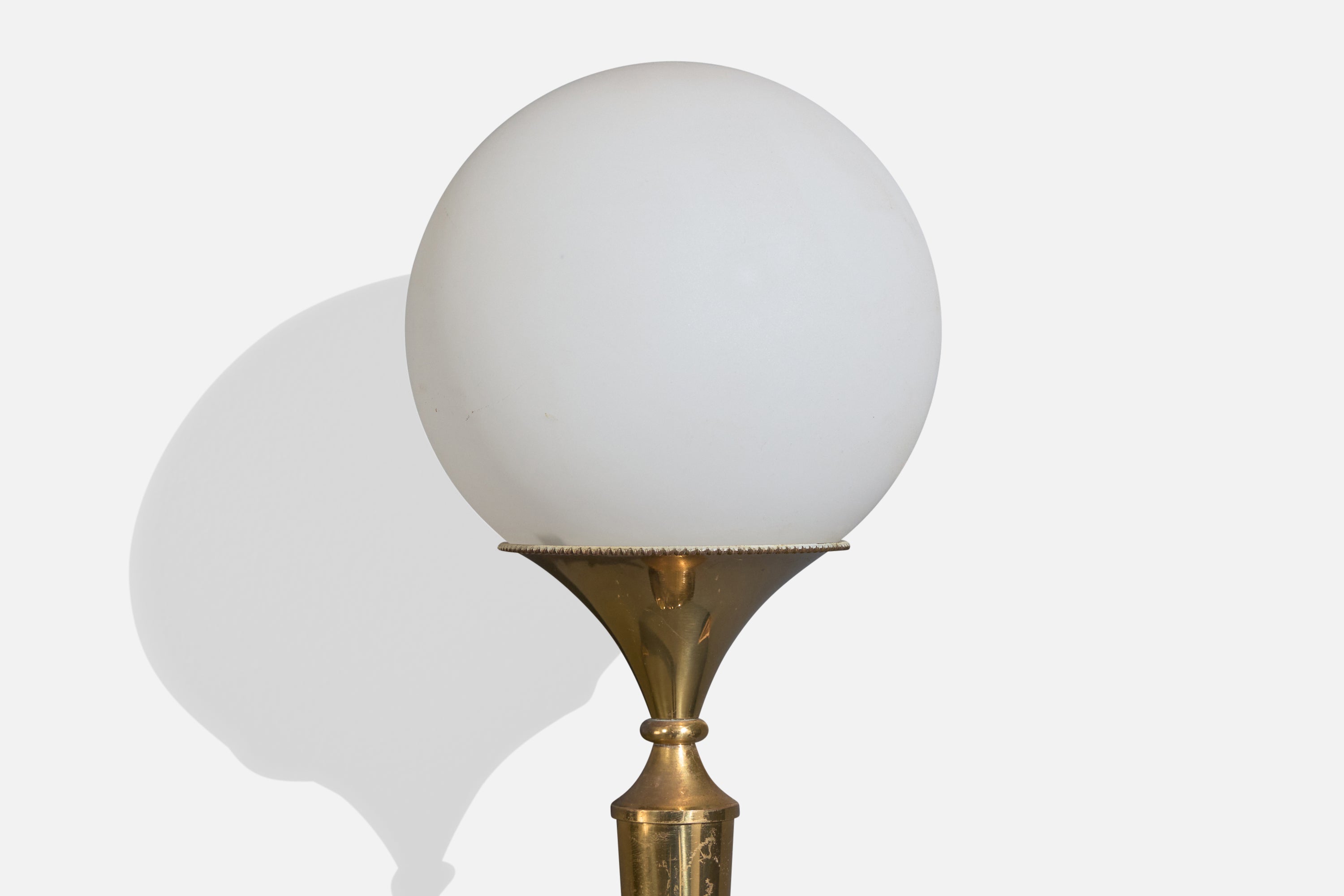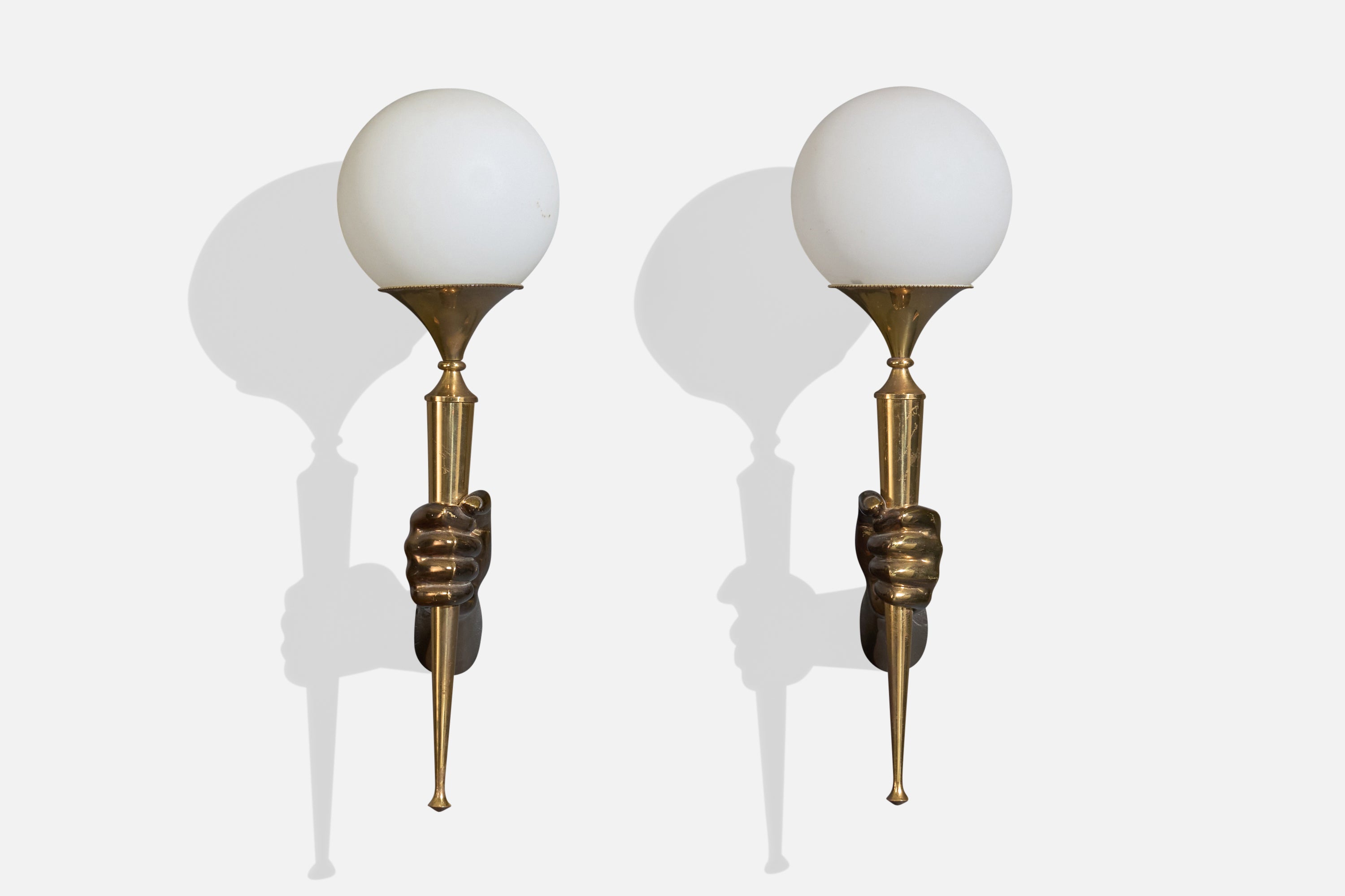 A pair of brass and white opaline glass wall lights designed and produced in France, c. 1950s.