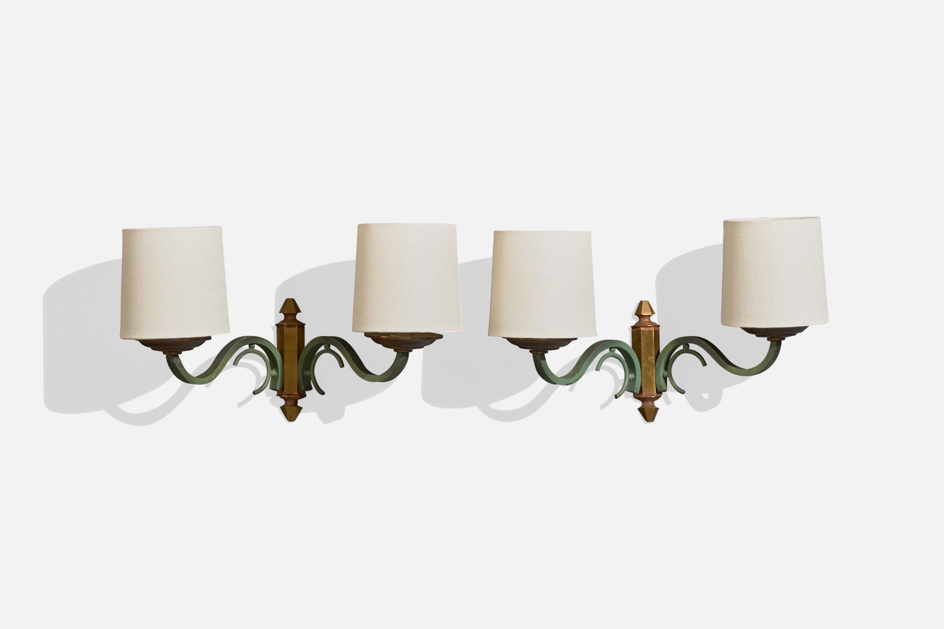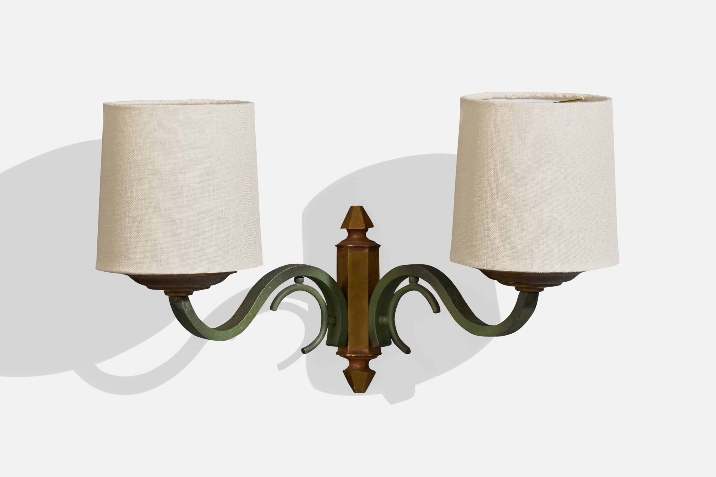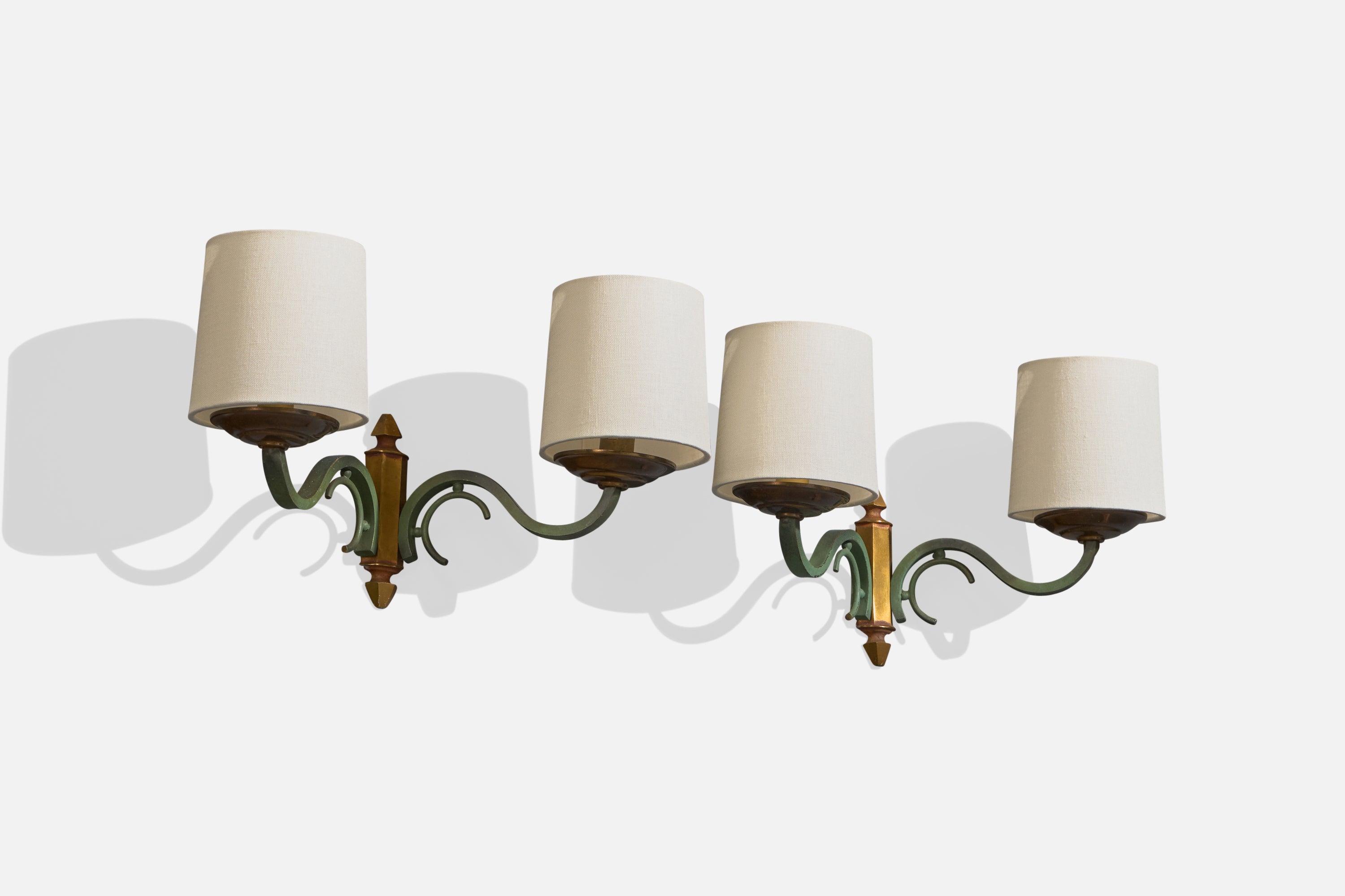 A pair of brass, green-lacquered metal and white fabric wall lights designed and produced in France, c. 1940s.