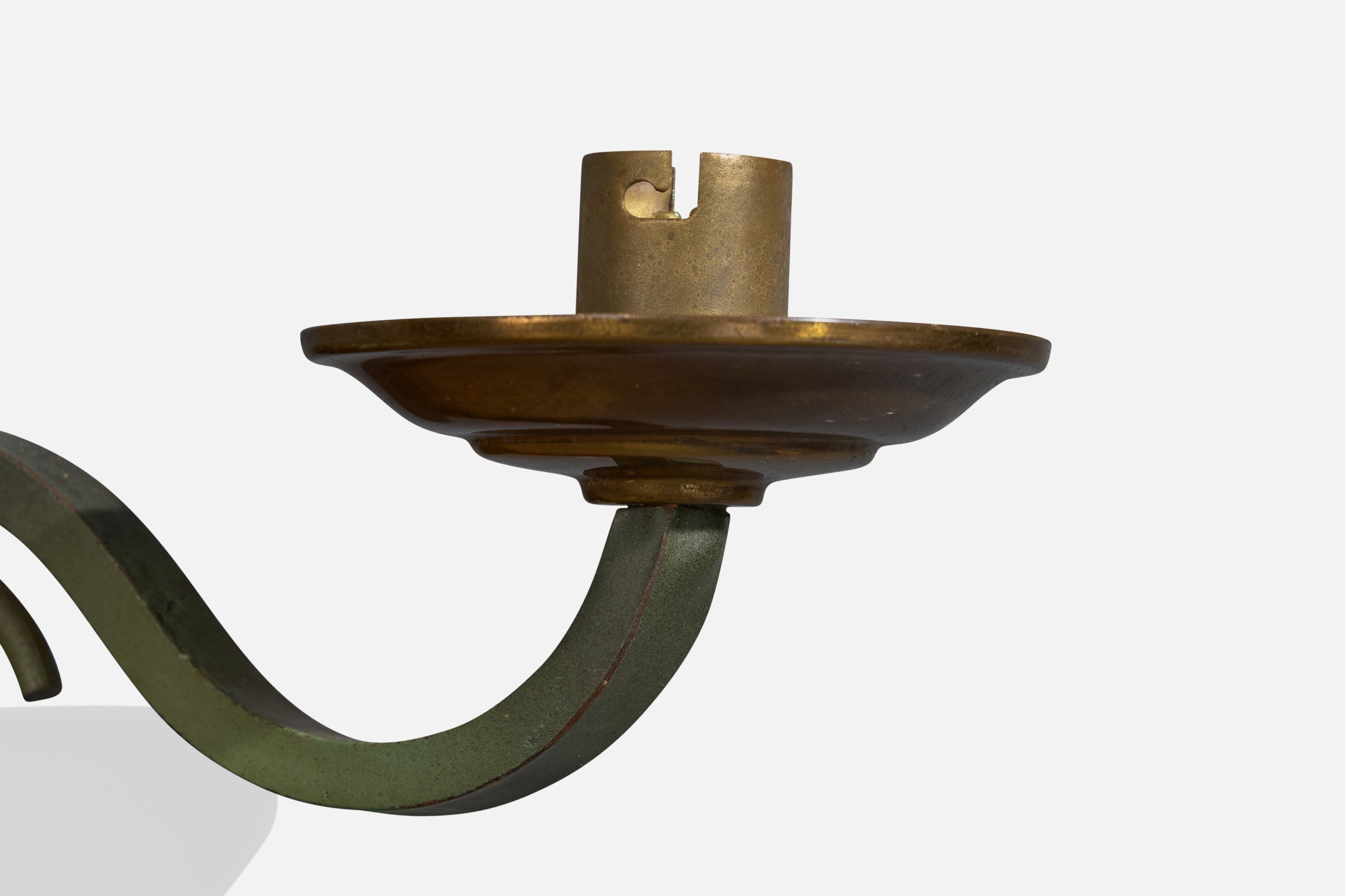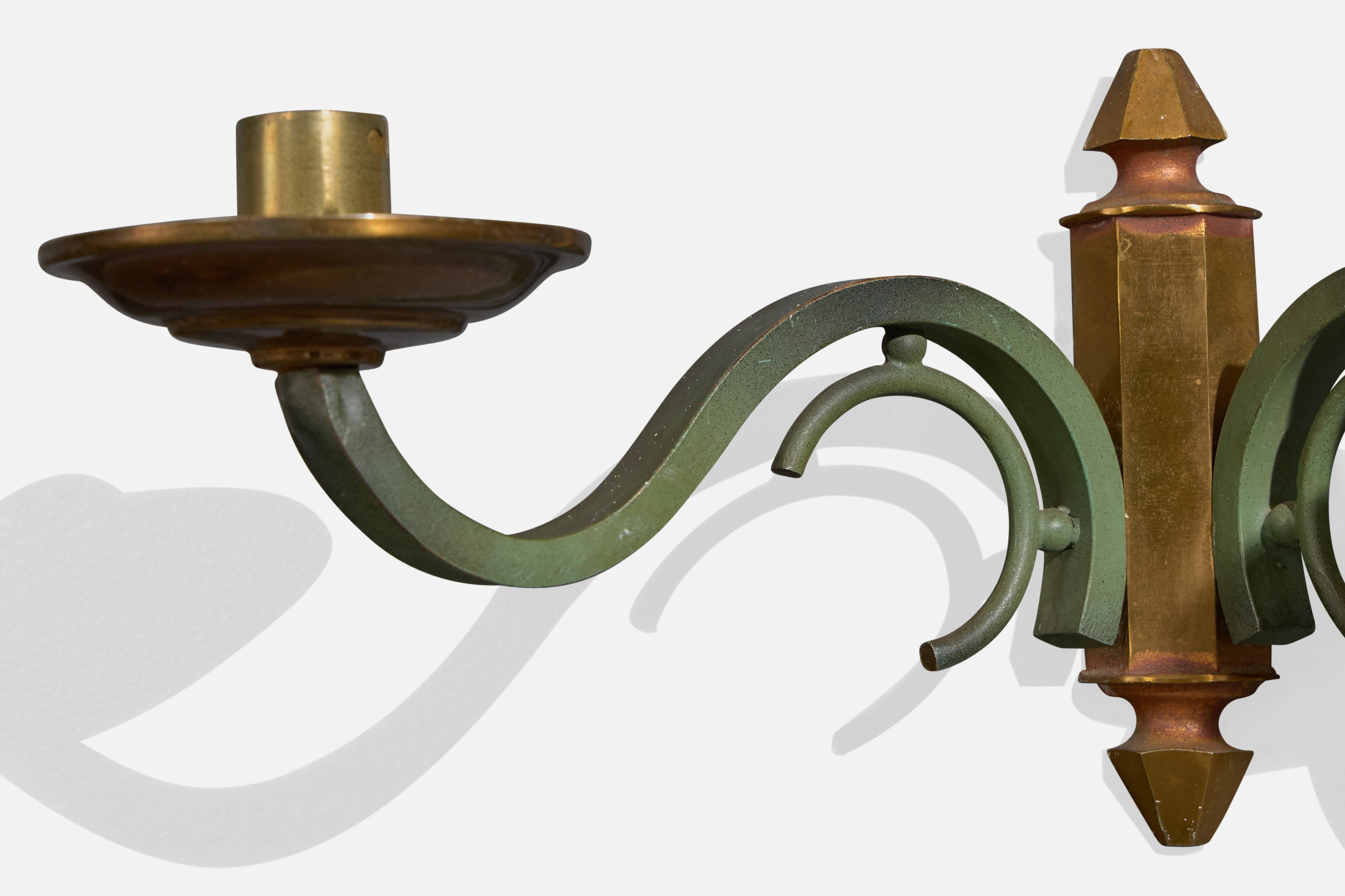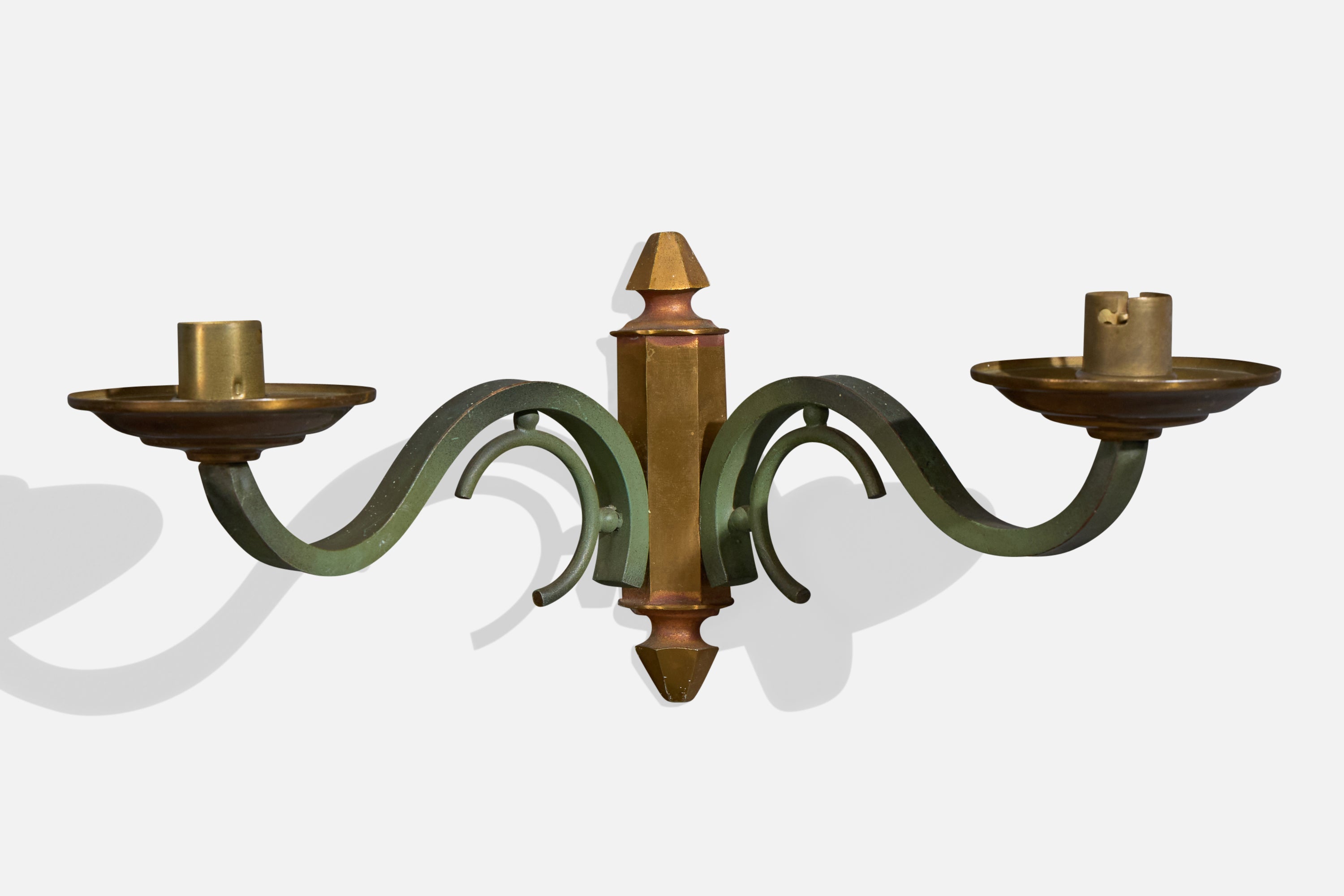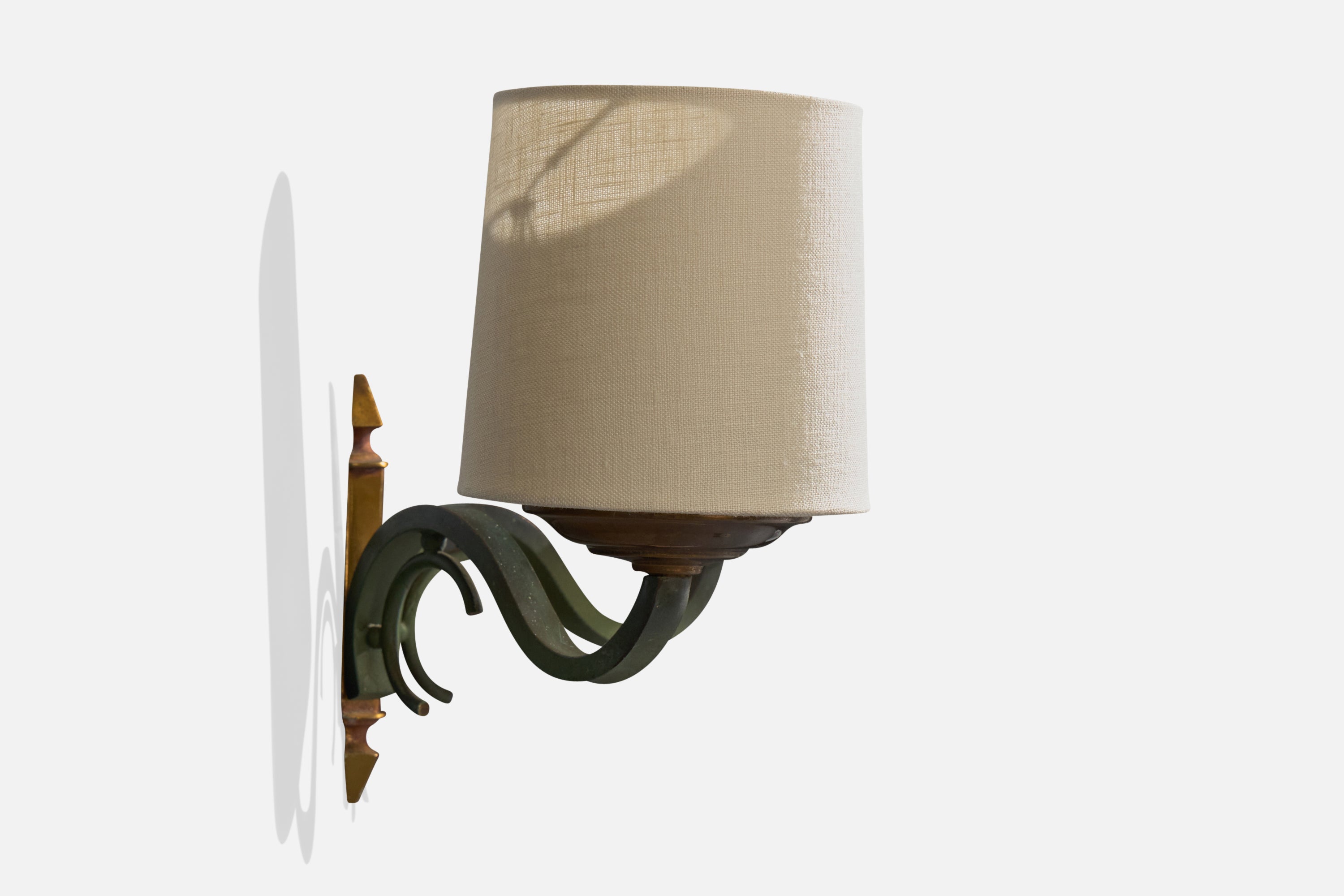 A pair of brass, green-lacquered metal and white fabric wall lights designed and produced in France, c. 1940s.