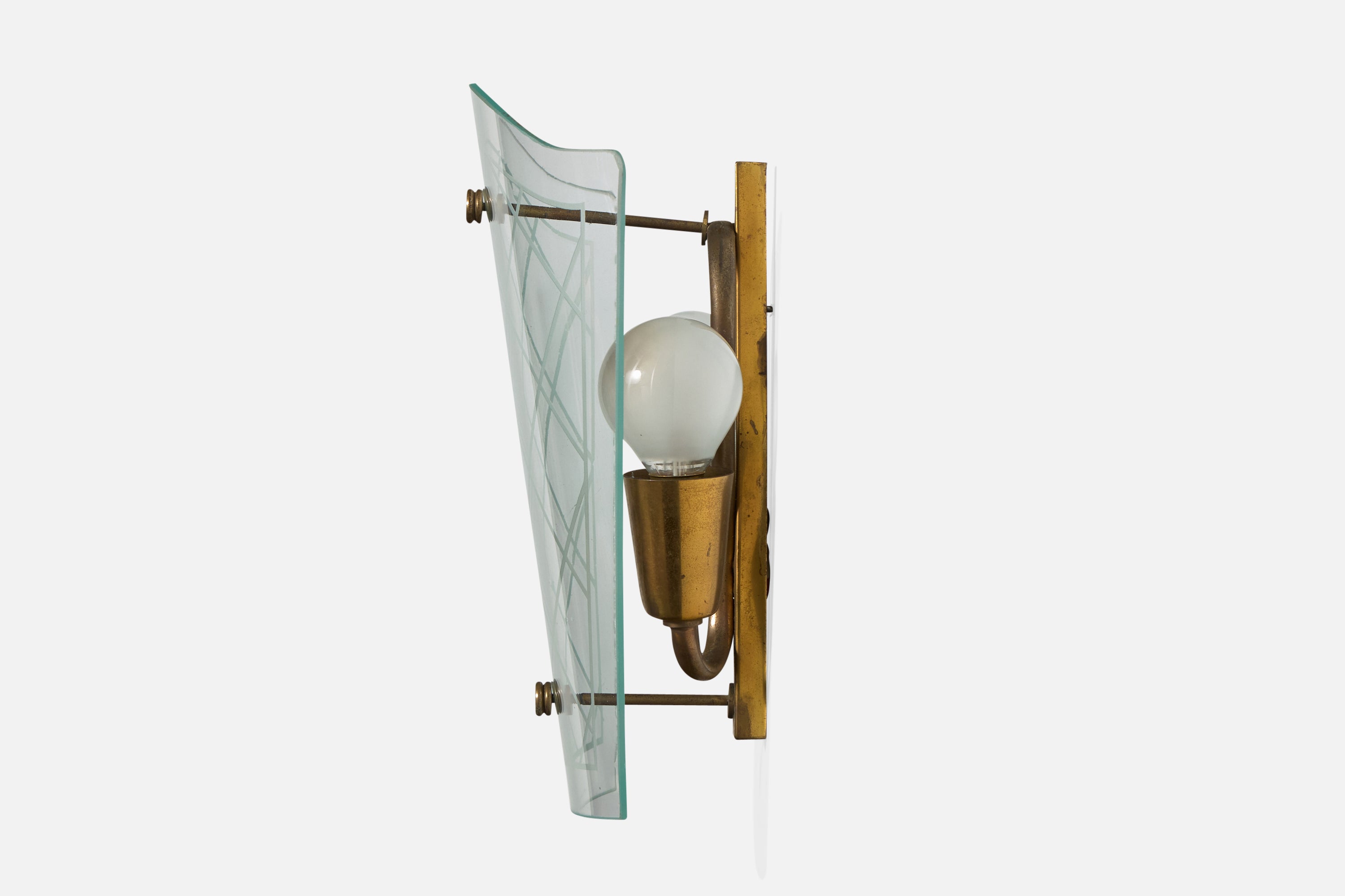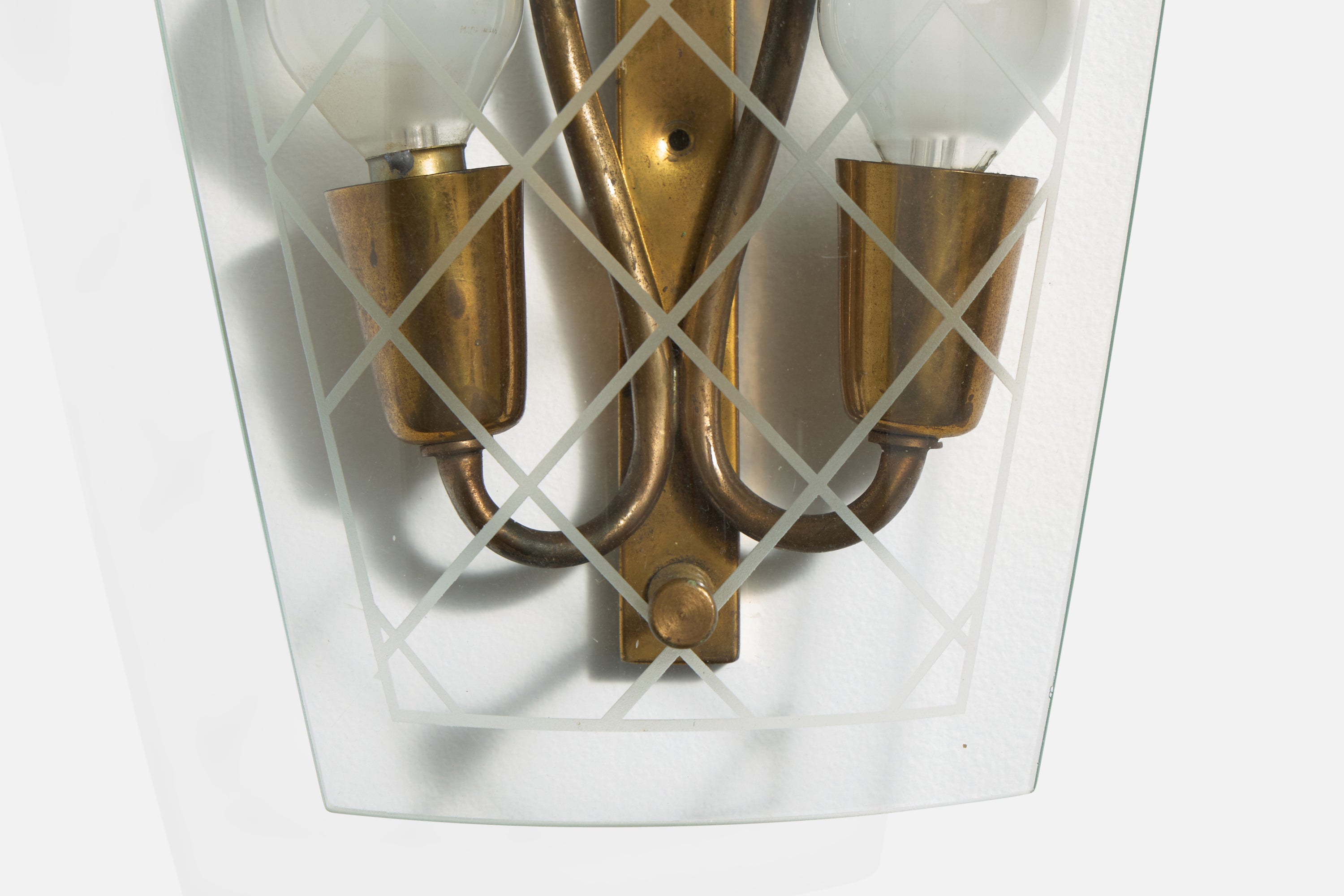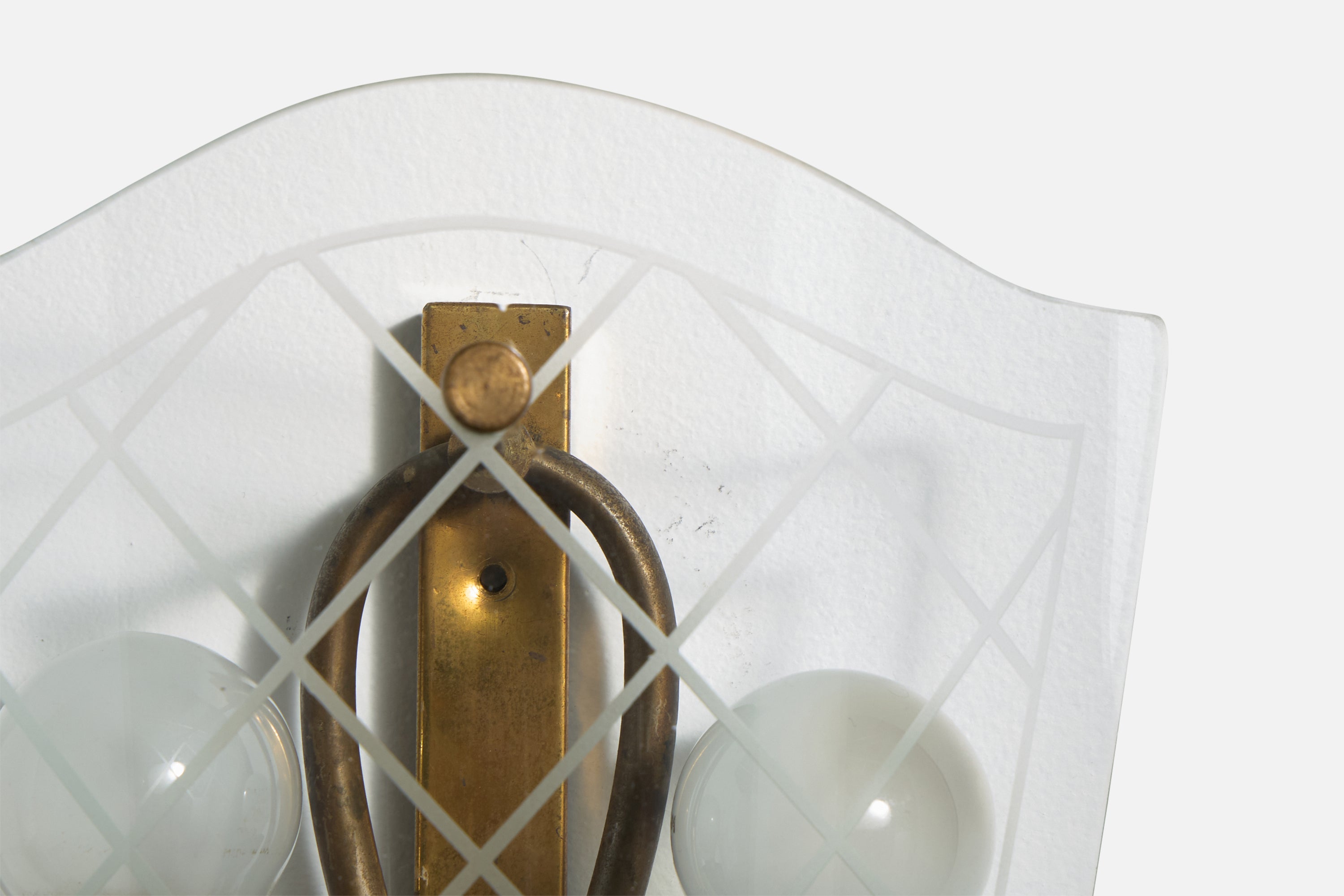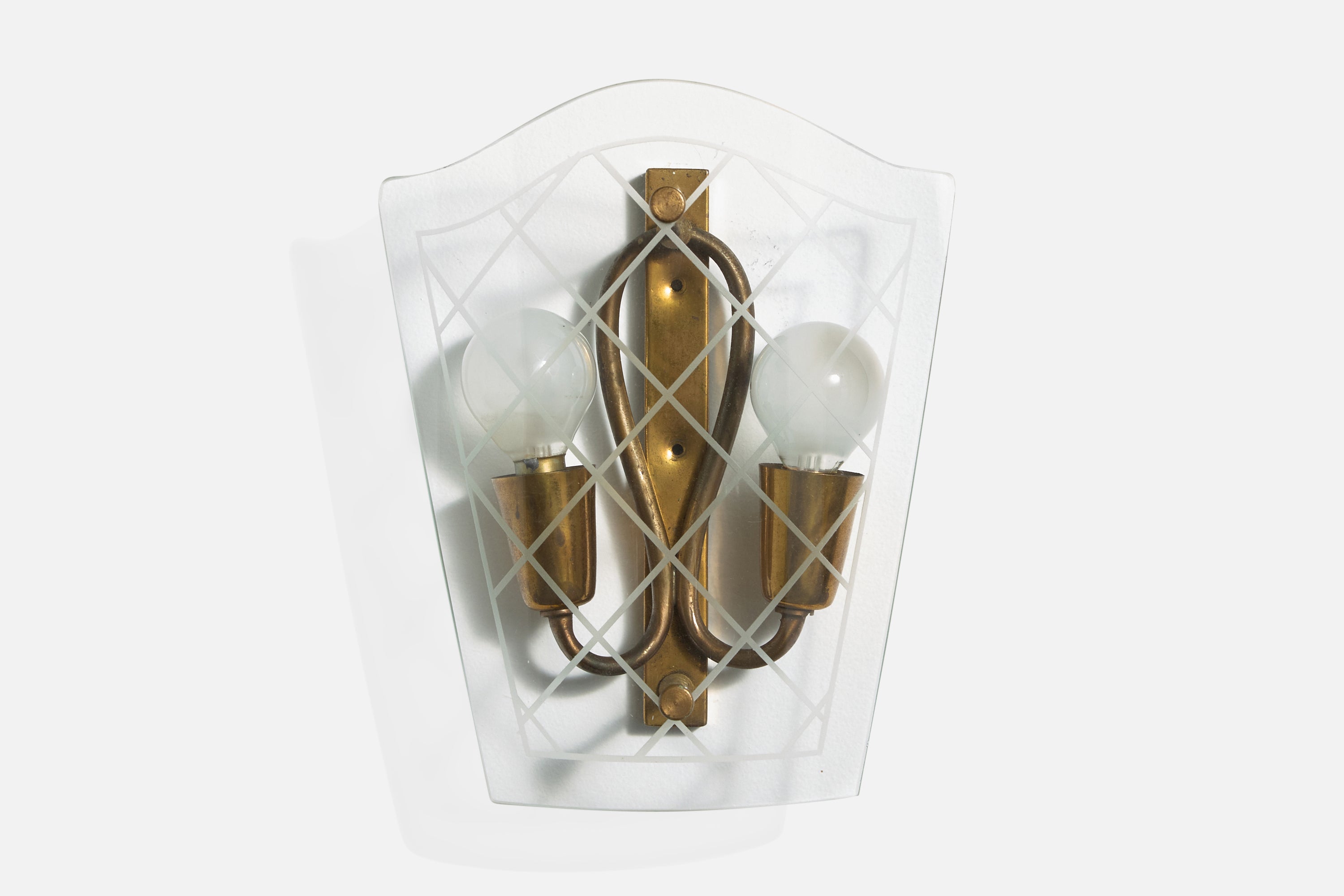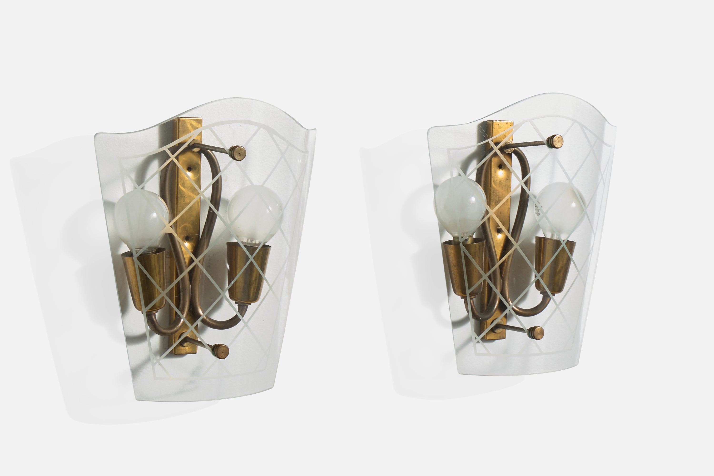 A pair of brass and etched glass wall lights designed and produced in Italy, c. 1940s.