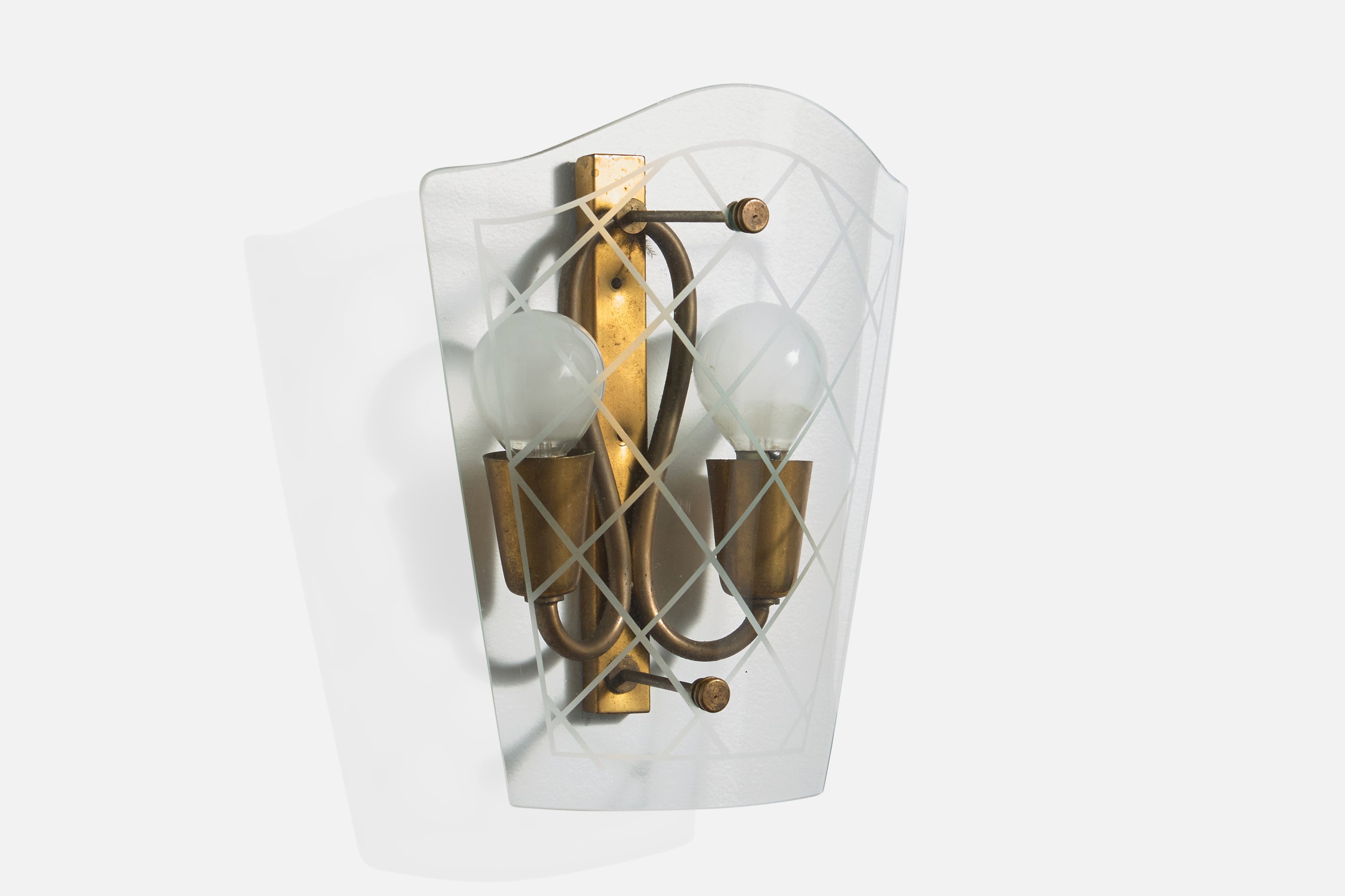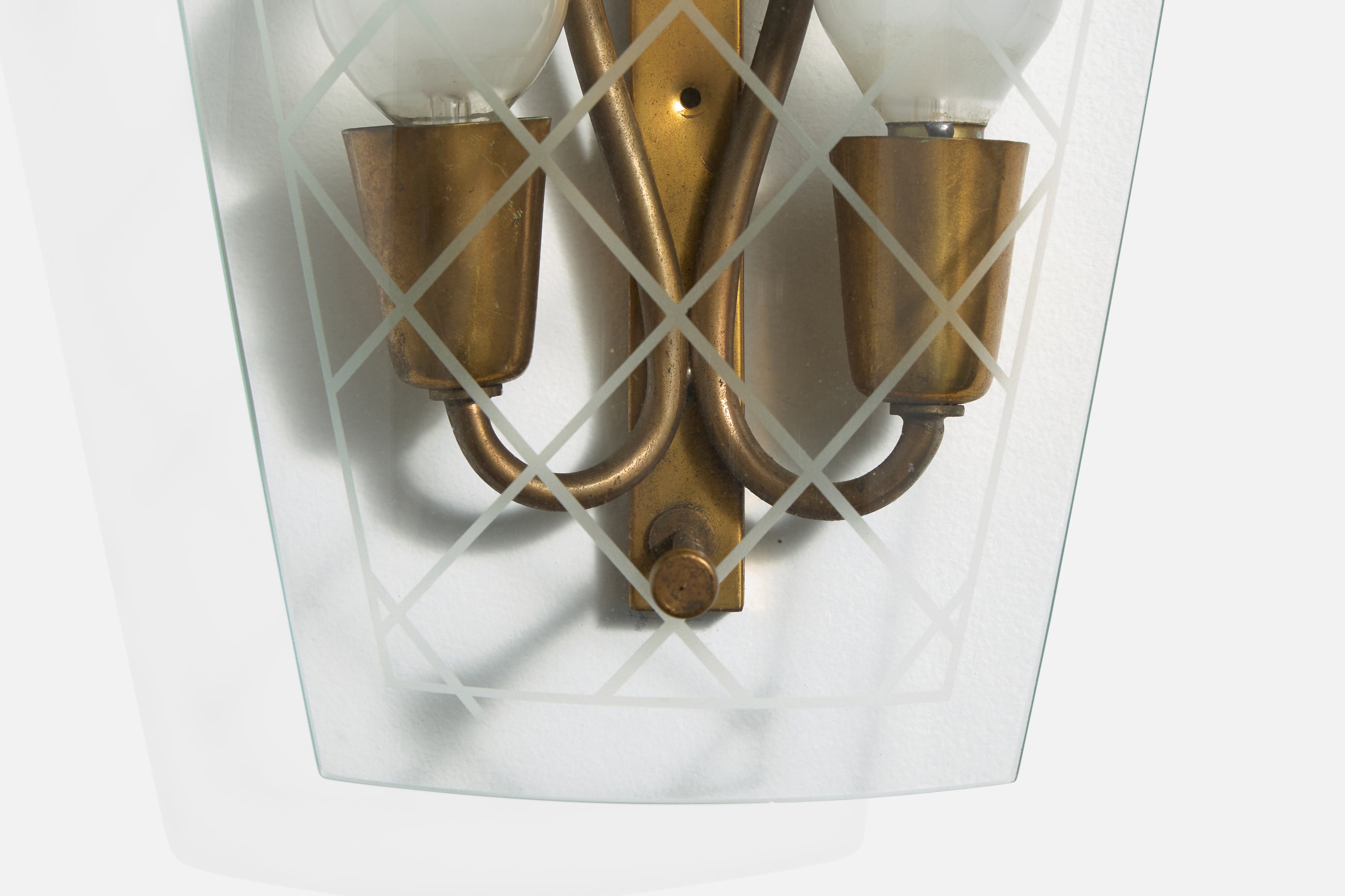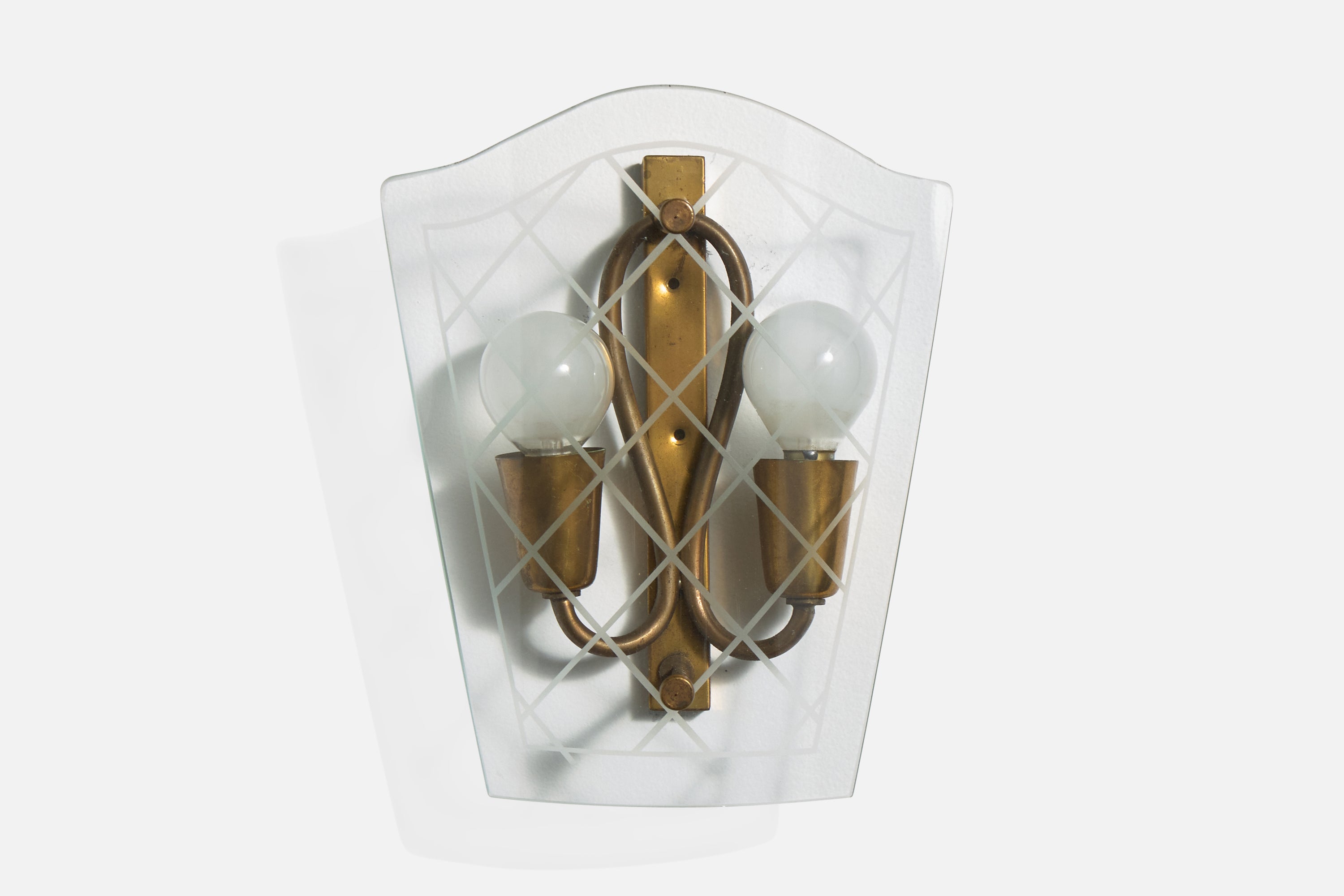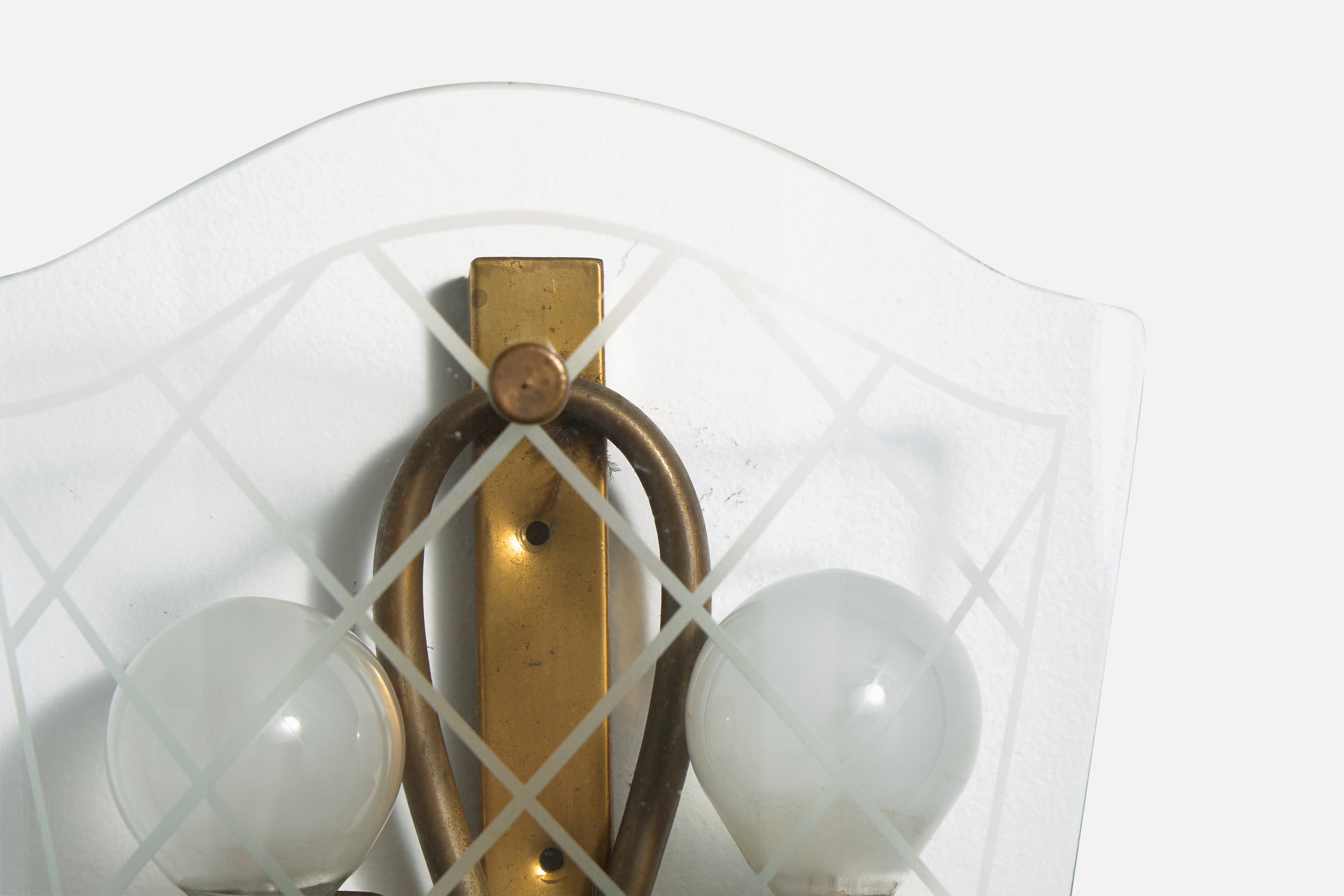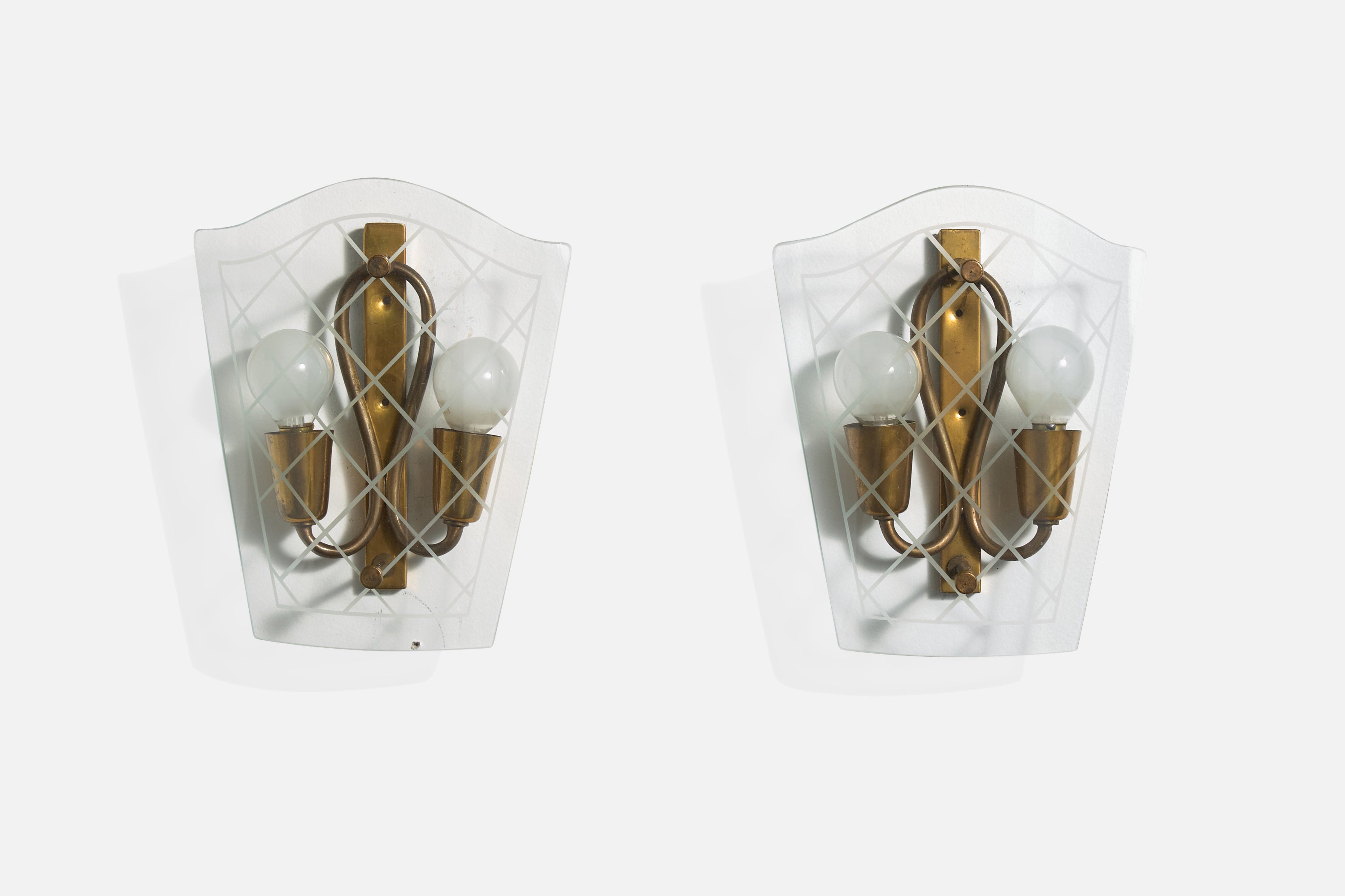 A pair of brass and etched glass wall lights designed and produced in Italy, c. 1940s.
