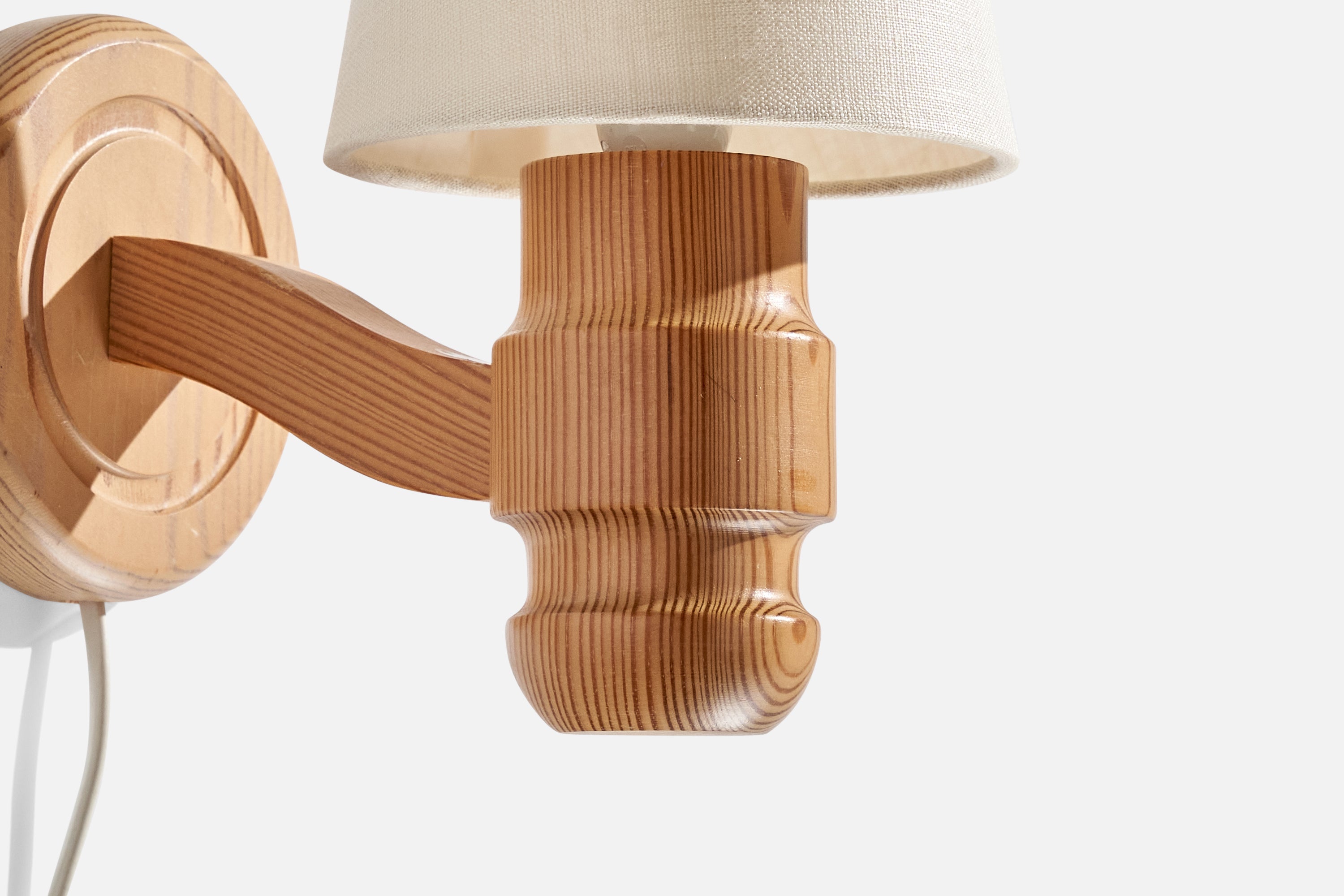 A pair of pine and white fabric wall lights produced by Solbackens Svarveri, Sweden, c. 1970s.