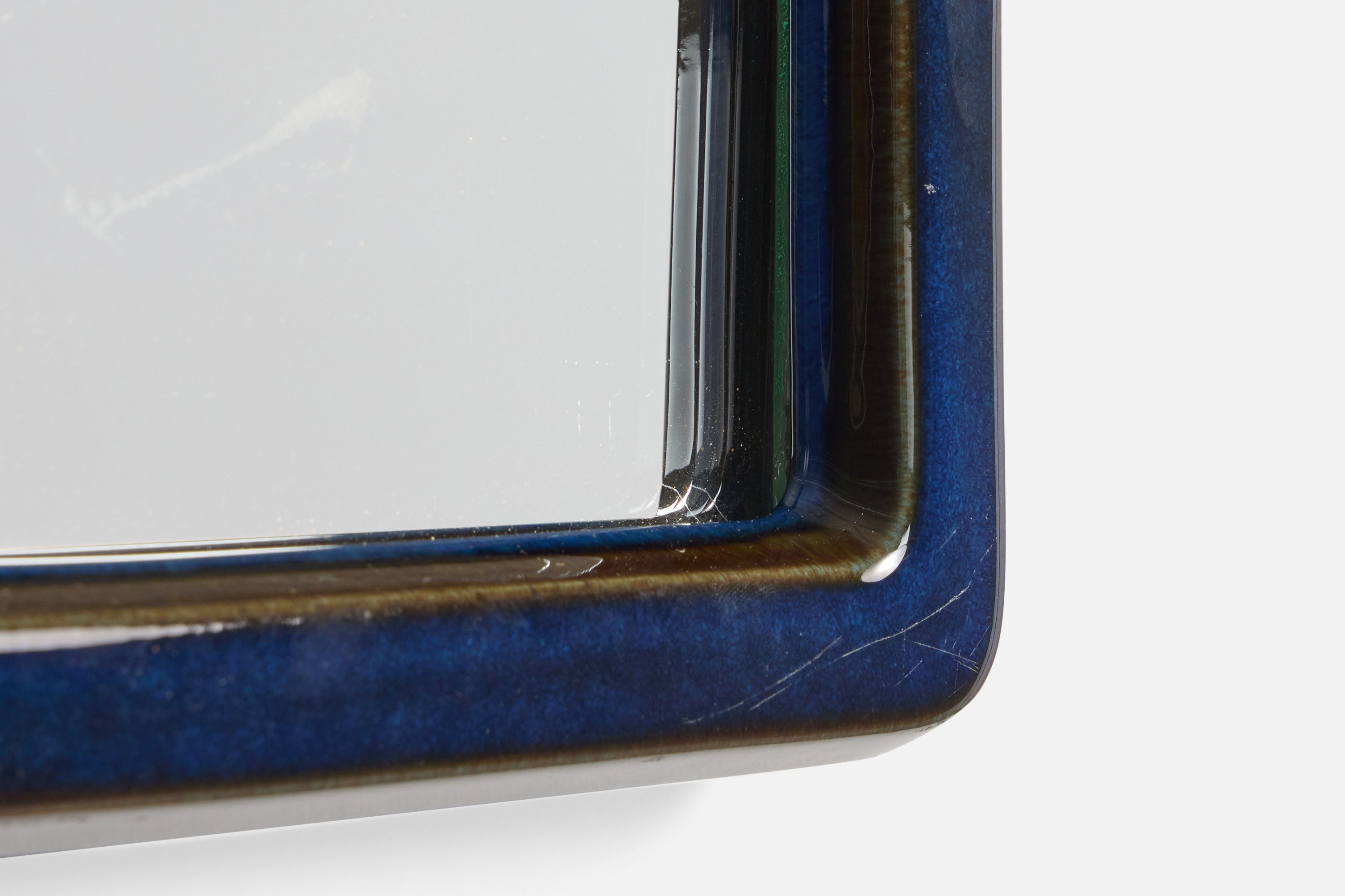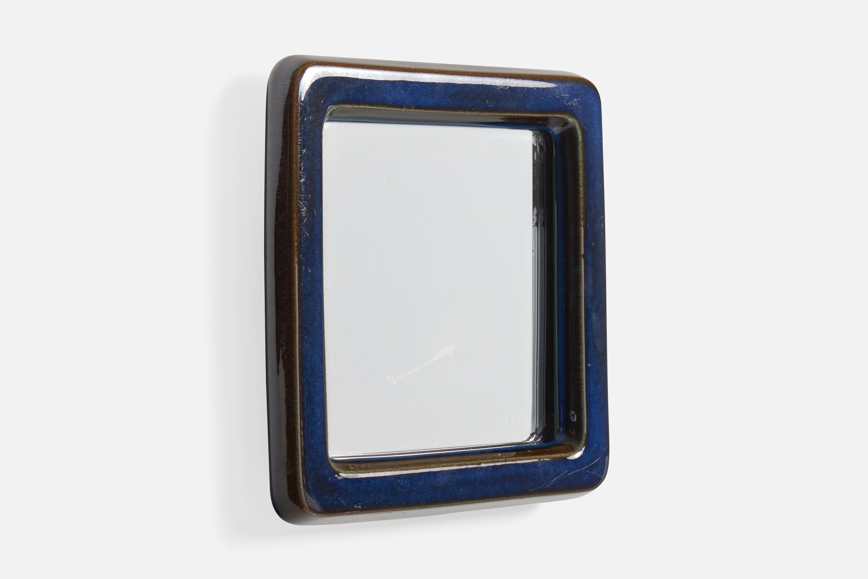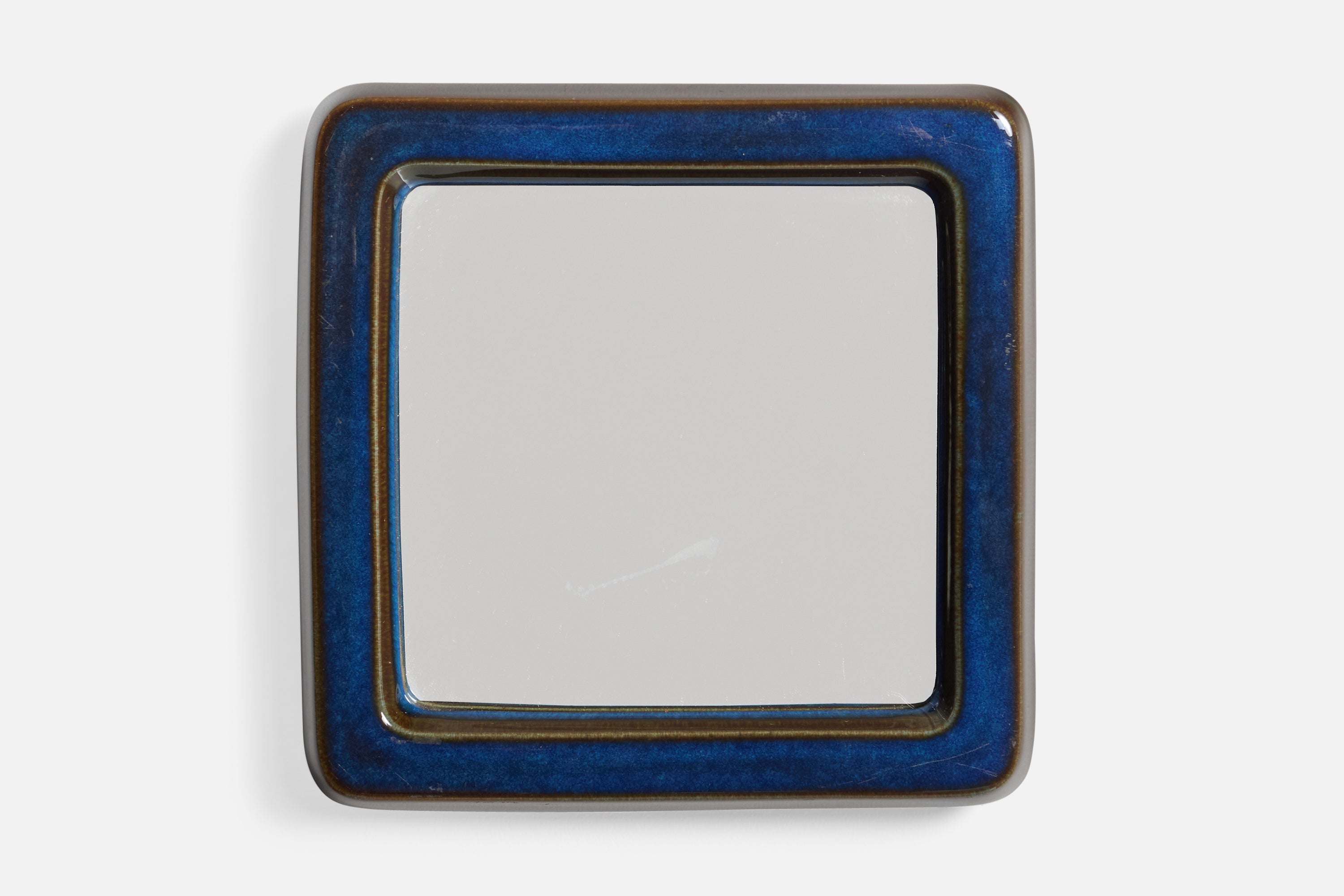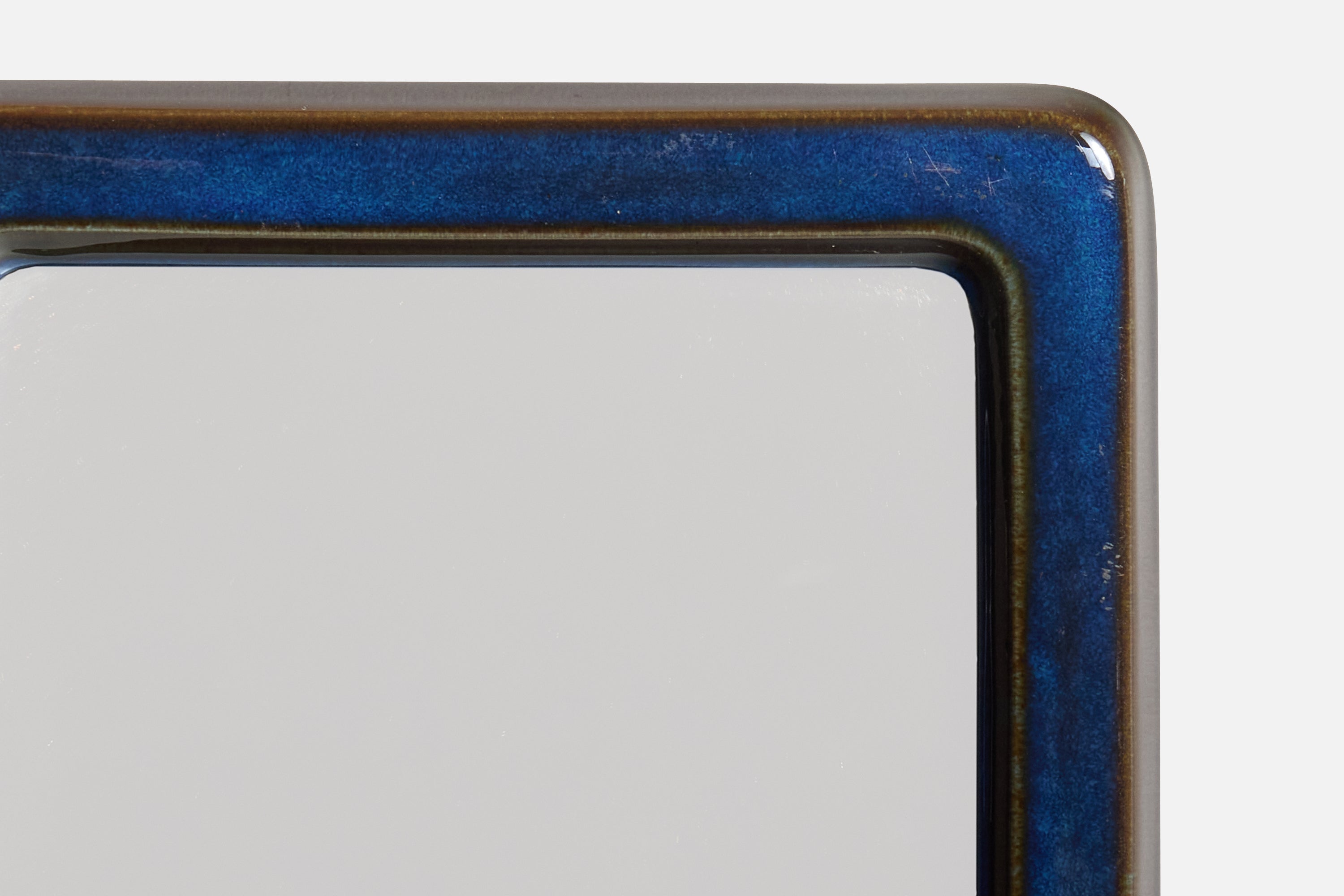 A blue-glazed stoneware wall mirror designed by Sven Jonson and produced by Gustavsberg, Sweden, c. 1960s.