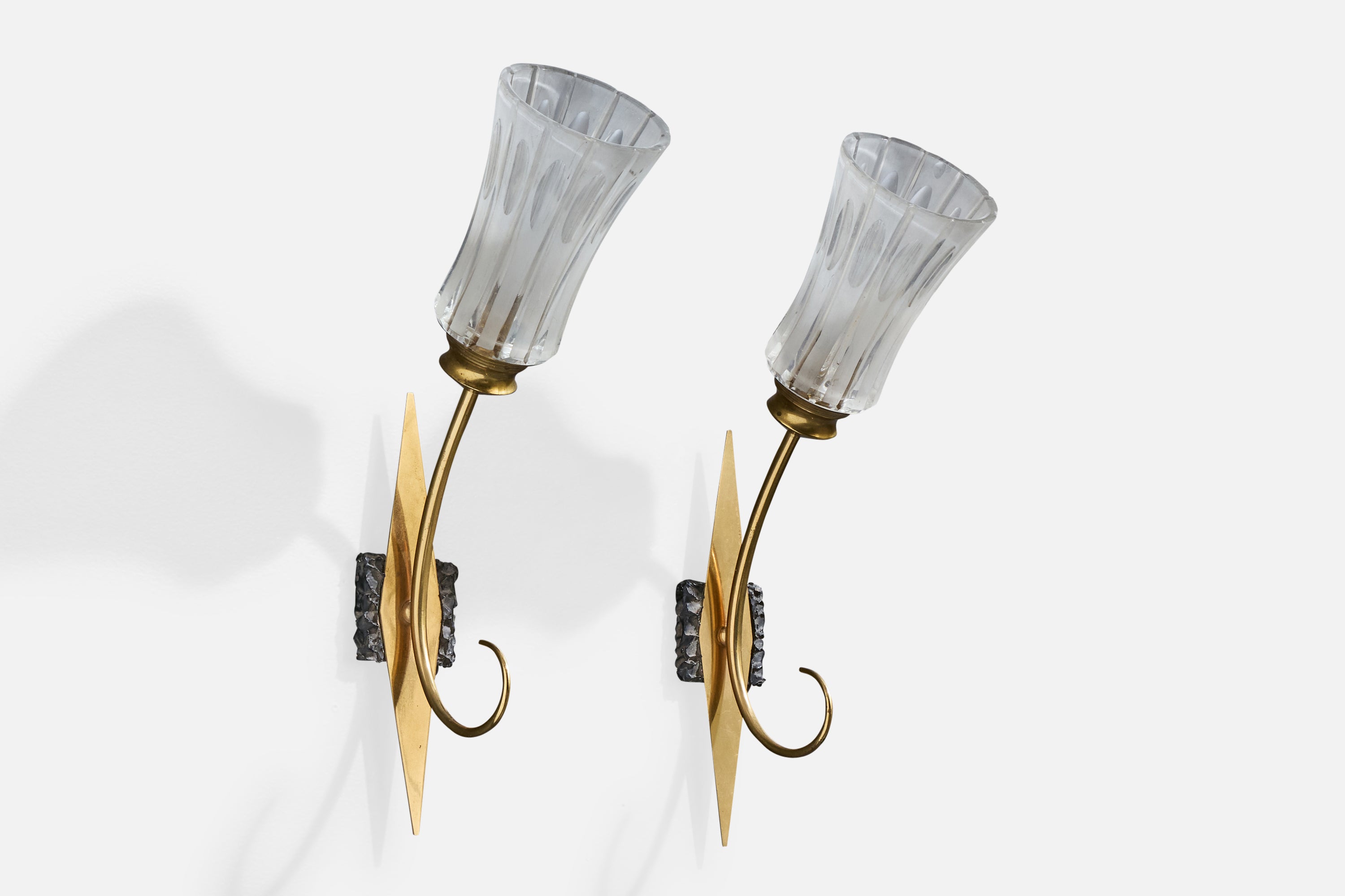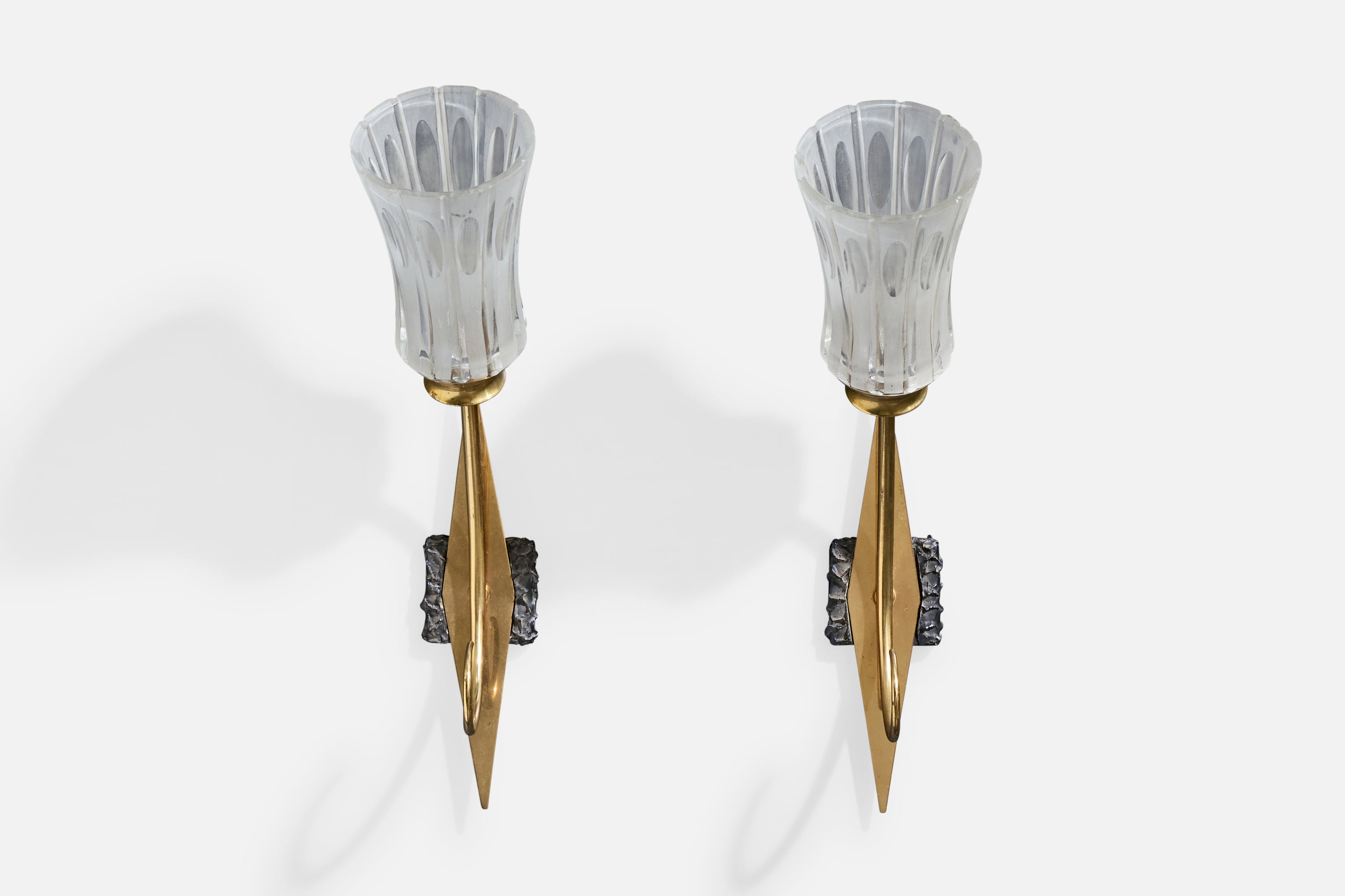 A pair of brass, glass and black-painted metal wall lights designed and produced in Italy, c. 1950s.