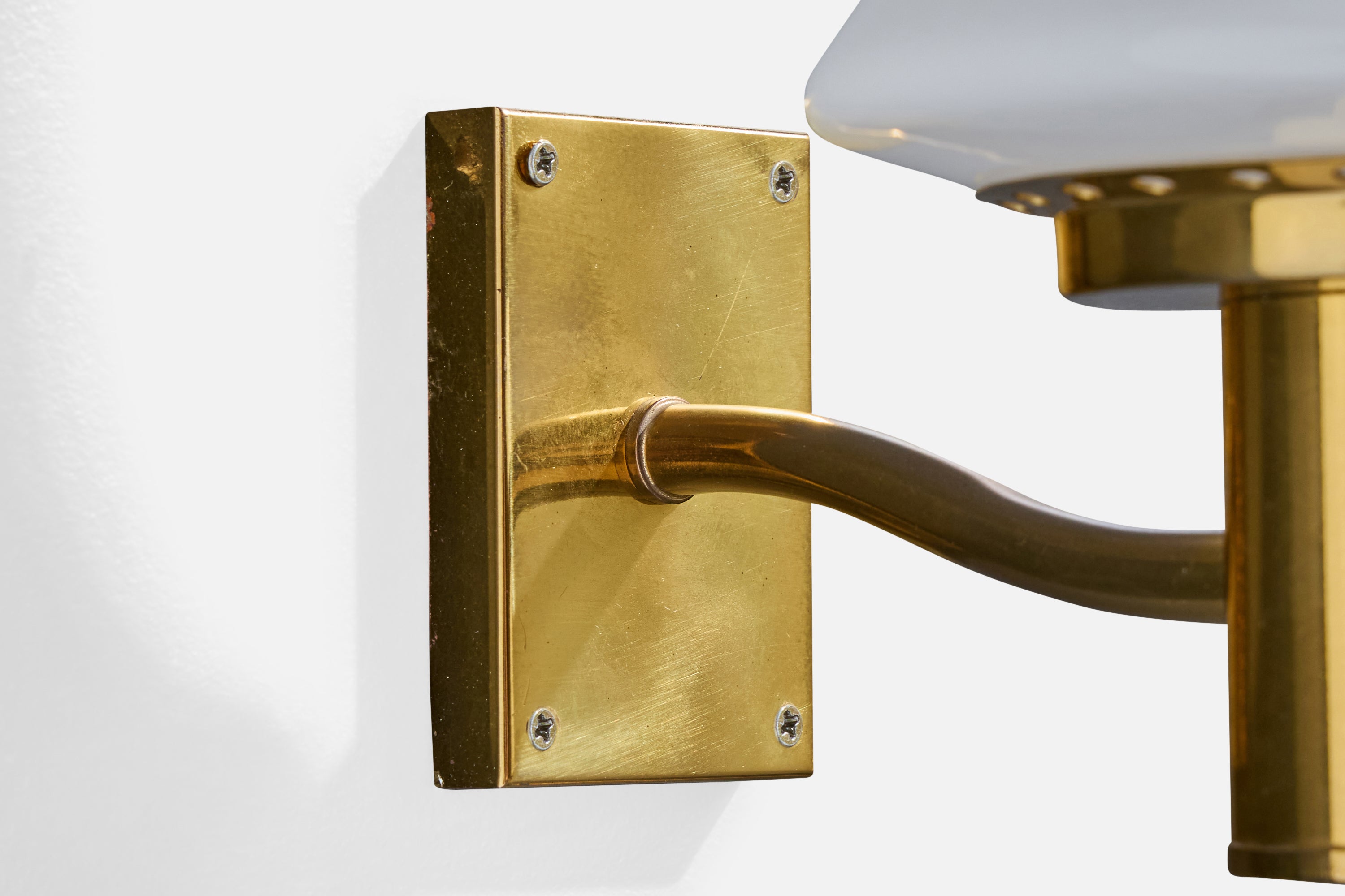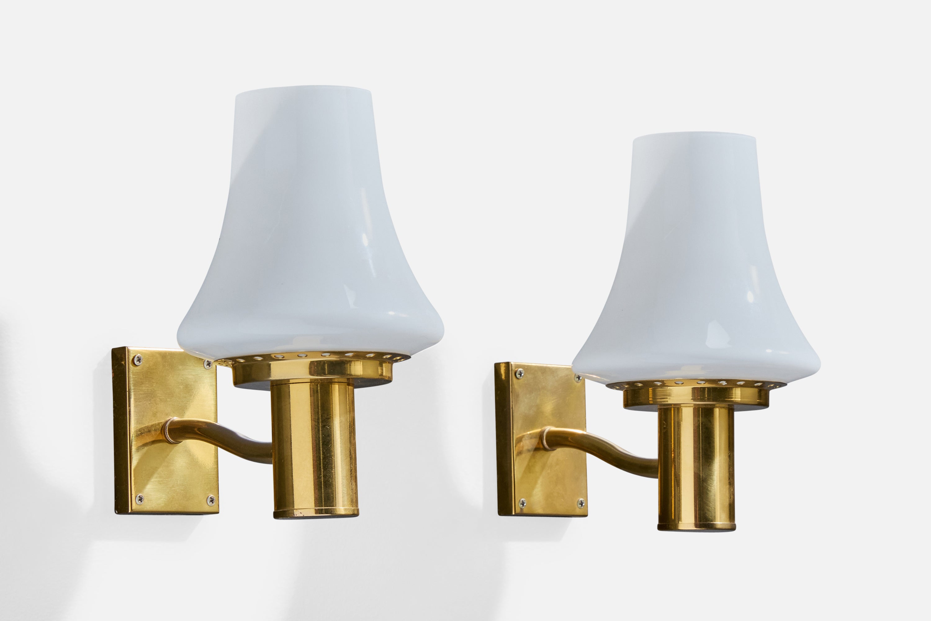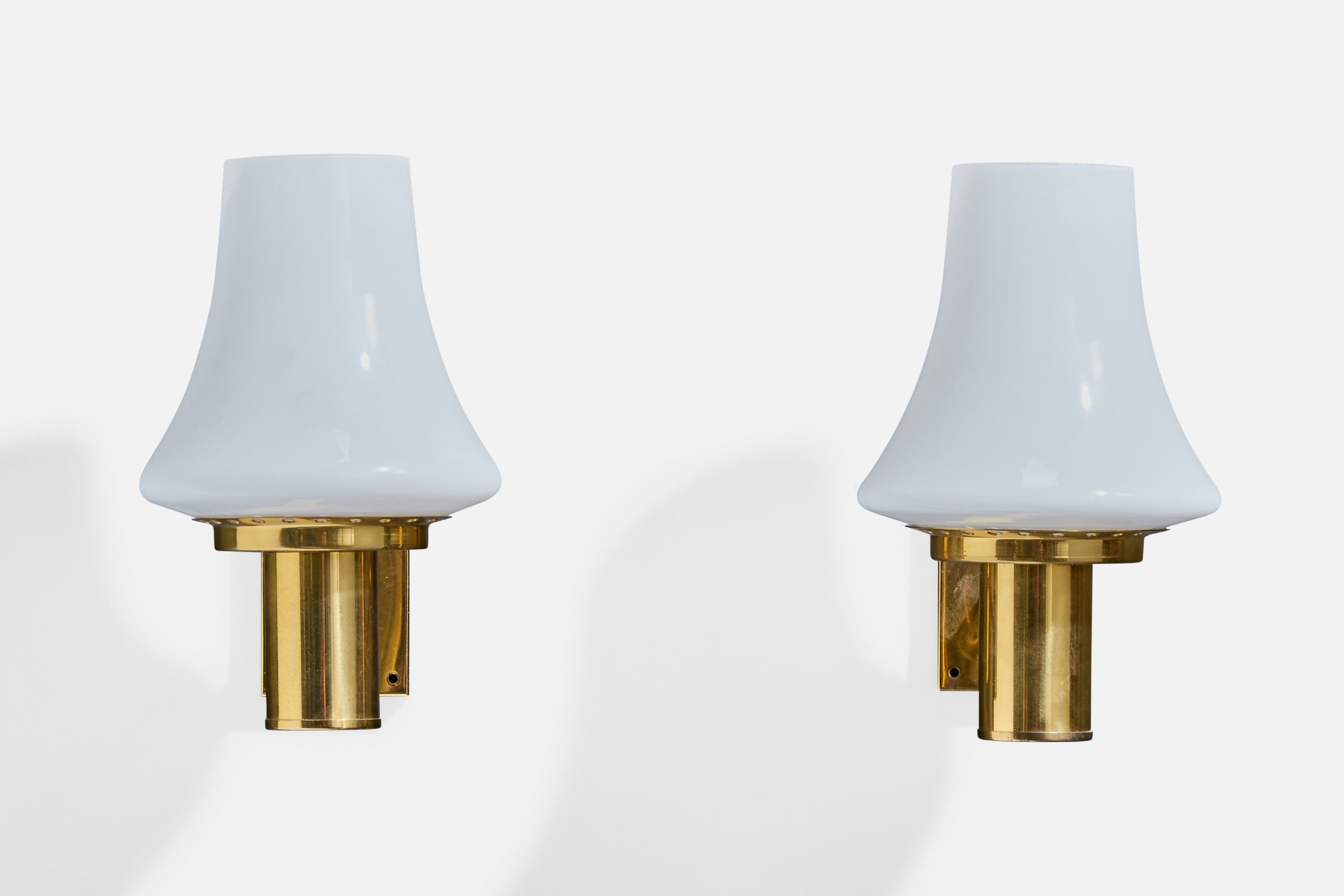 A pair of brass and white opaline glass wall lights likely designed and produced in Sweden, c. 1960s.