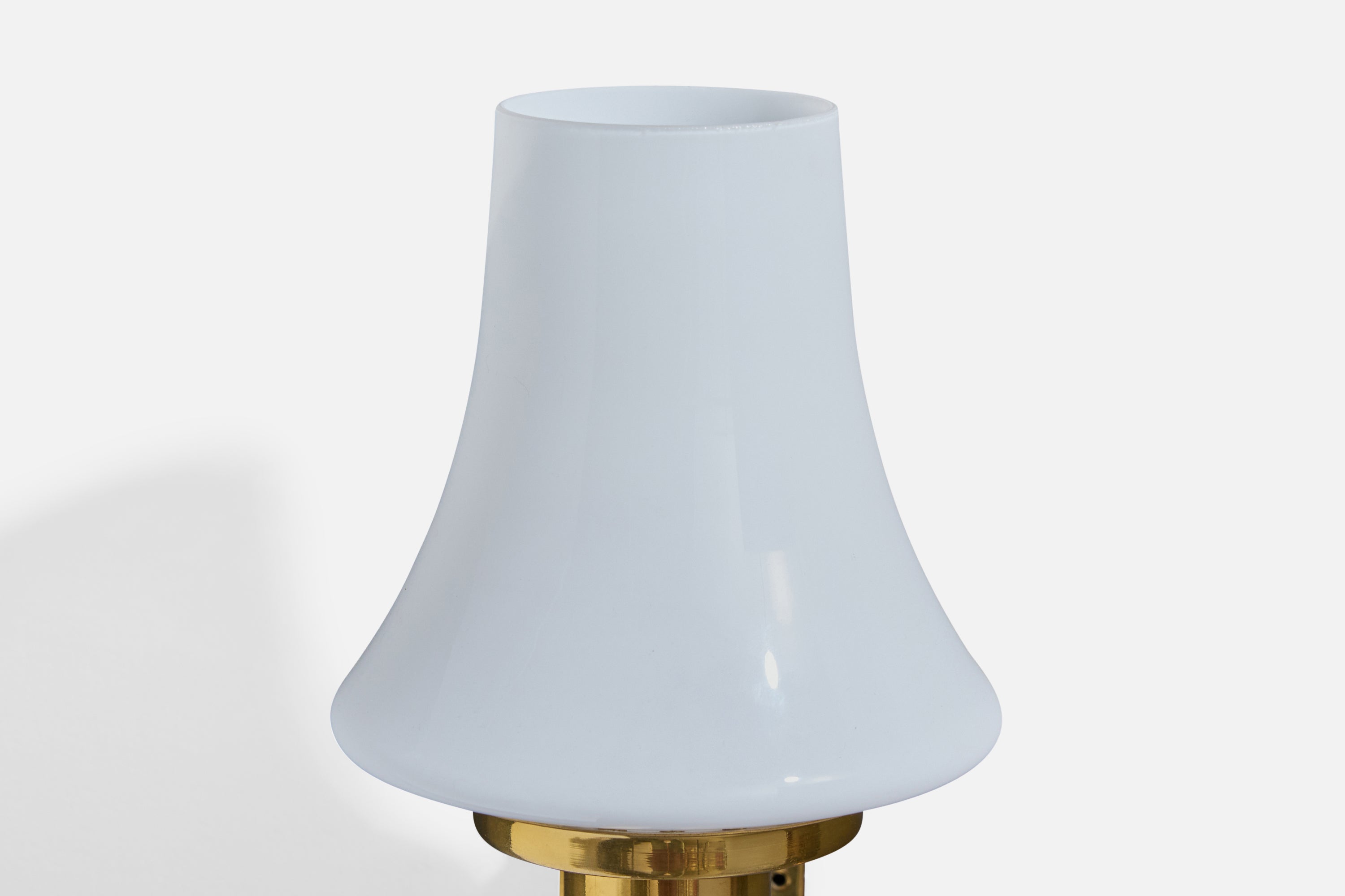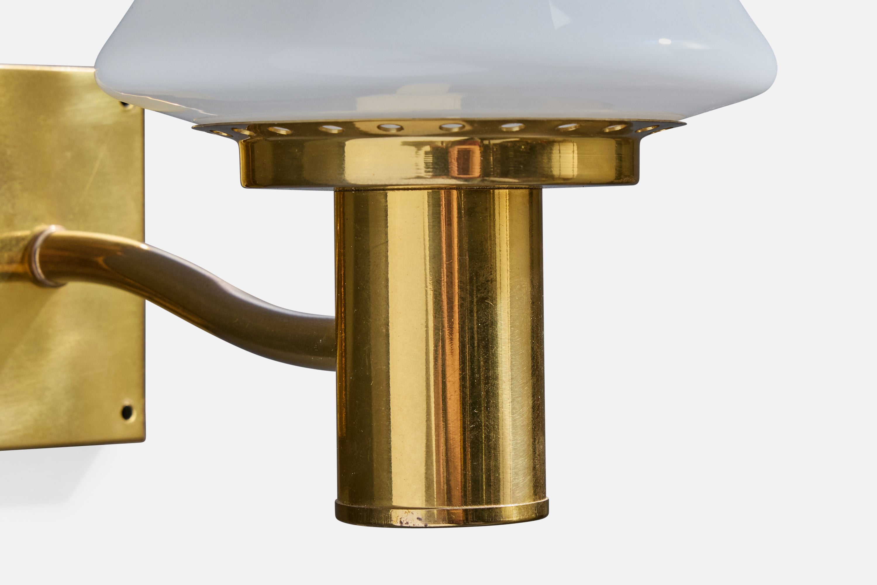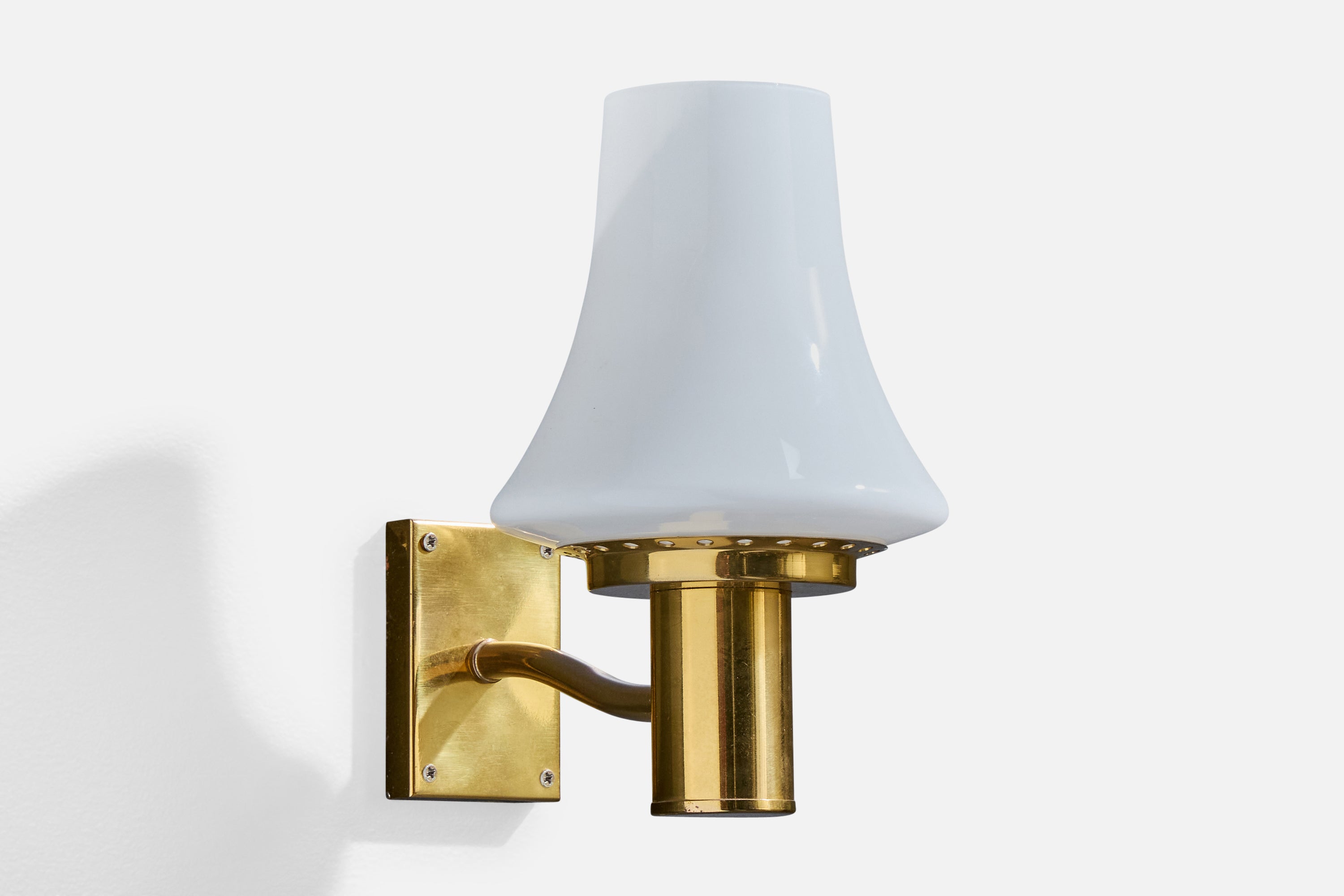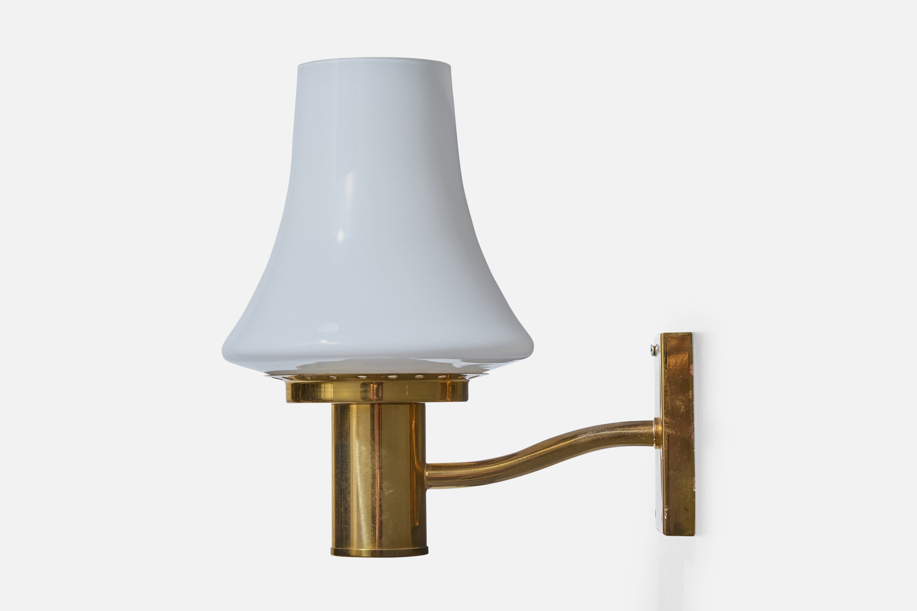 A pair of brass and white opaline glass wall lights likely designed and produced in Sweden, c. 1960s.