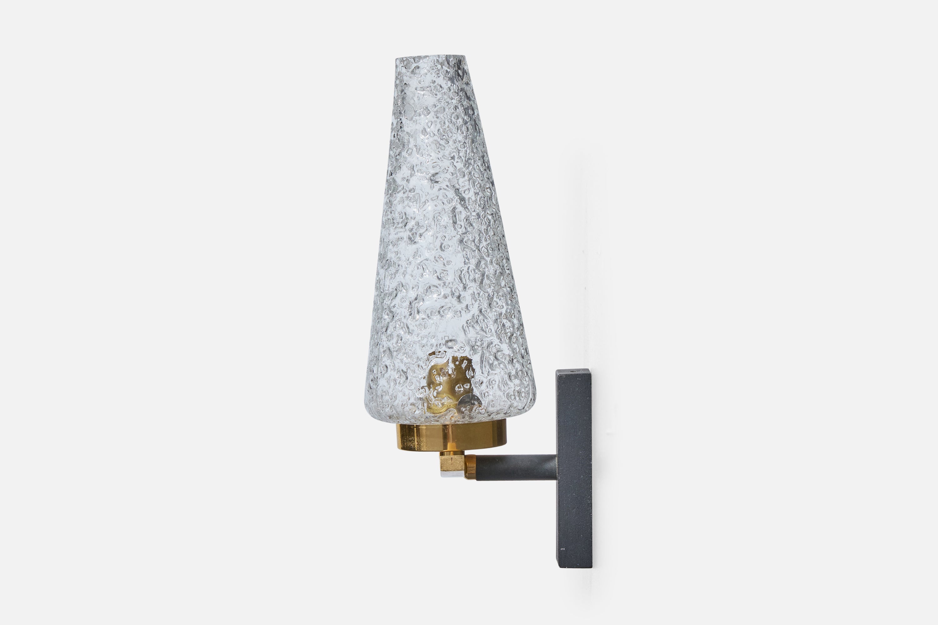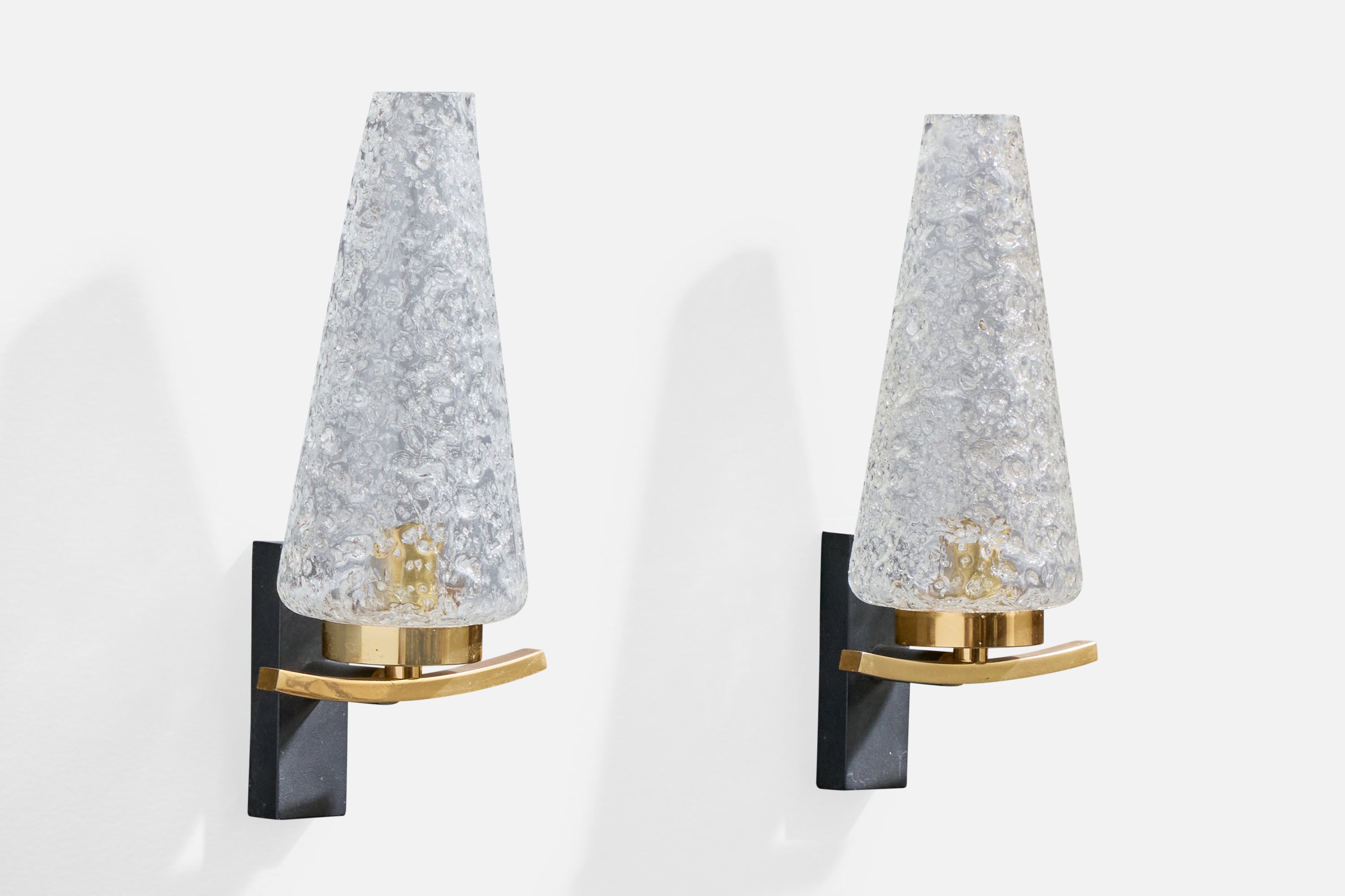 A pair of brass, black-lacquered metal and frosted glass wall lights designed and produced in France, c. 1950s.