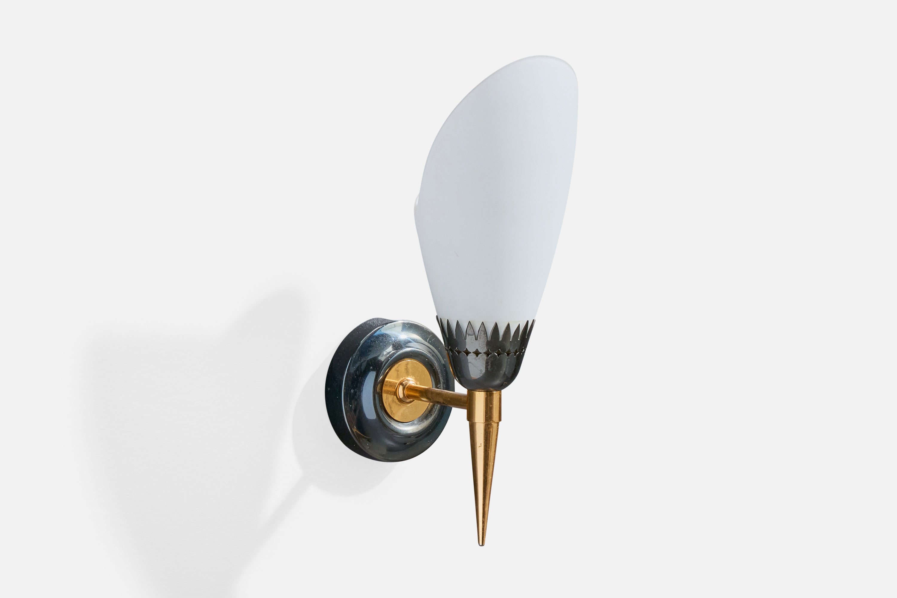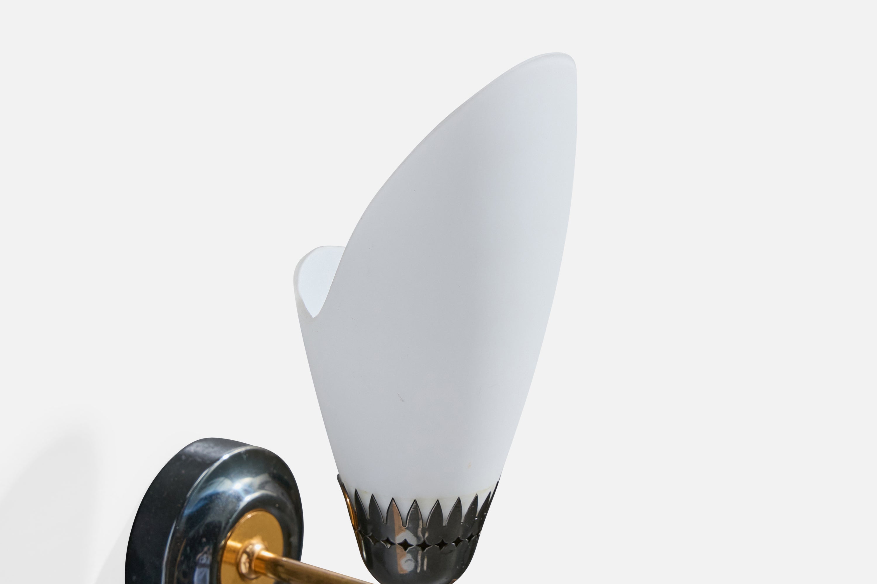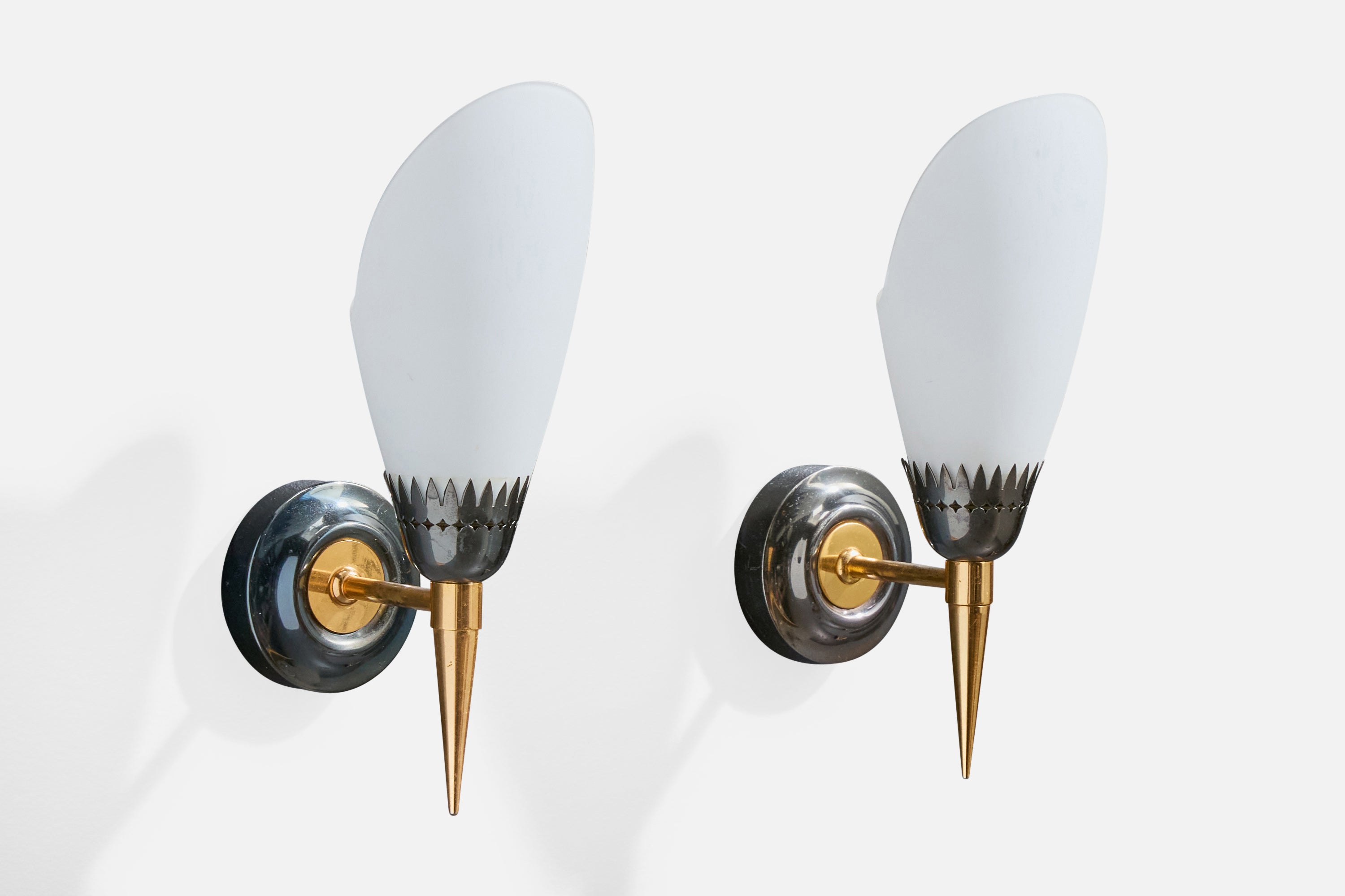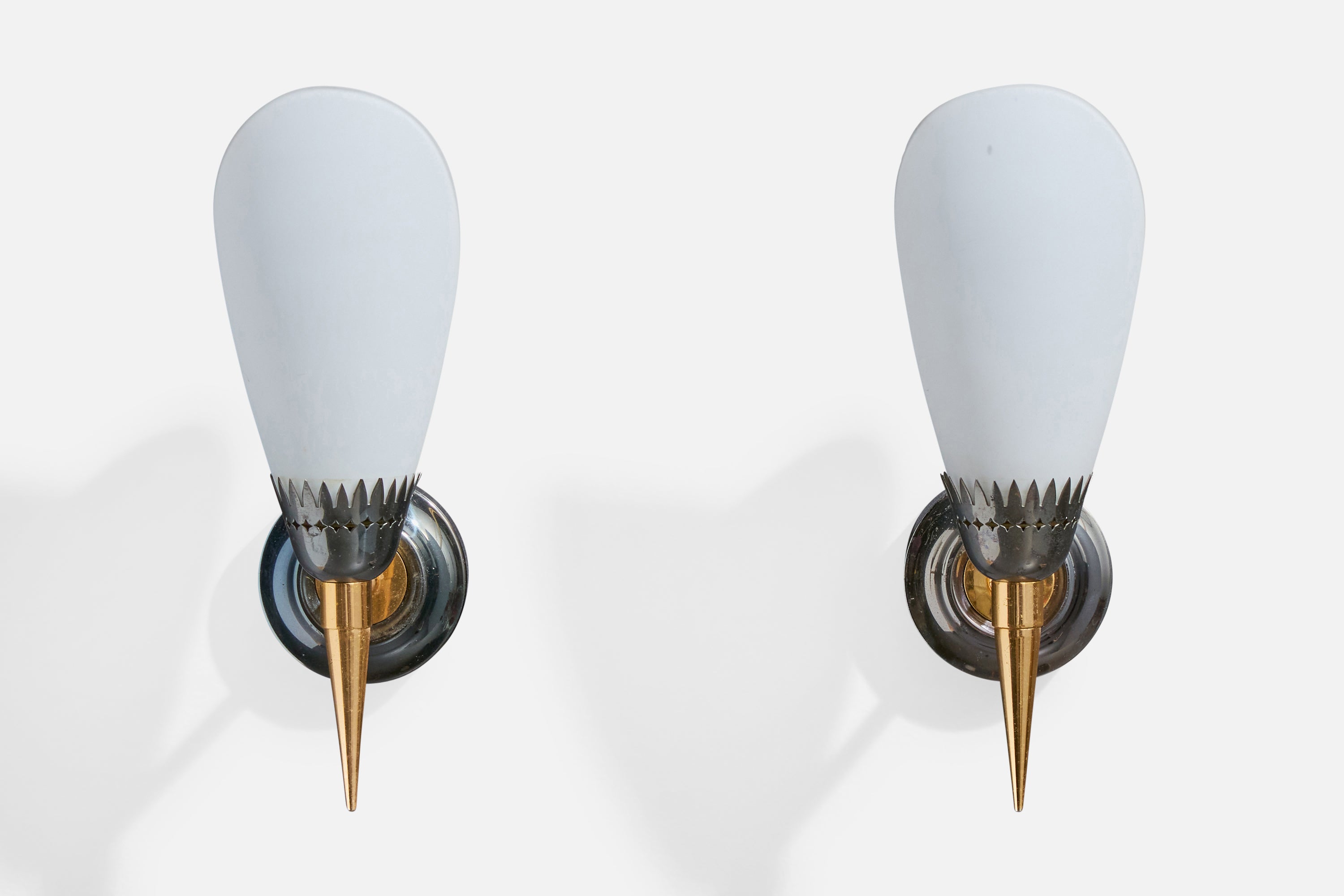 A pair of brass, metal and white opaline glass wall lights designed and produced in France, c. 1950s.