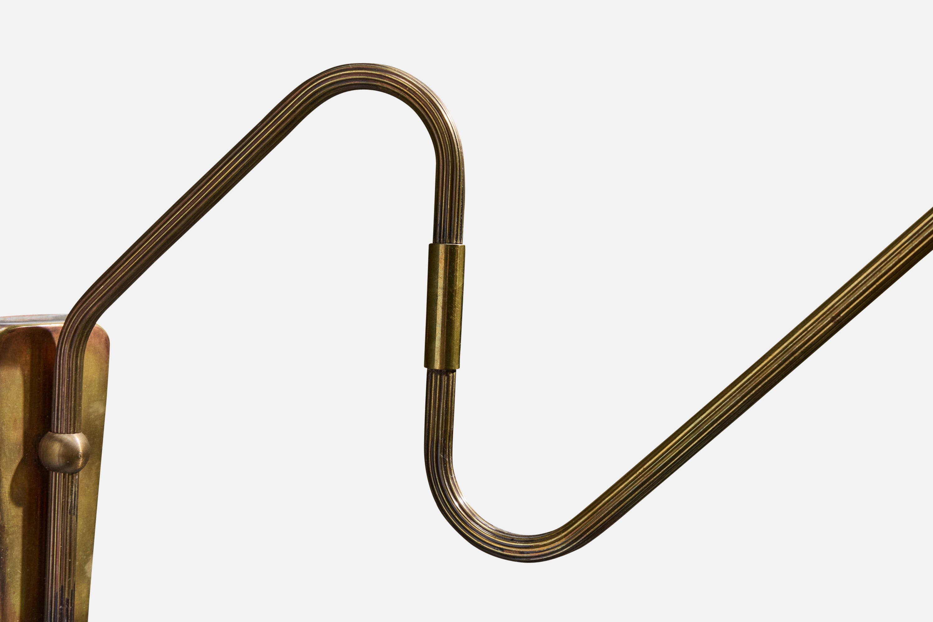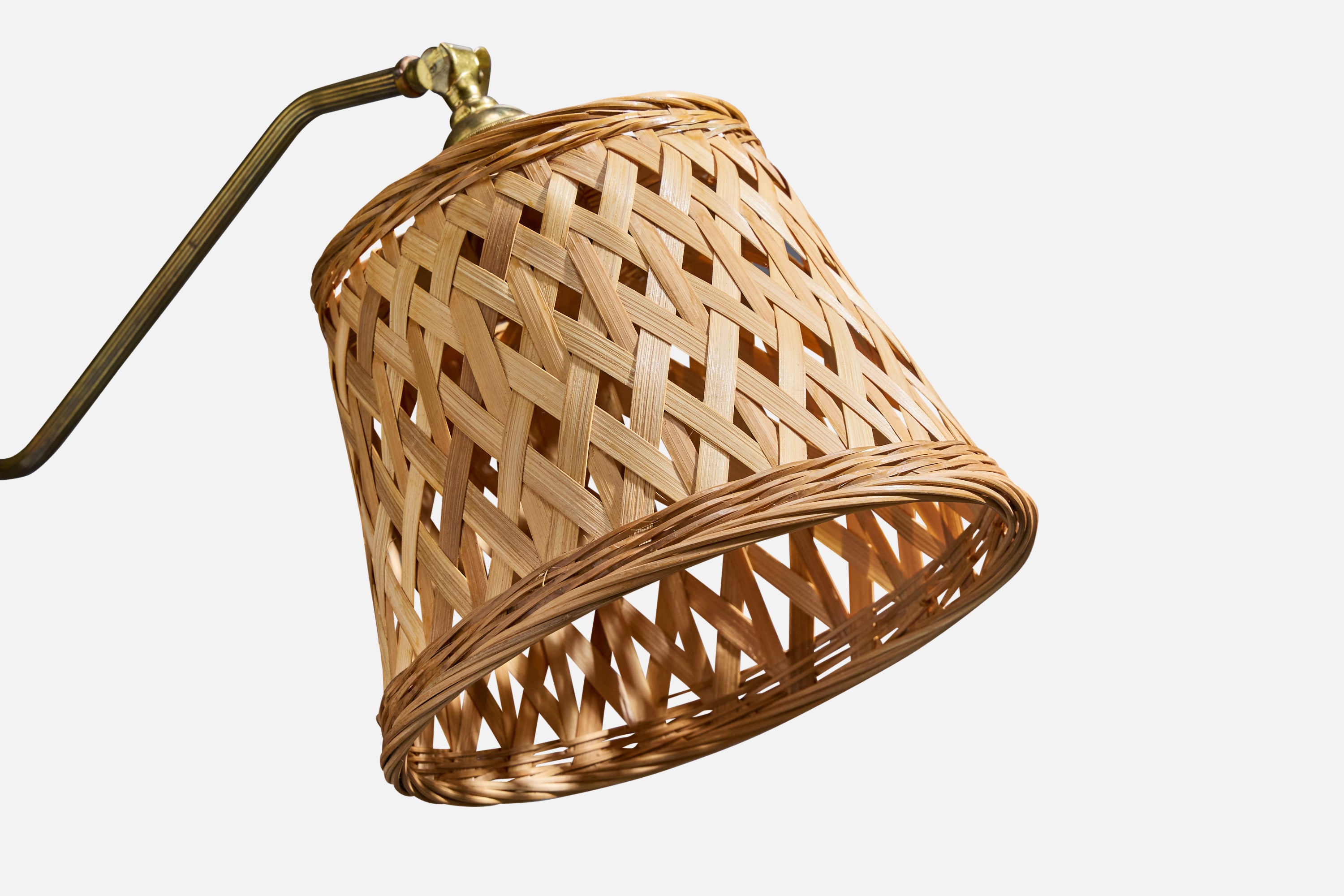 An adjustable brass and rattan wall light designed and produced in Denmark, c. 1950s.