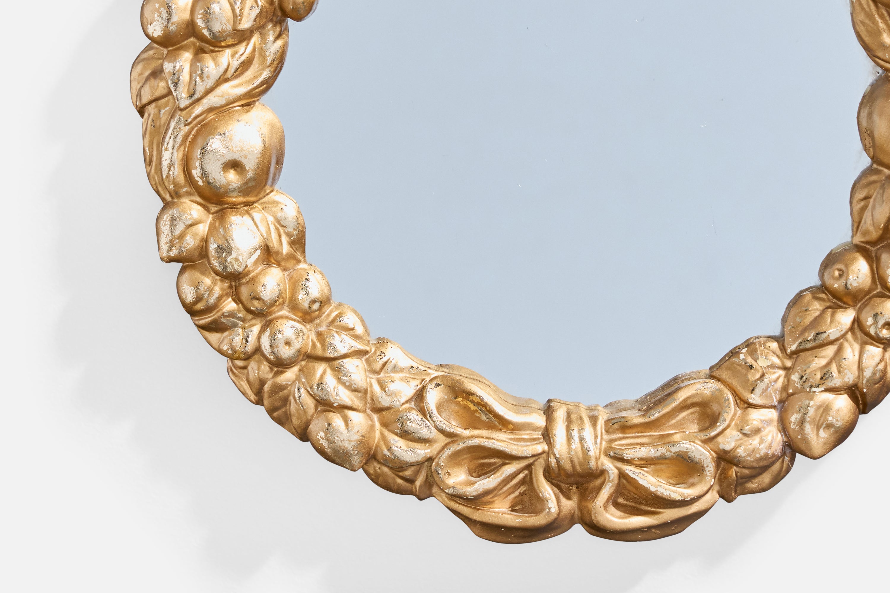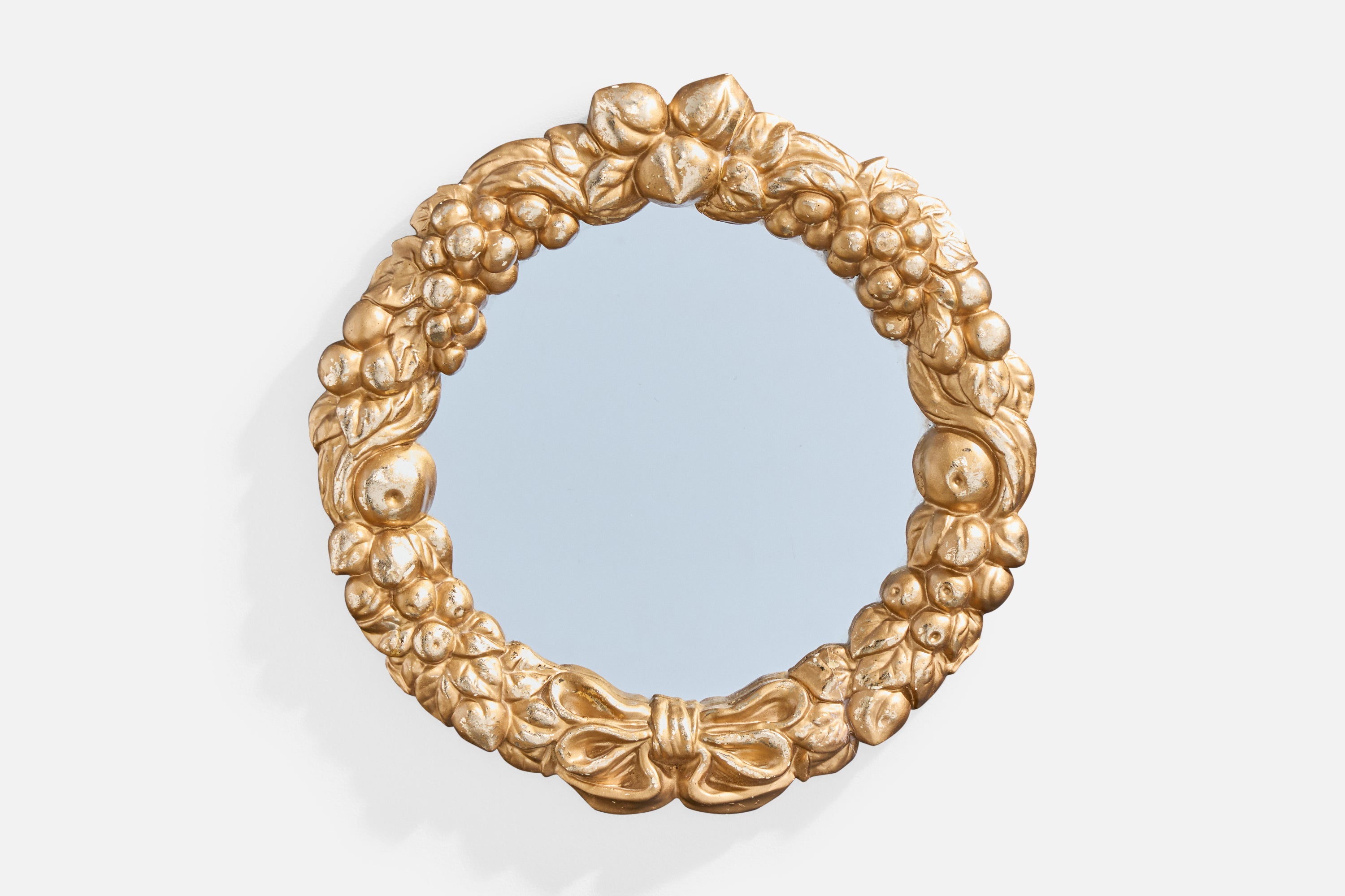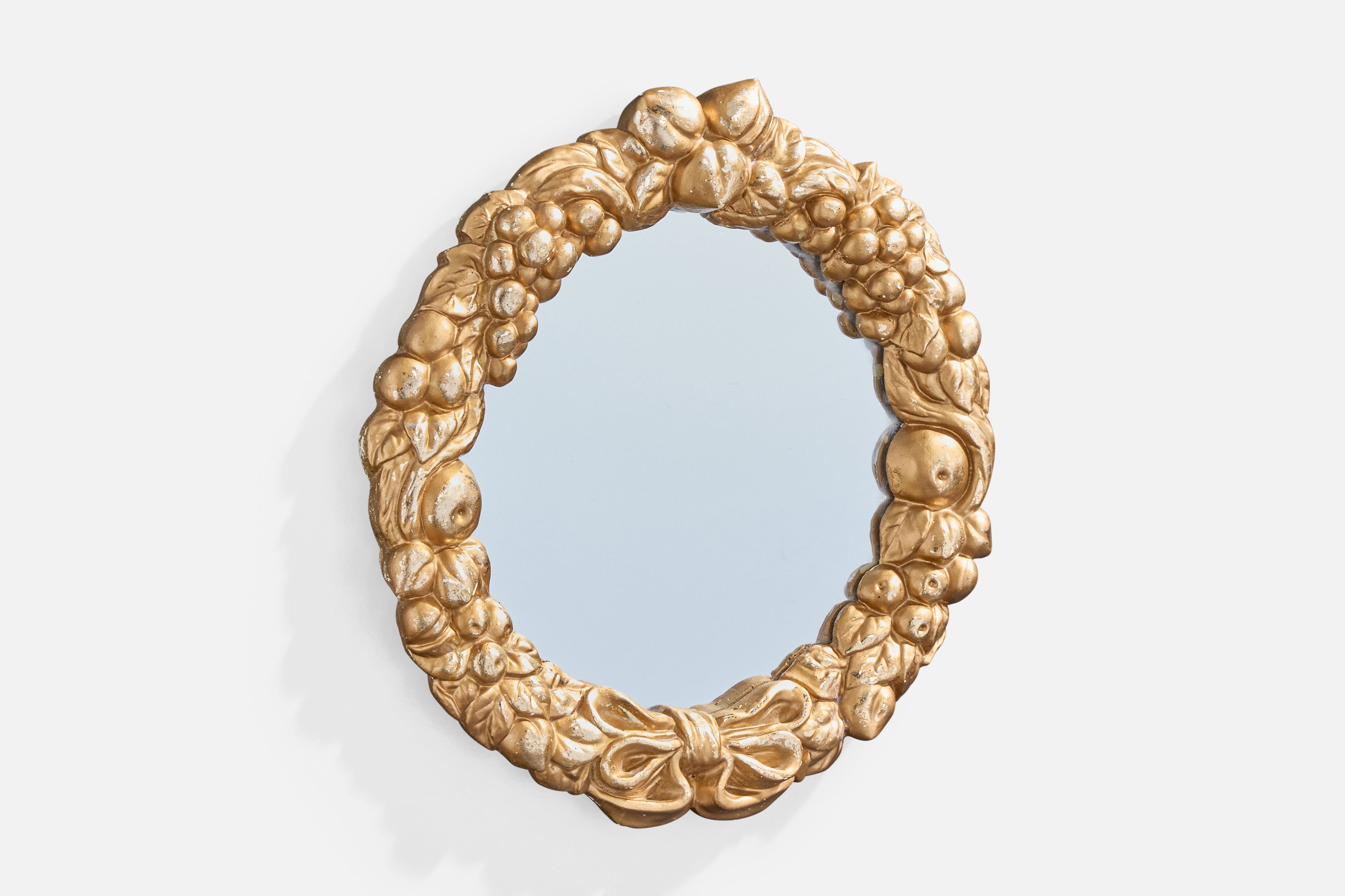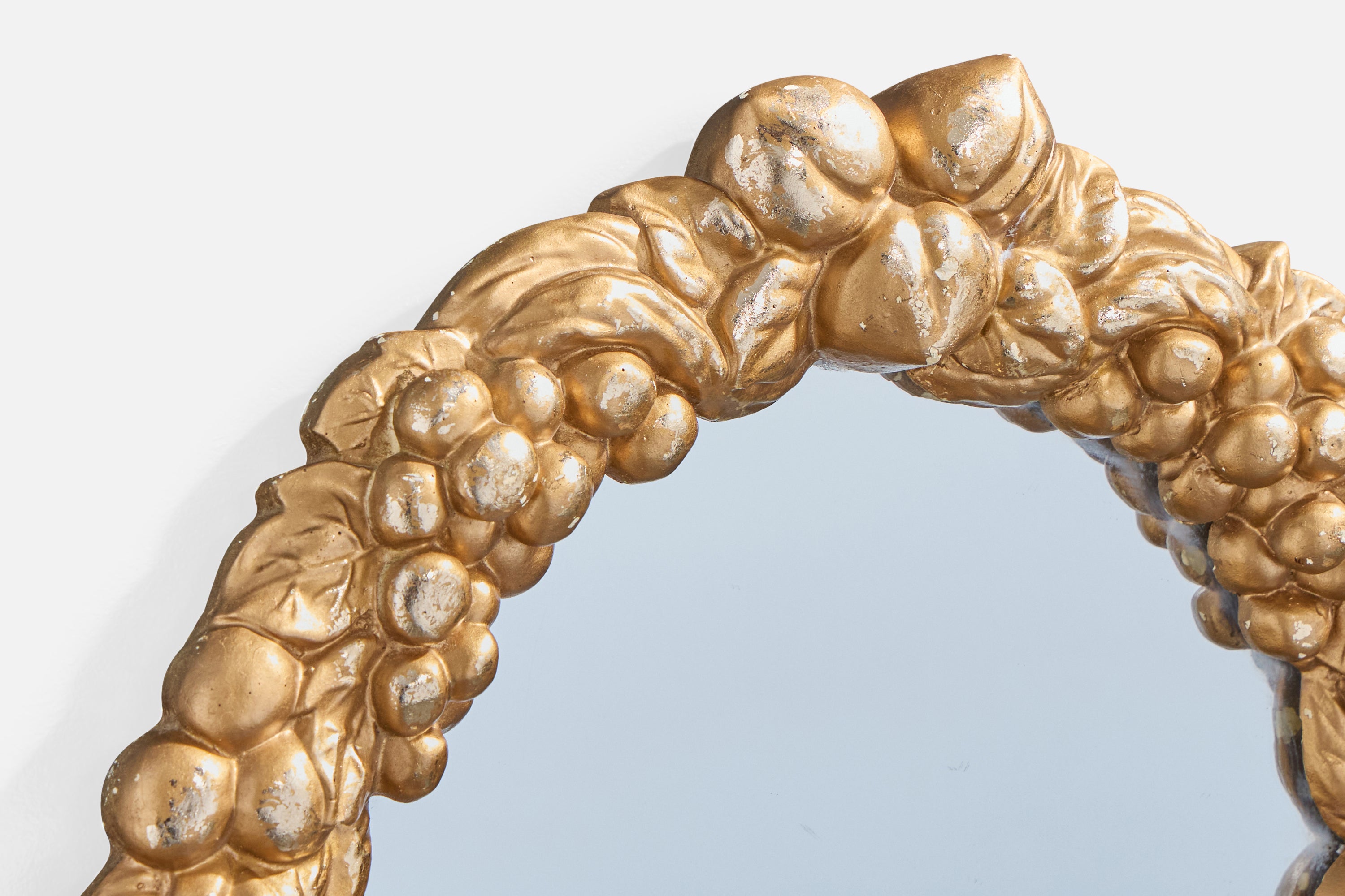 A gold-painted wood and plaster wall mirror likely designed and produced in France, c. 1950s.