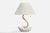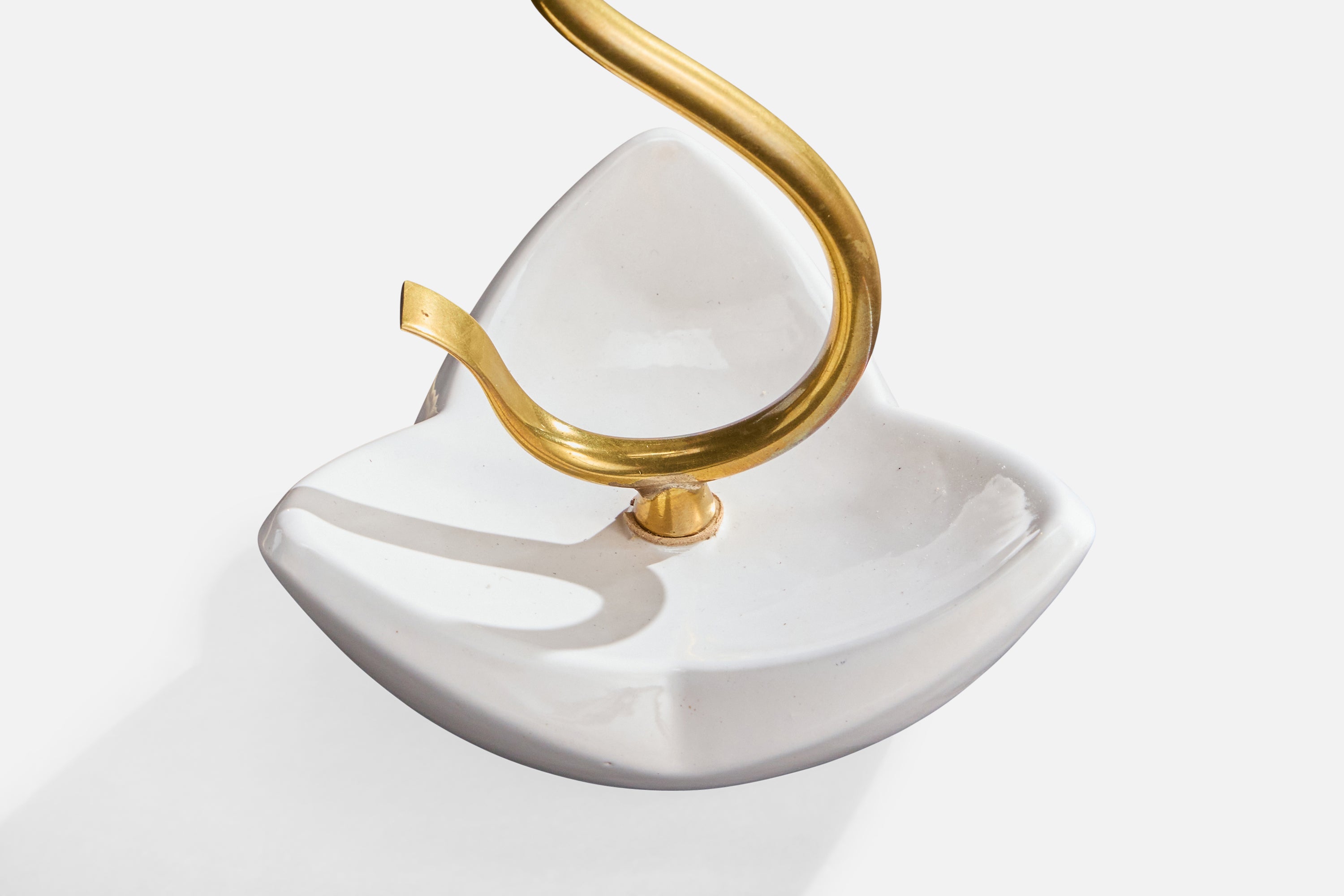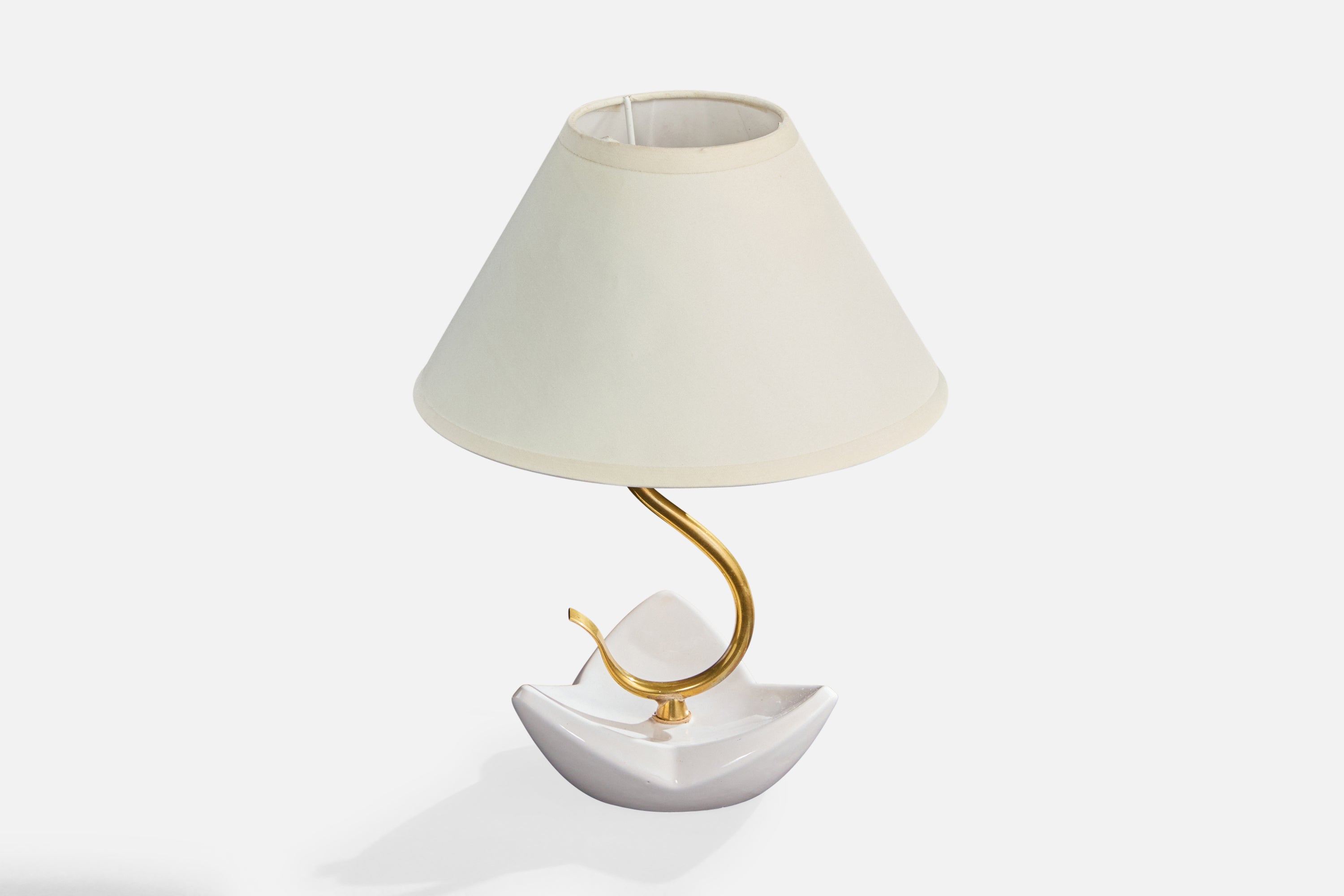 A brass, white-glazed ceramic and white fabric table lamp designed and produced in France, c. 1950s.