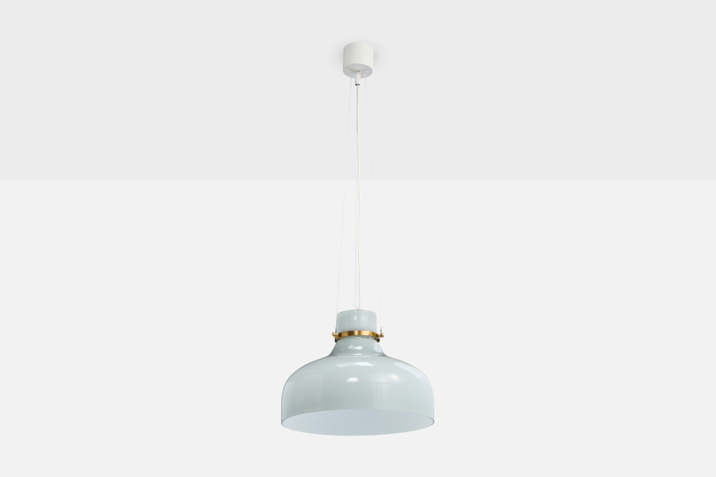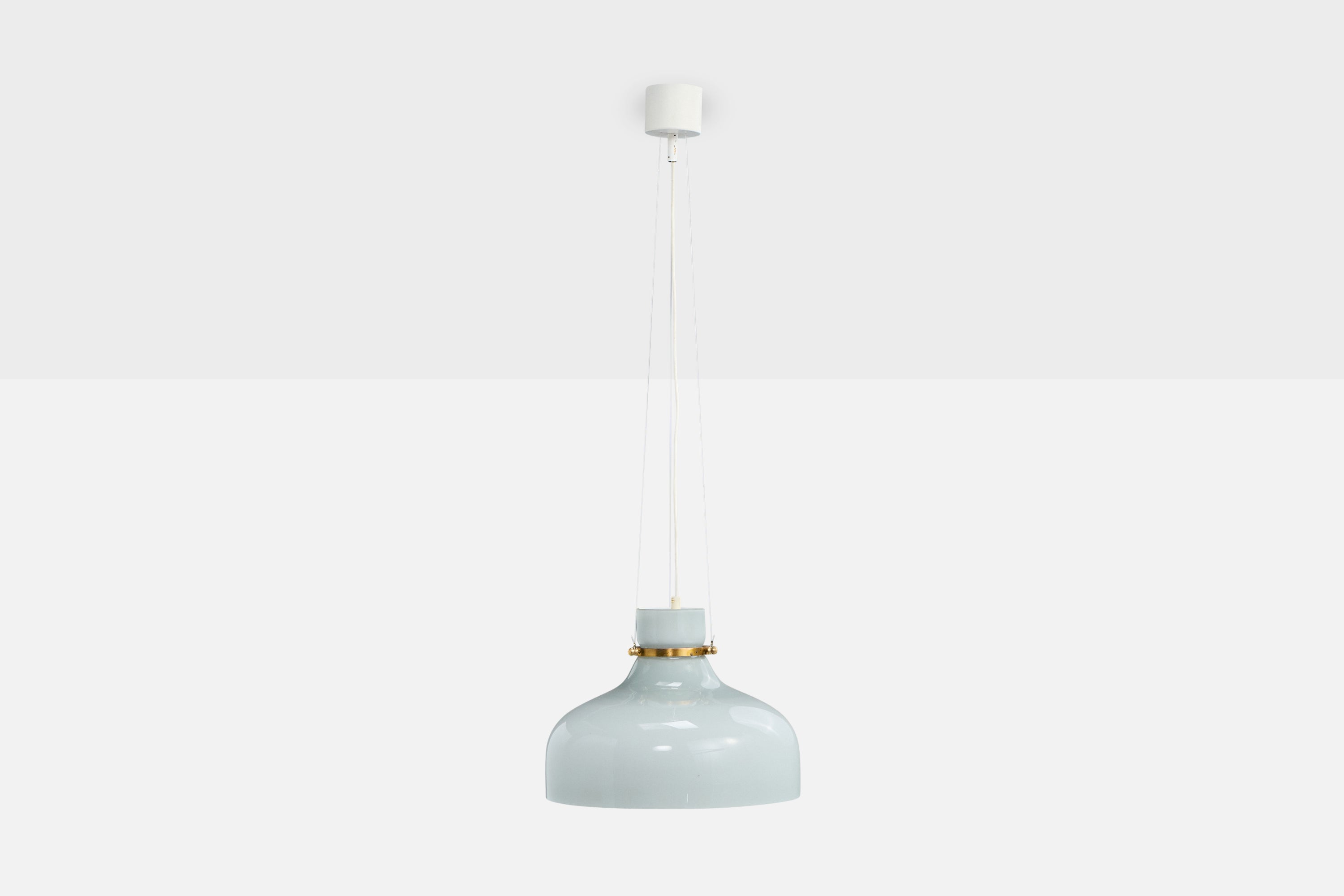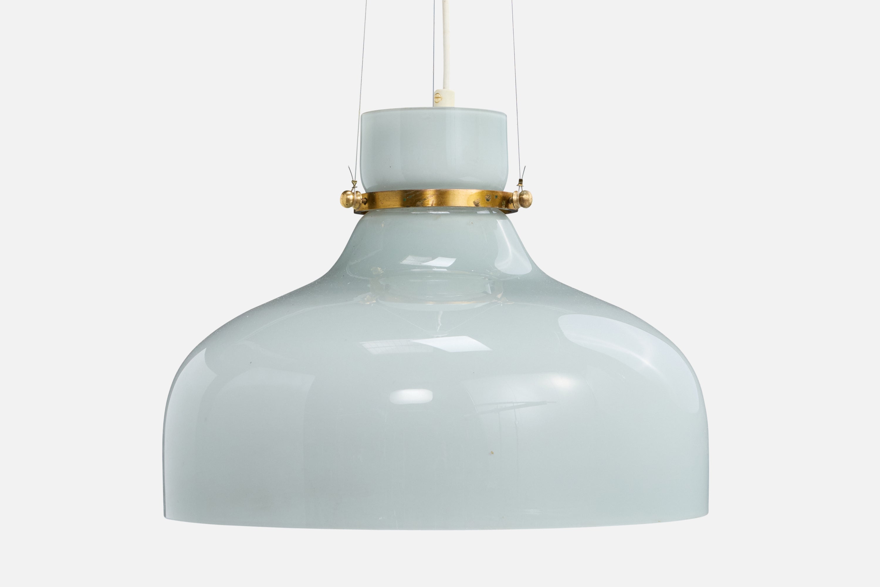 A blue-colored opaline glass and brass pendant light likely designed and produced in Italy, c. 1950s.