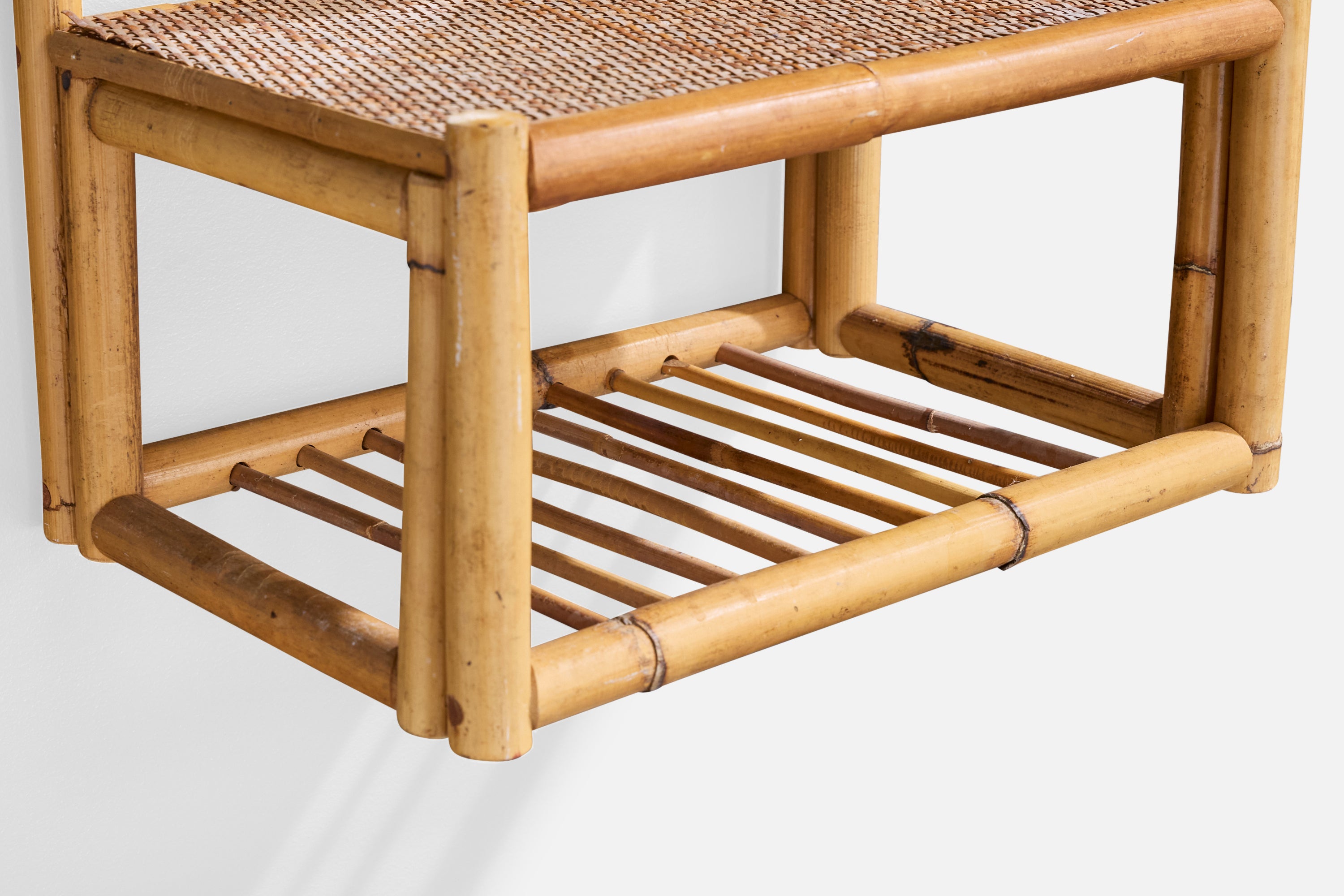 A bamboo and rattan wall mirror with console likely designed and produced in the US, c. 1950s.