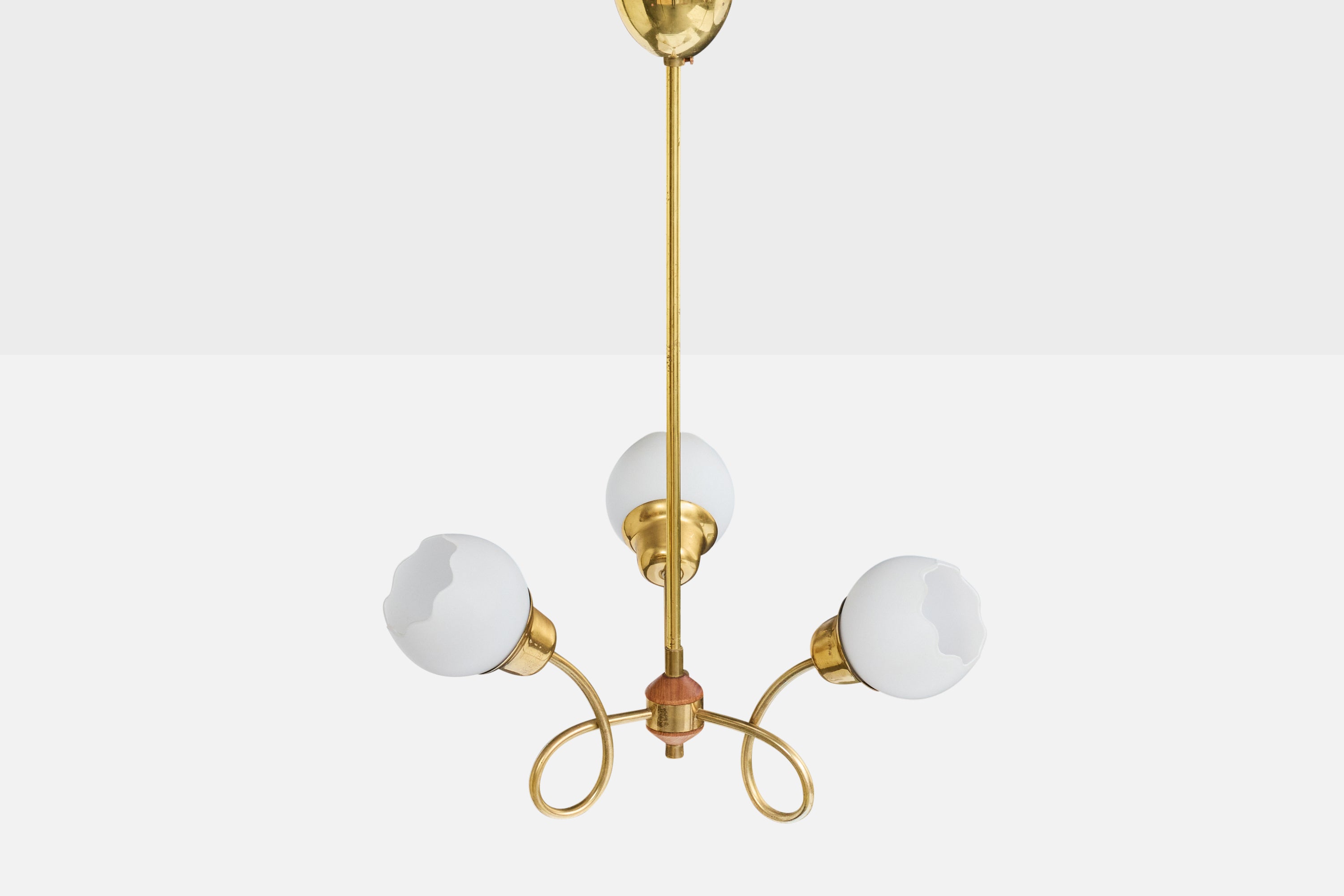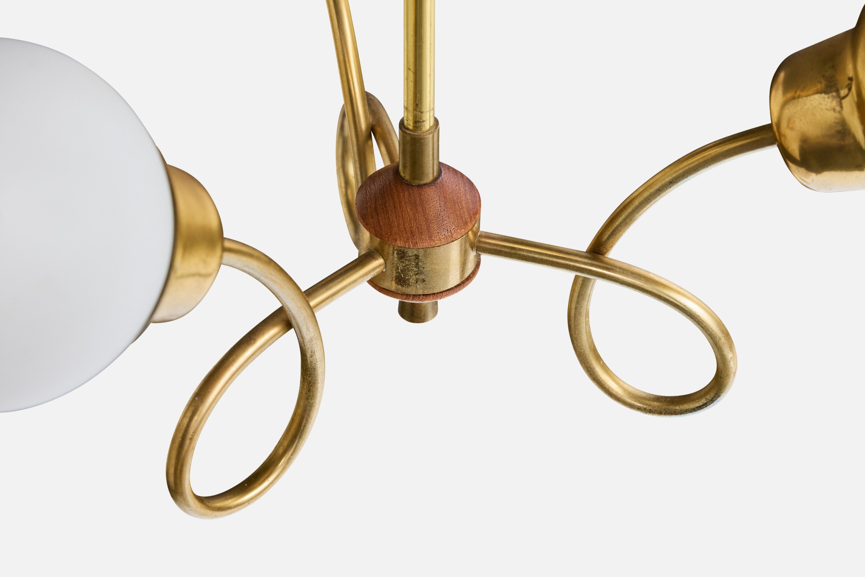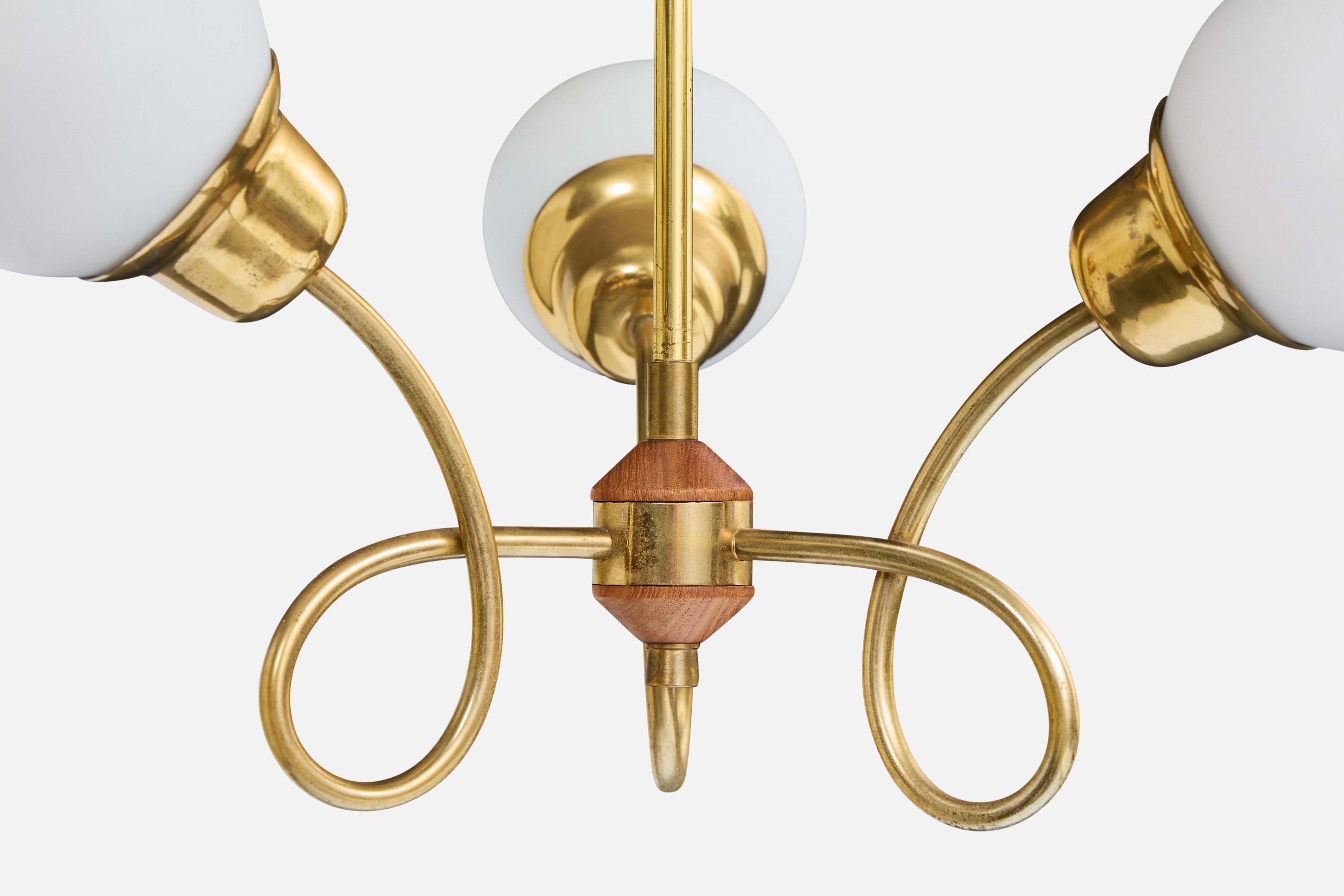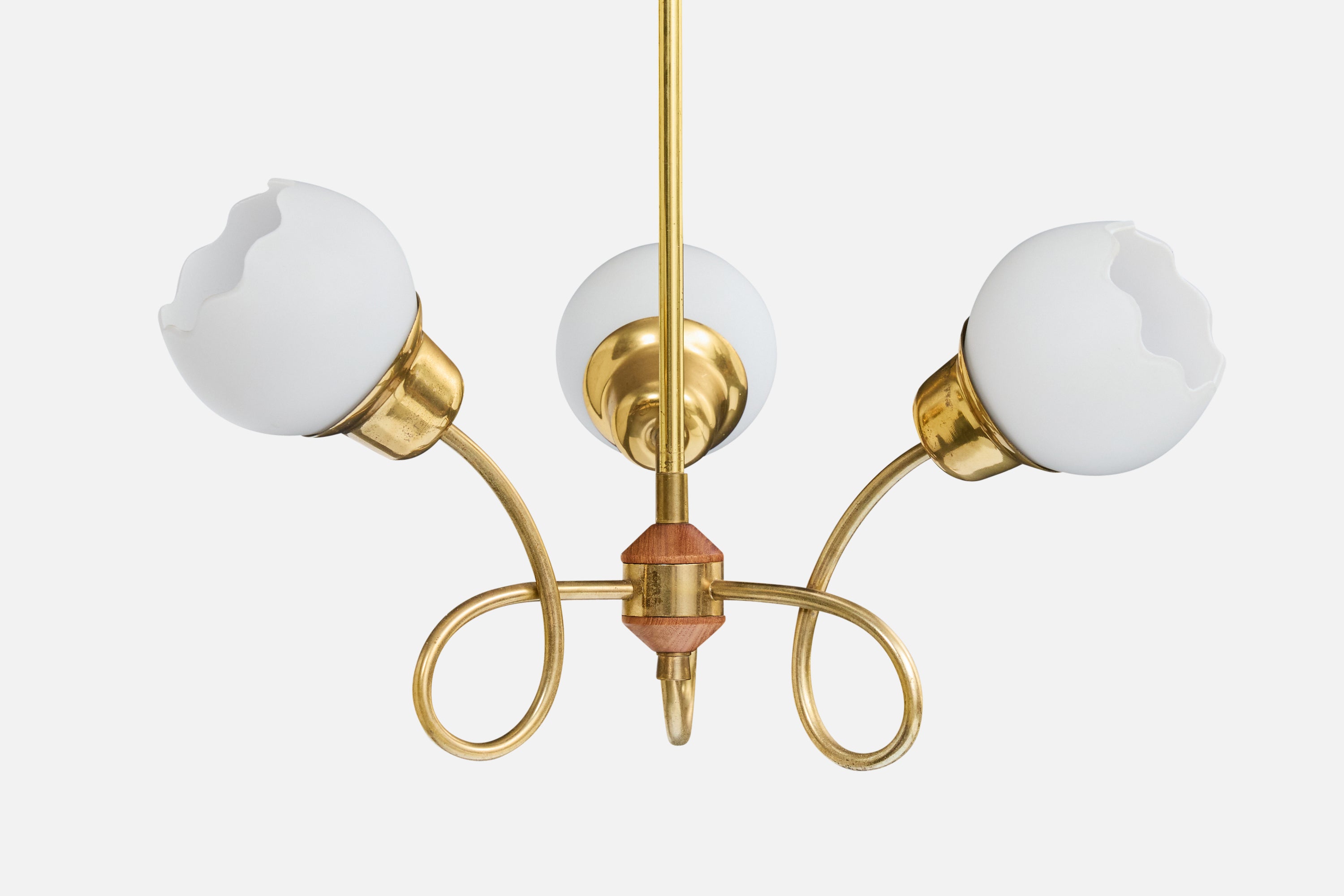 A brass, wood and white opaline glass chandelier designed and produced in Sweden, c. 1950s.