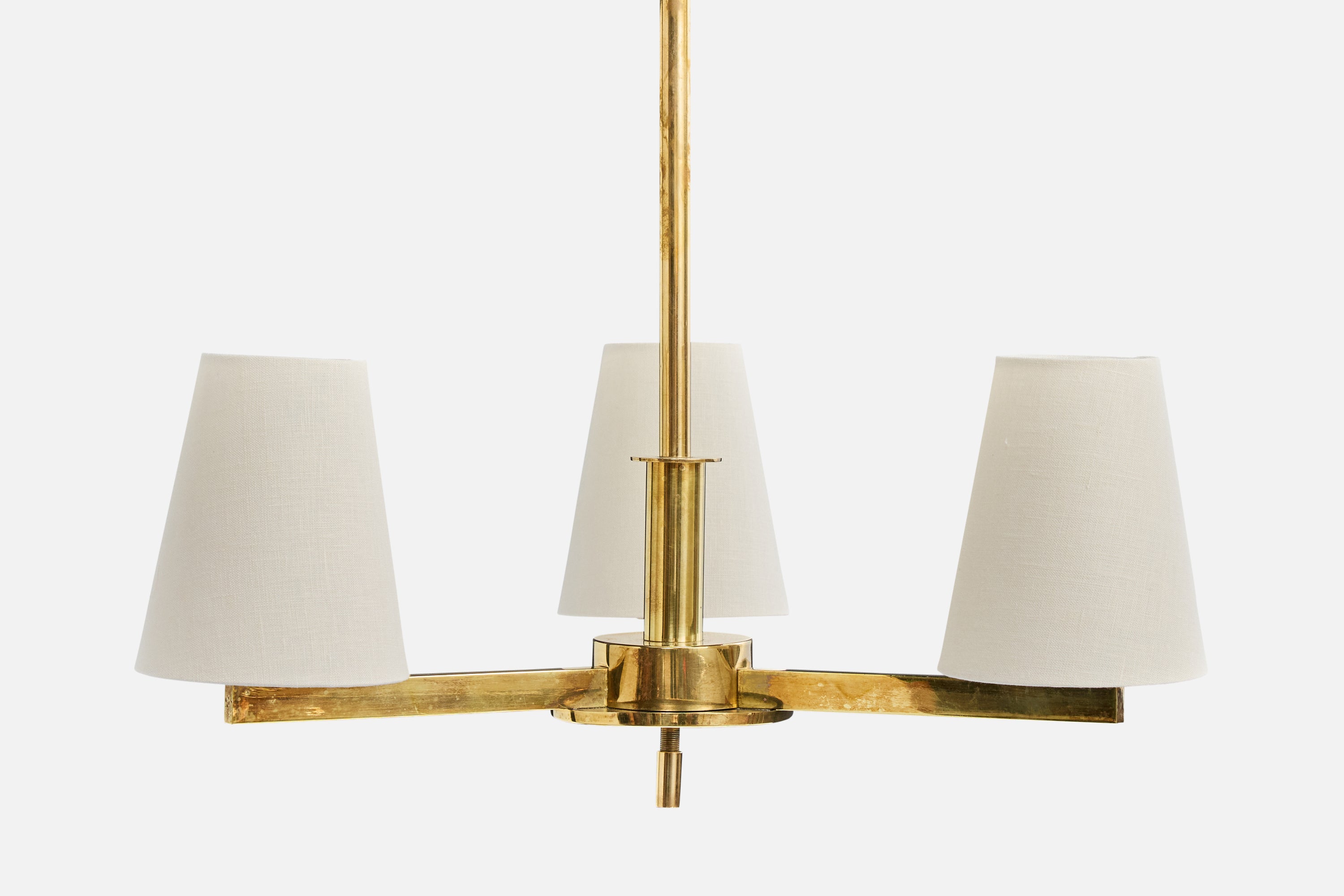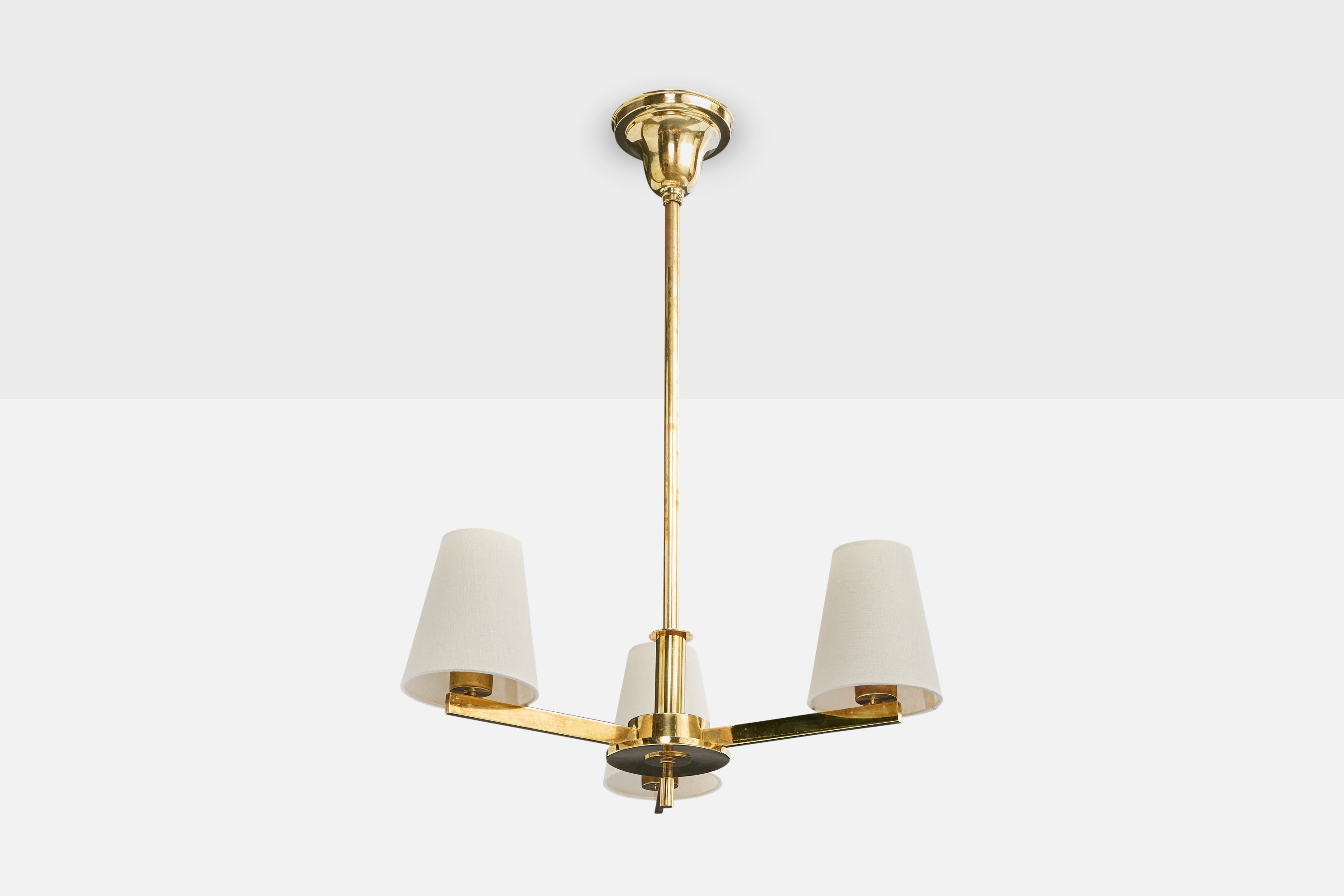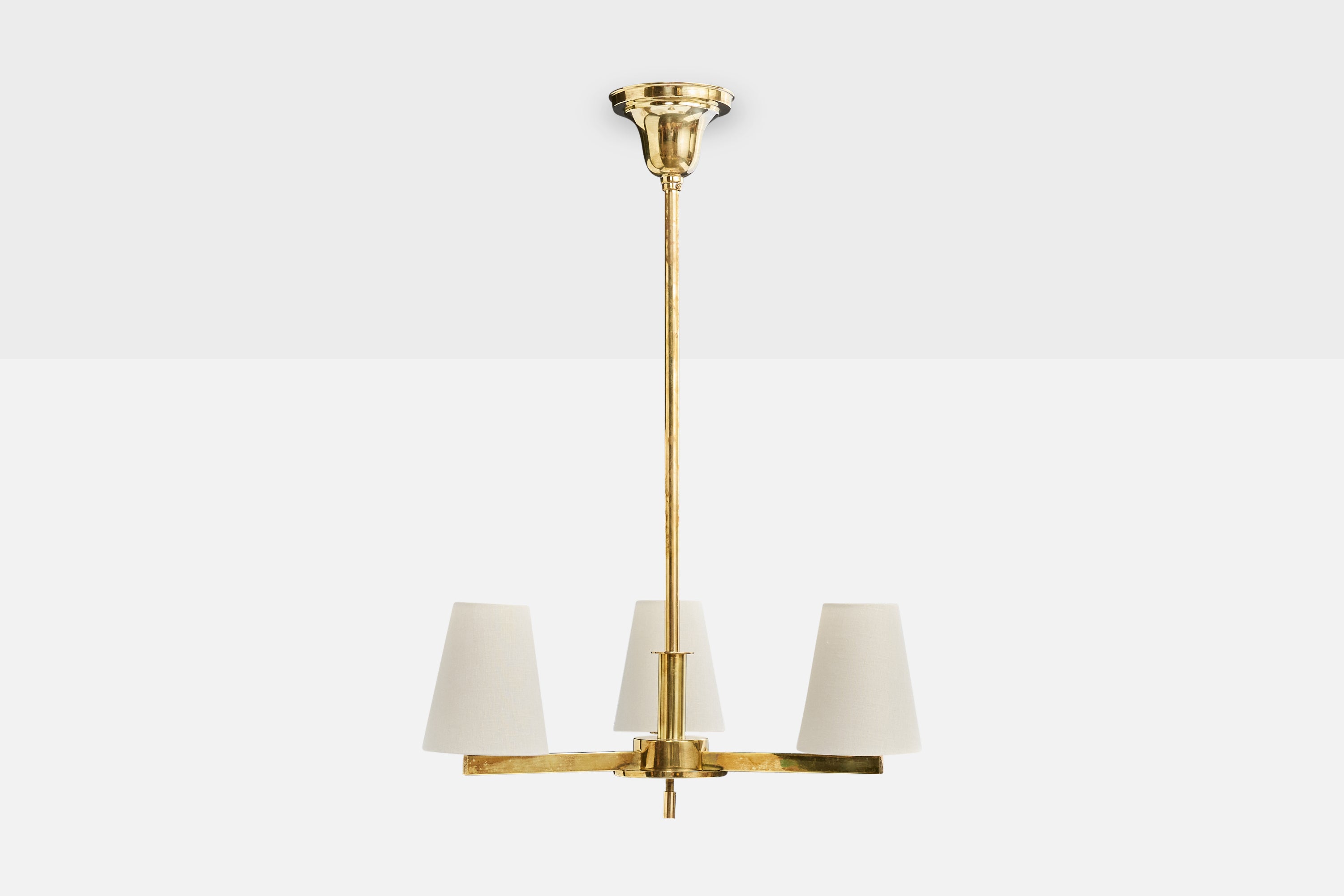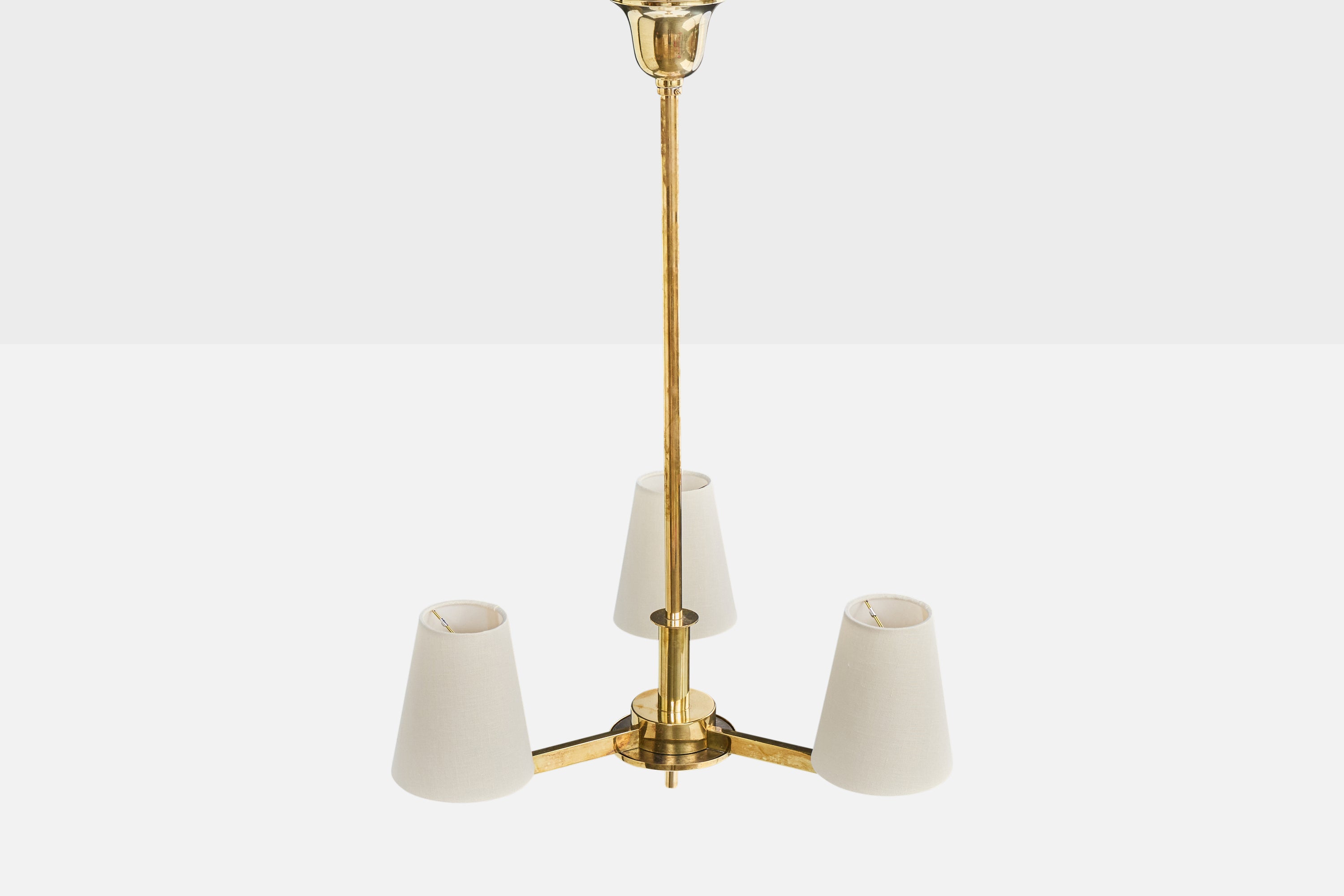 A brass and white fabric chandelier designed by Paavo Tynell and produced by Taito, Finland, c. 1940s.