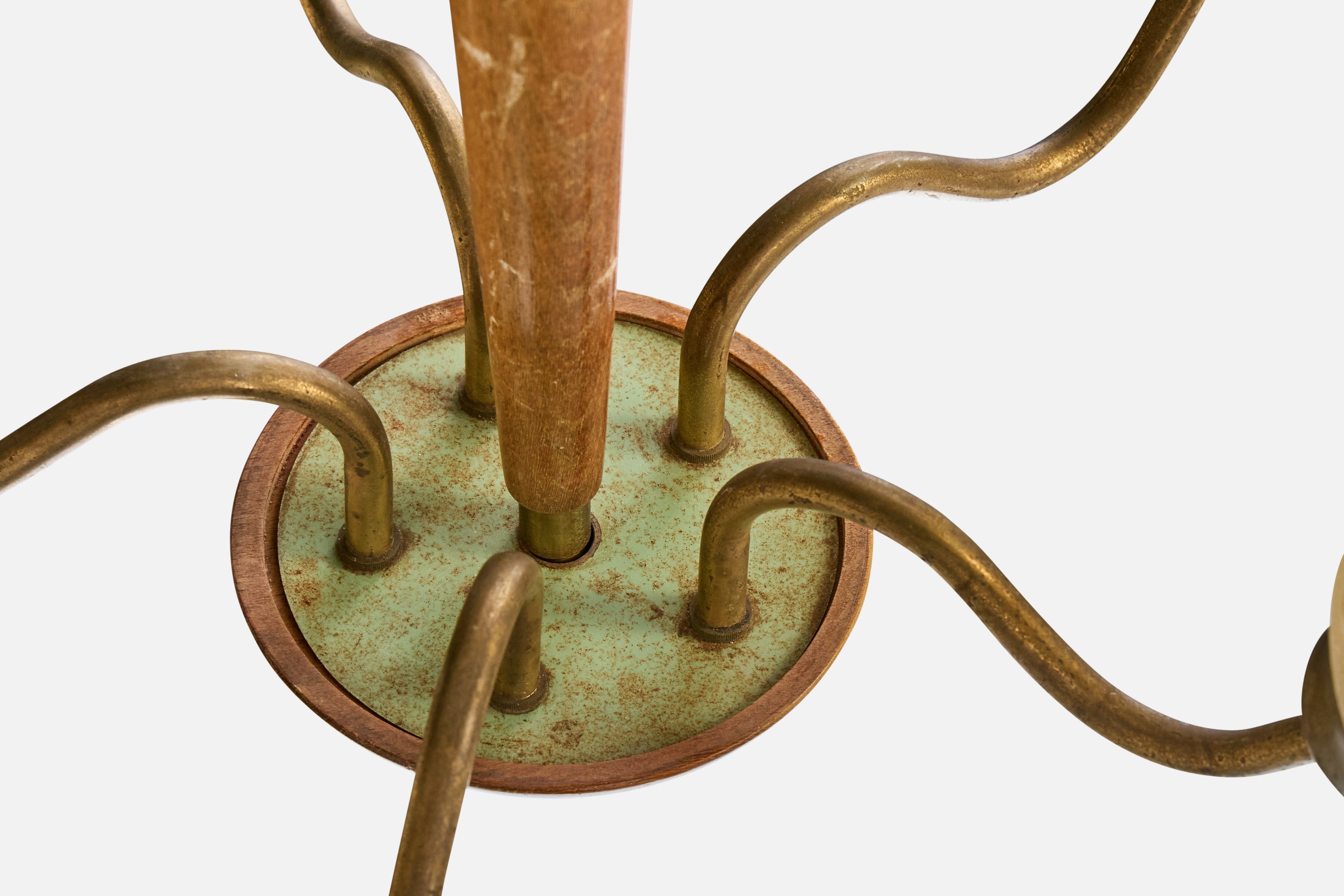 Swedish Designer, Chandelier, Brass, Wood, Glass, Sweden, 1950s