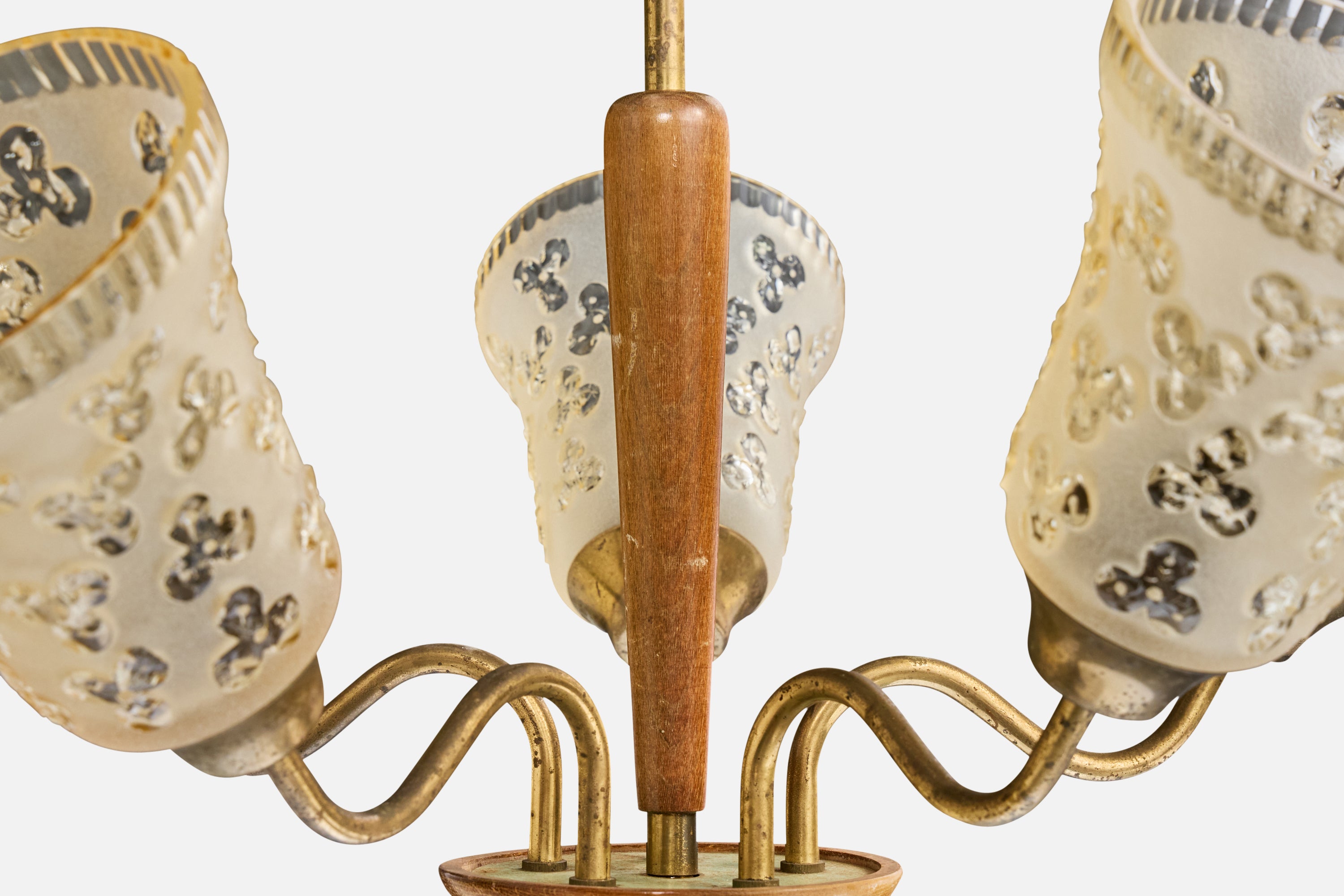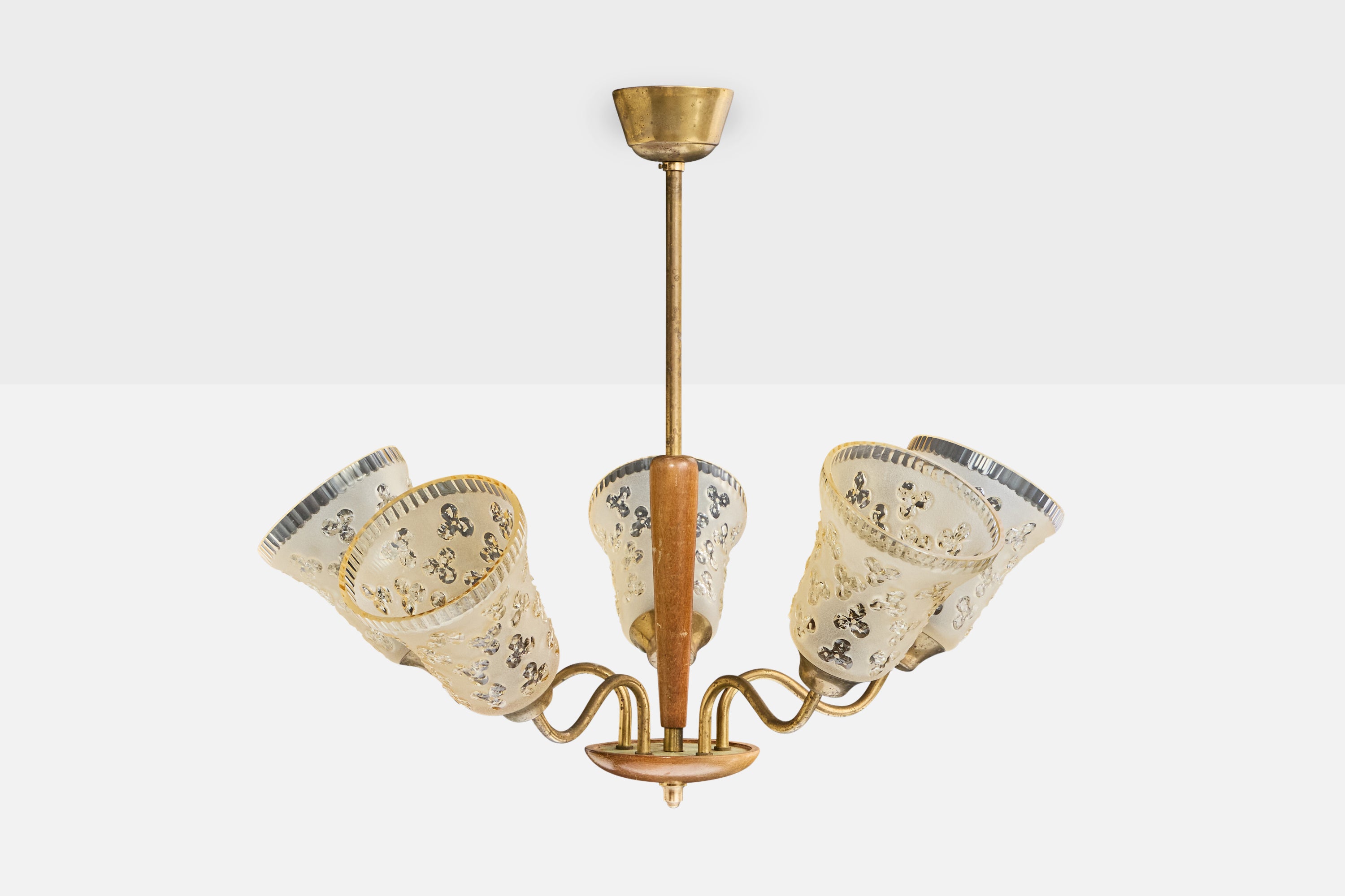 A brass, wood and etched glass chandelier designed and produced in Sweden, c. 1950s.