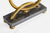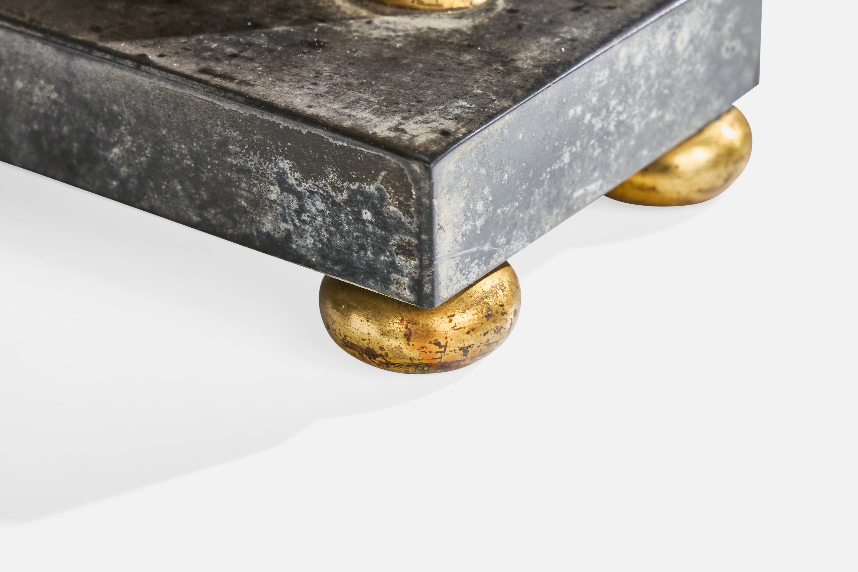 A pair of brass, glass, black marble and white fabric table lamps designed and produced in France, c. 1940s.