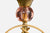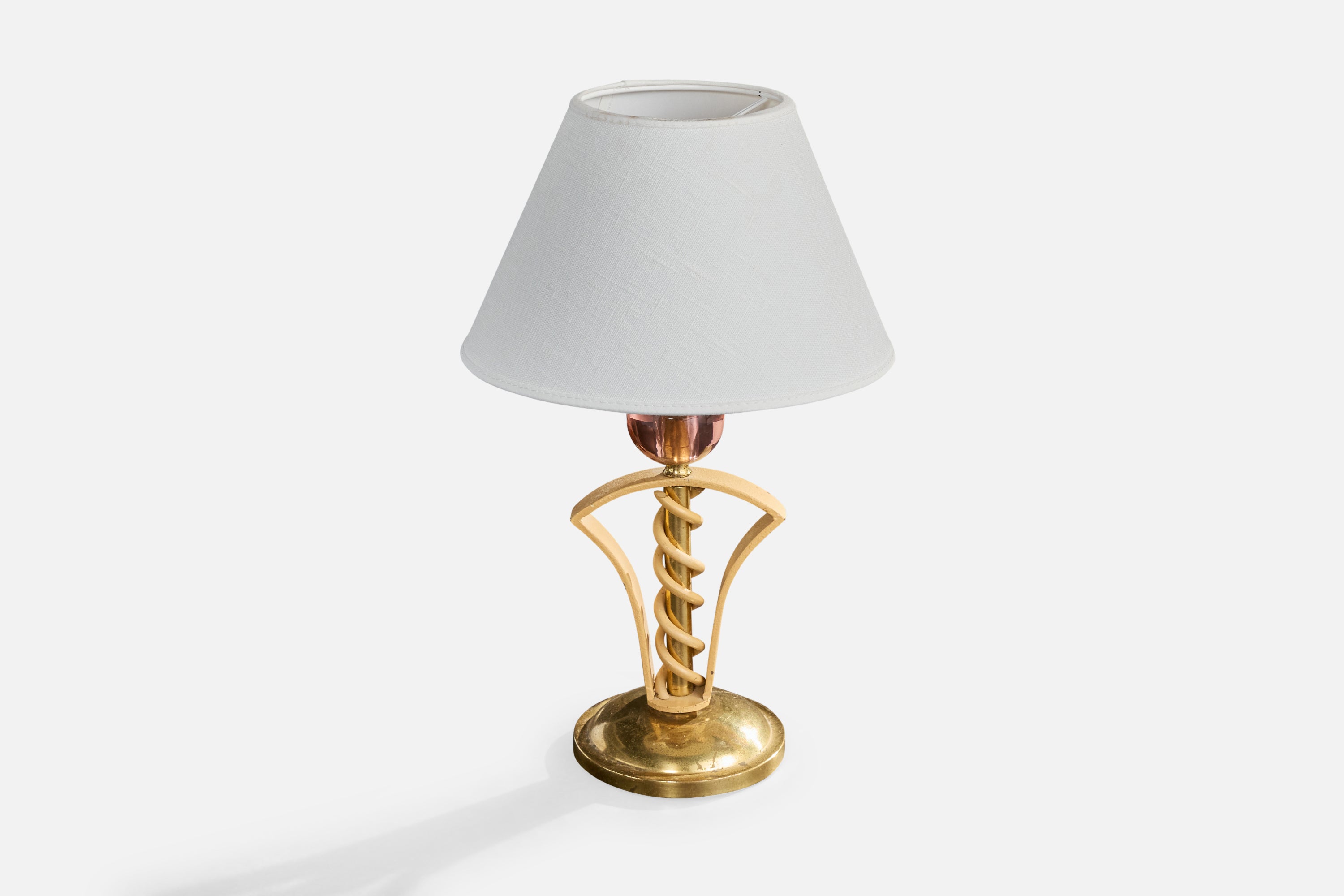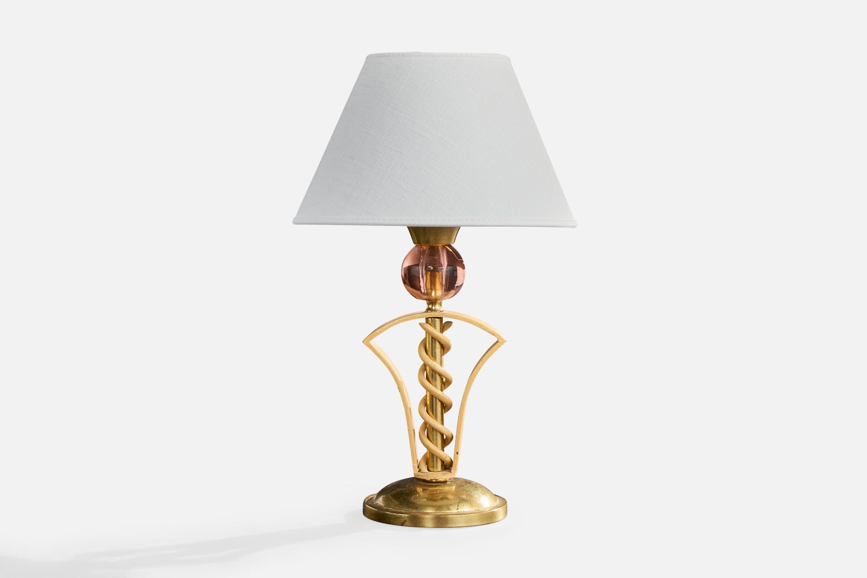 A brass, metal and pink glass table lamp designed and produced in France, c. 1950s.