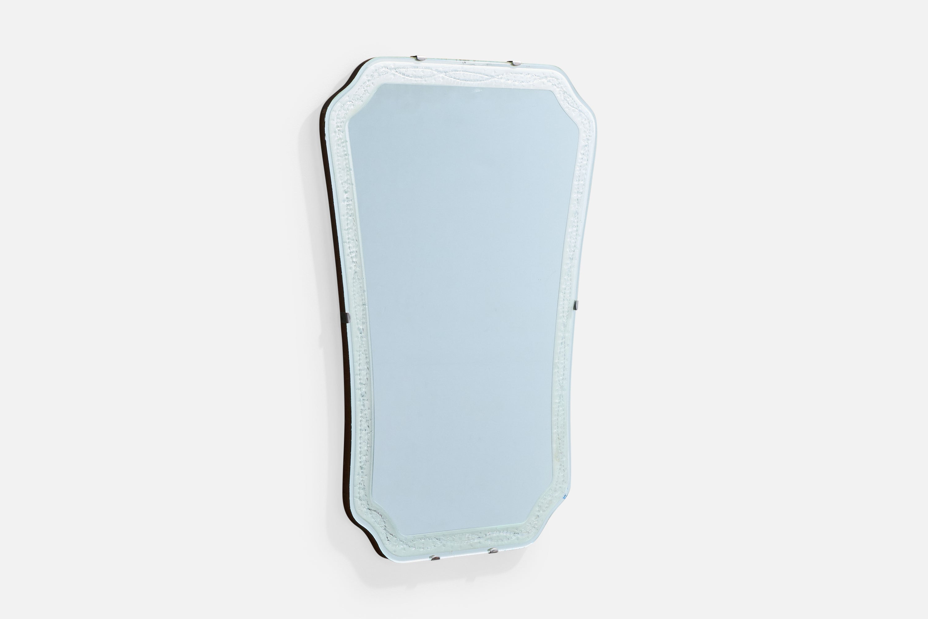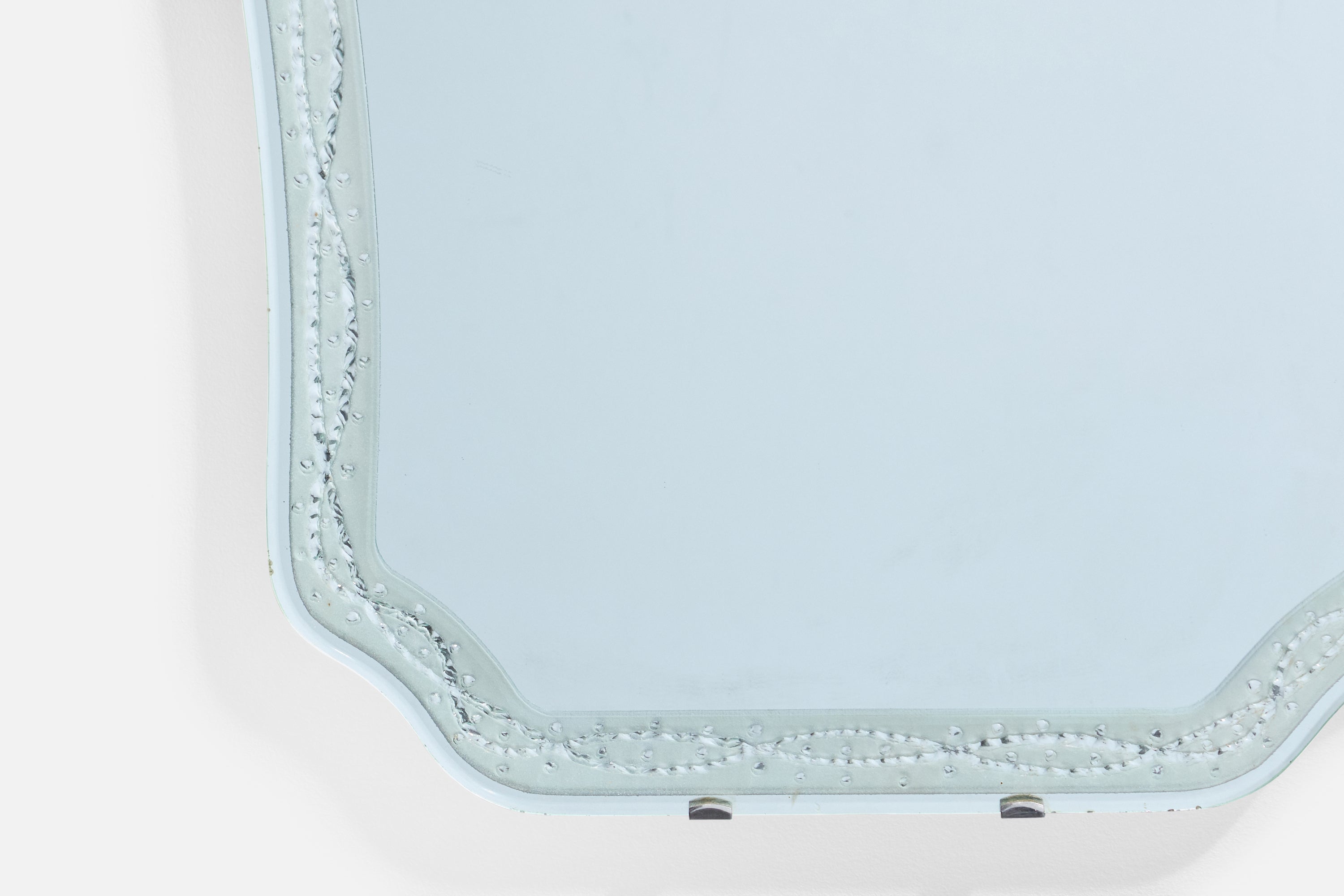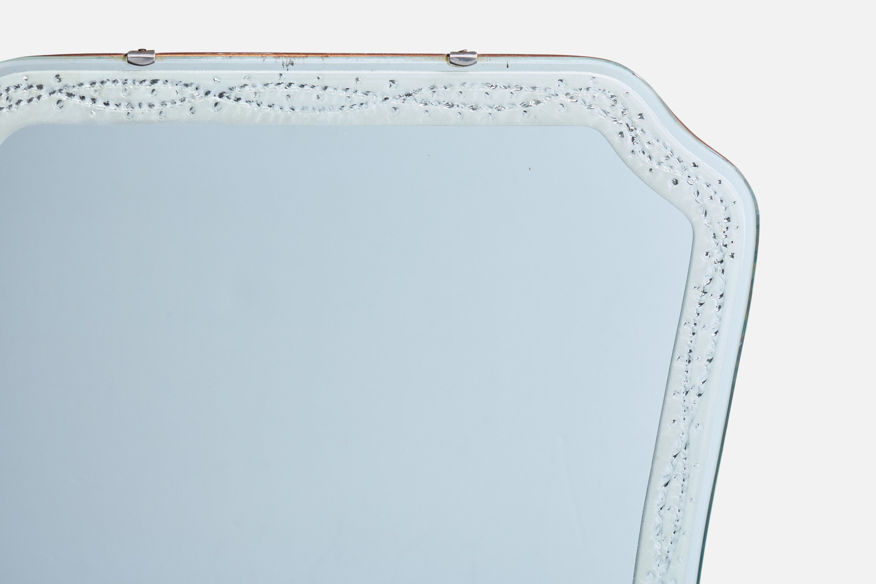 An etched glass, wood and metal wall mirror produced by Eriksmålaglas, Sweden, c. 1950s.