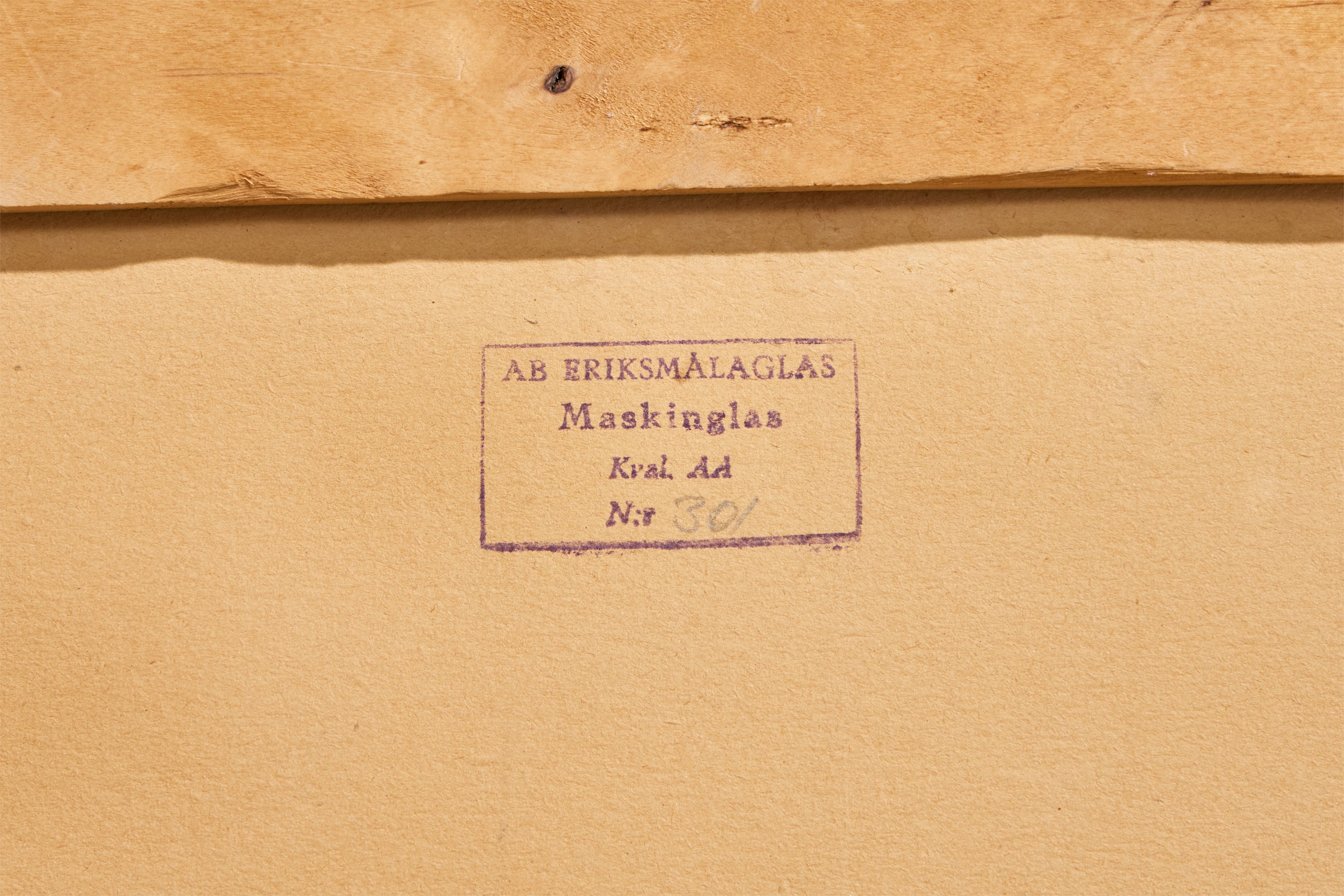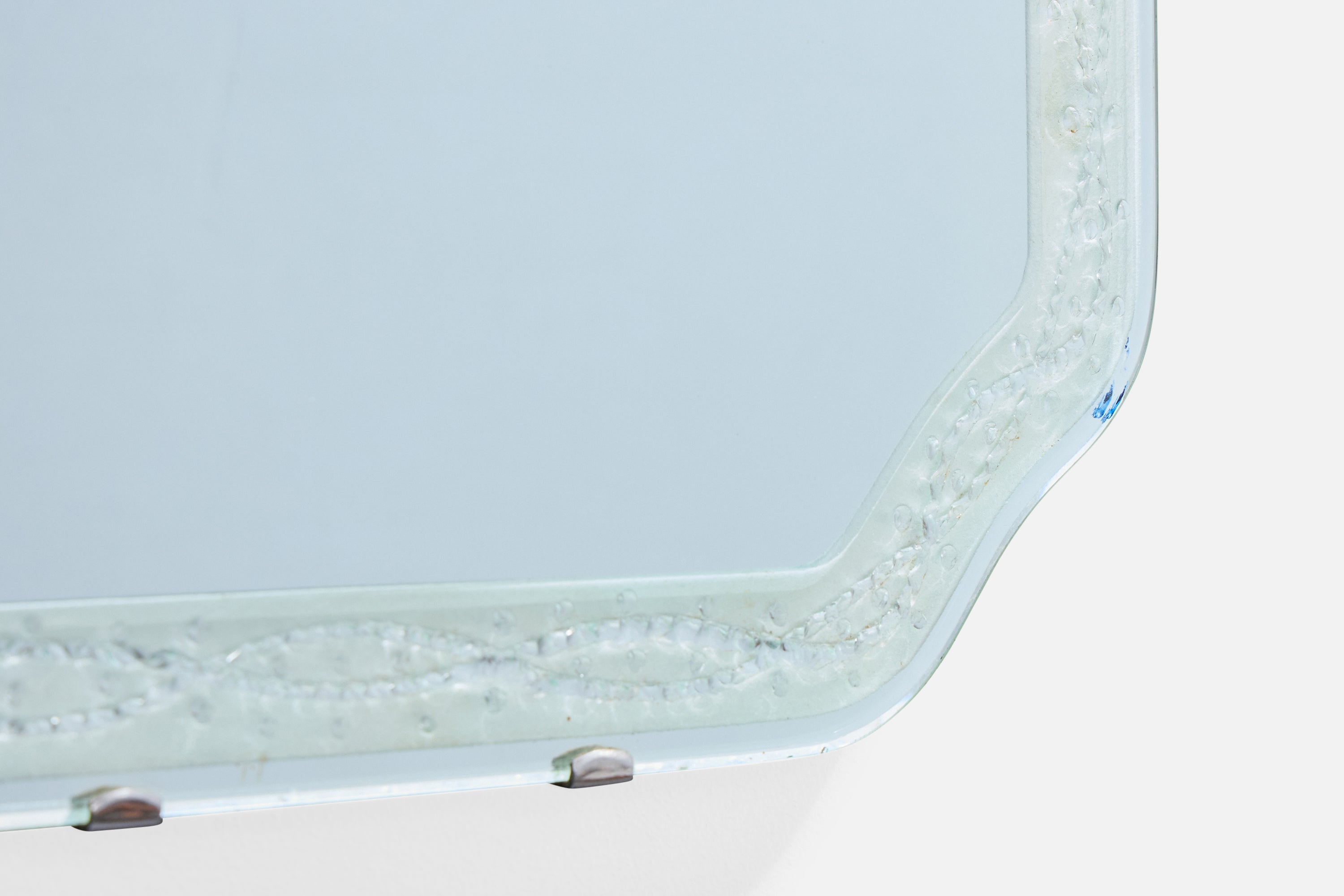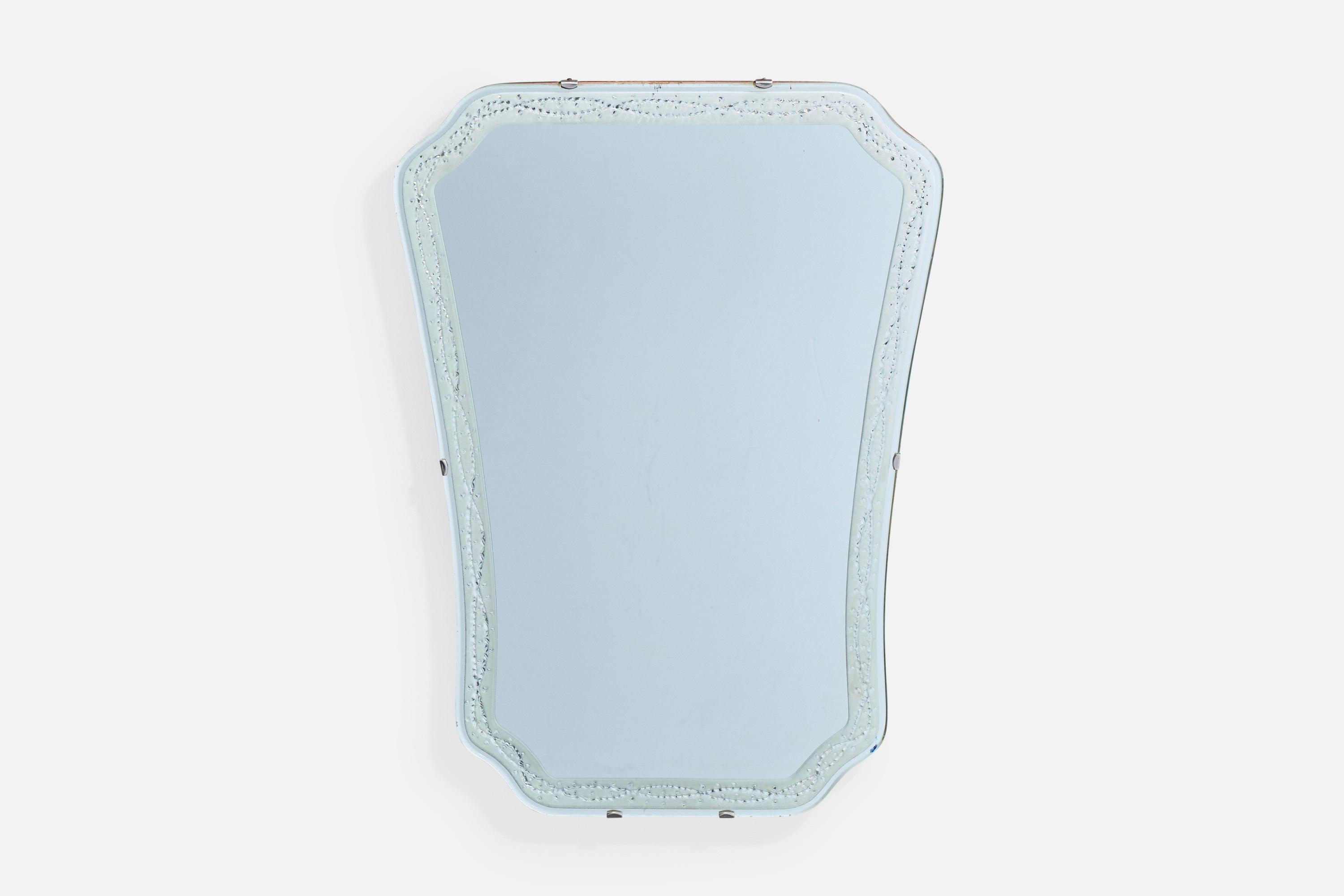 An etched glass, wood and metal wall mirror produced by Eriksmålaglas, Sweden, c. 1950s.