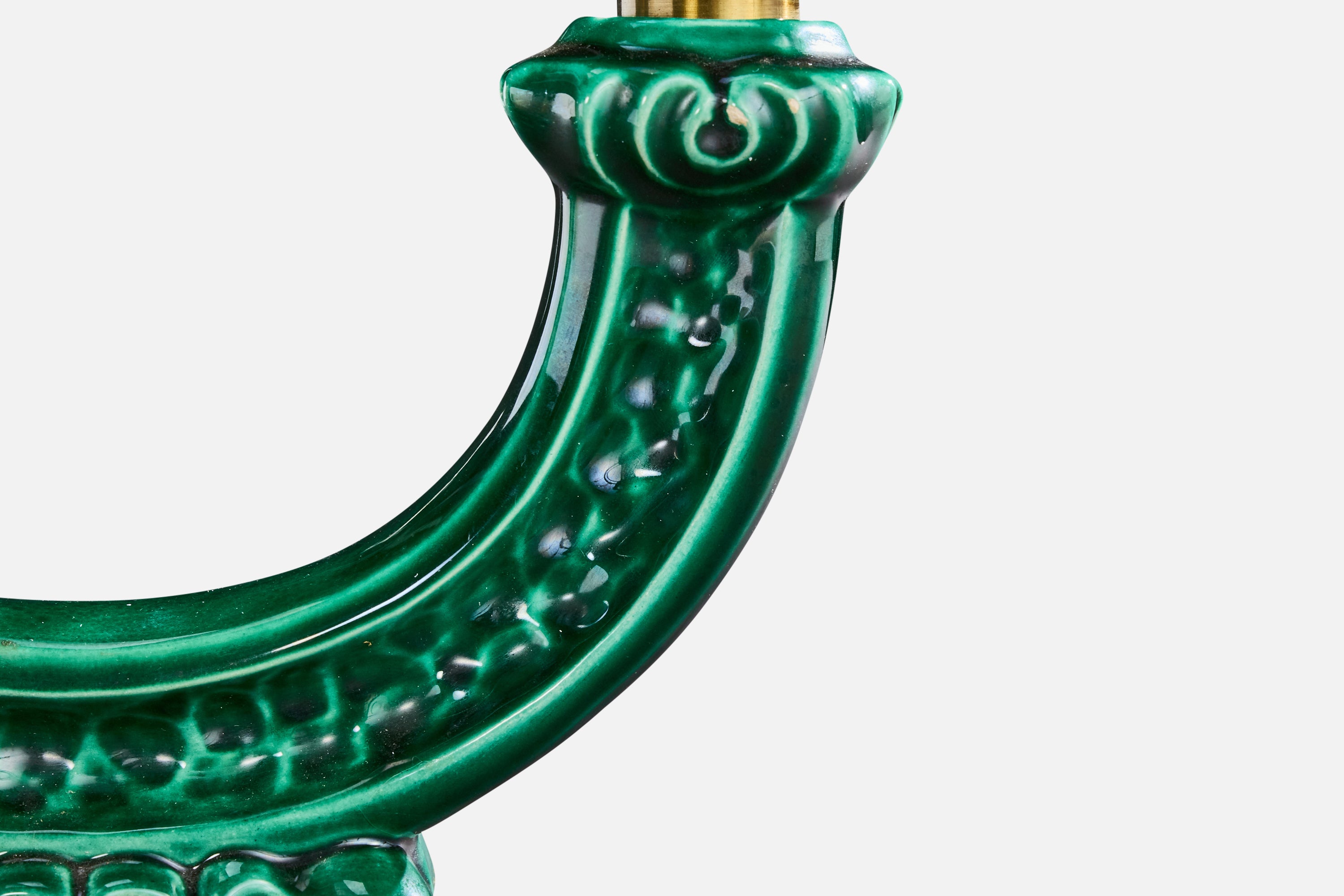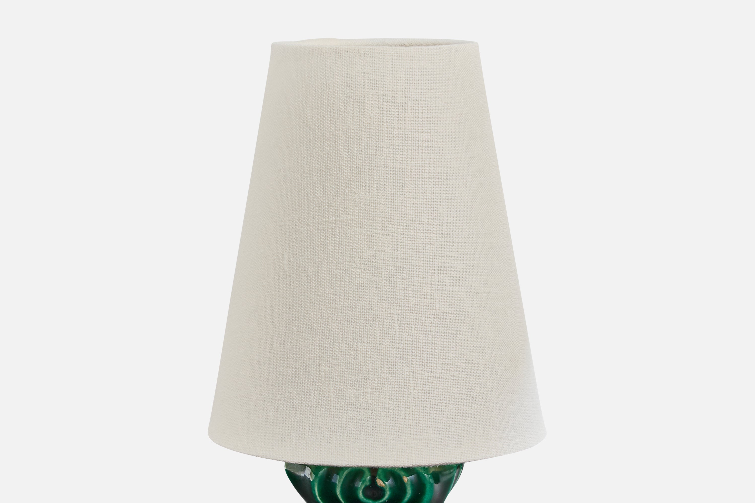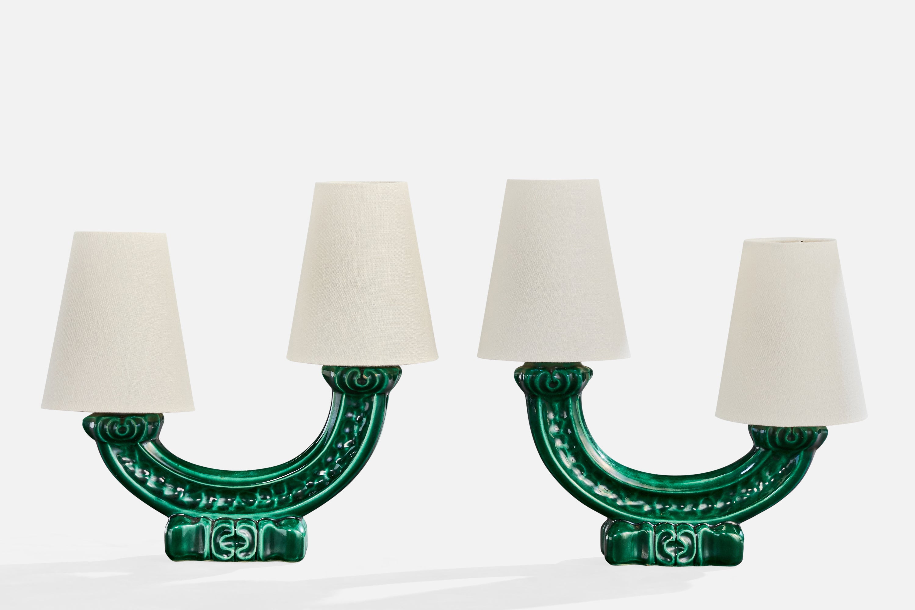 A pair of green-glazed ceramic and white fabric table lamps designed and produced by Santiago Rodríguez Bonome, Paris, France, c. 1950s.