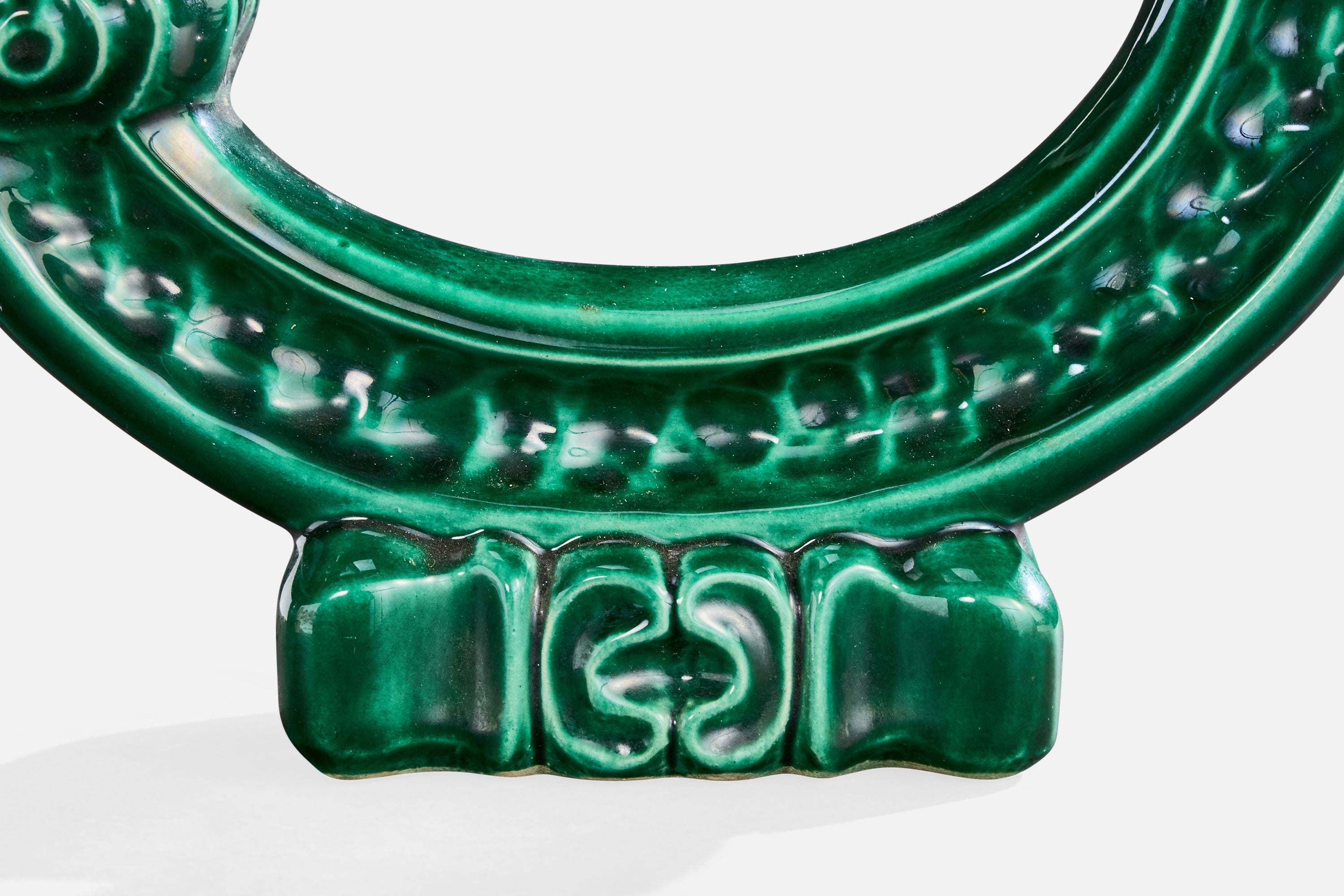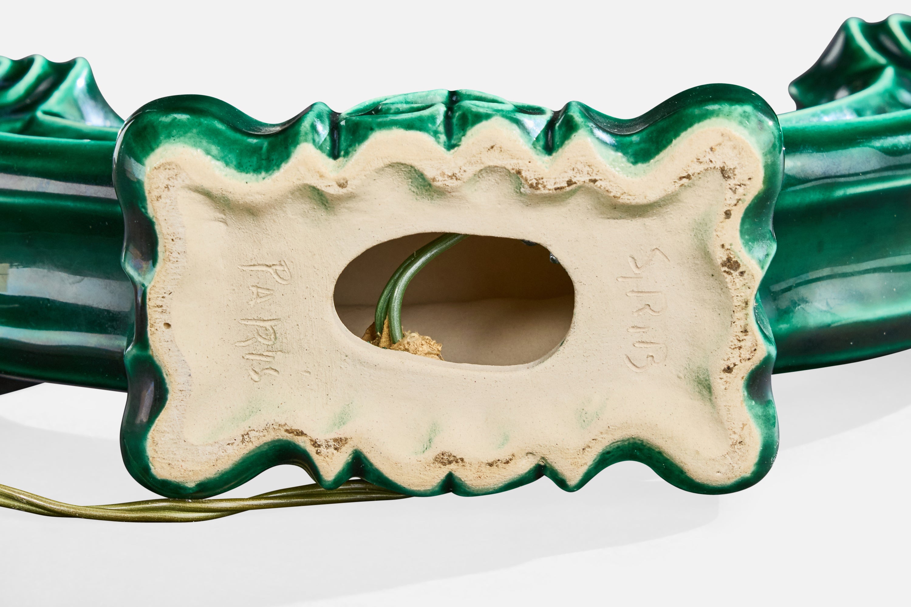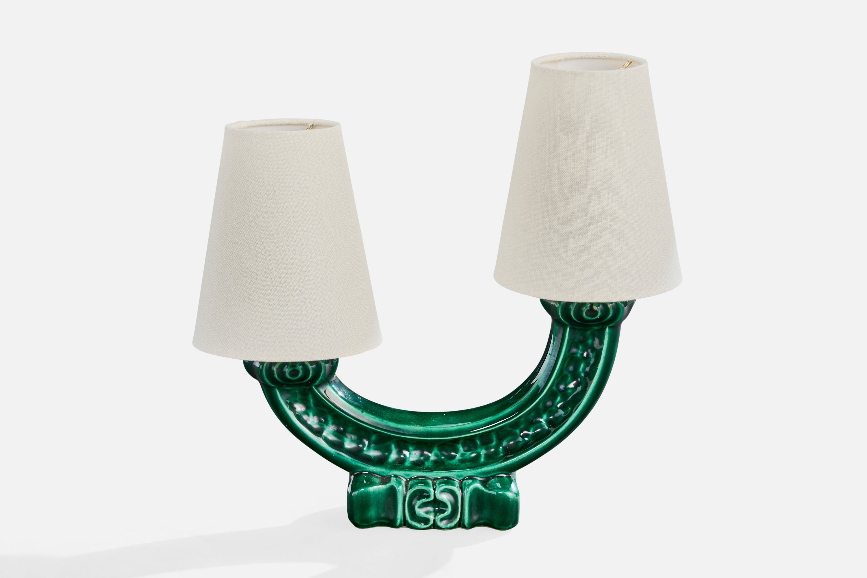 A pair of green-glazed ceramic and white fabric table lamps designed and produced by Santiago Rodríguez Bonome, Paris, France, c. 1950s.