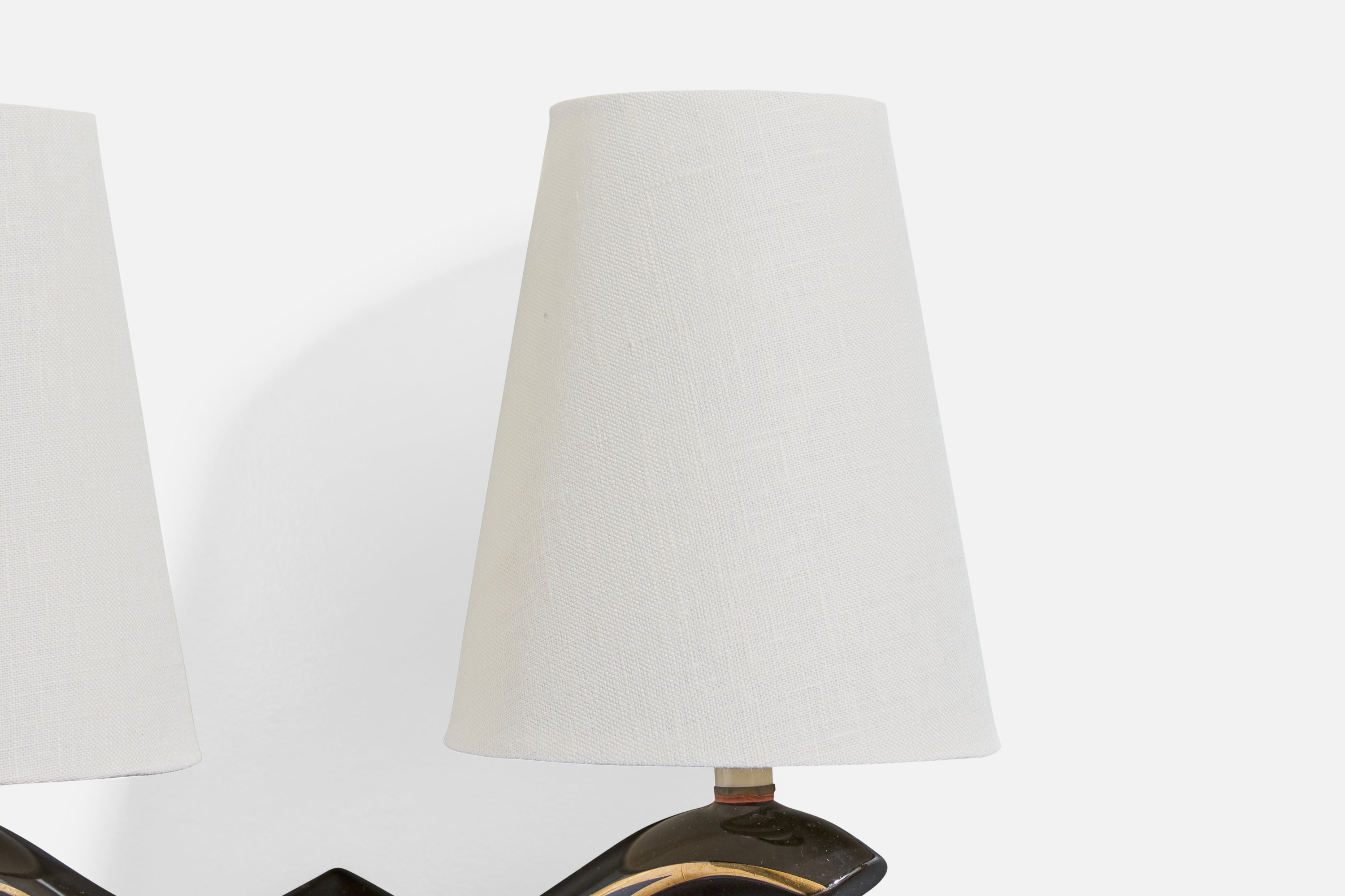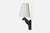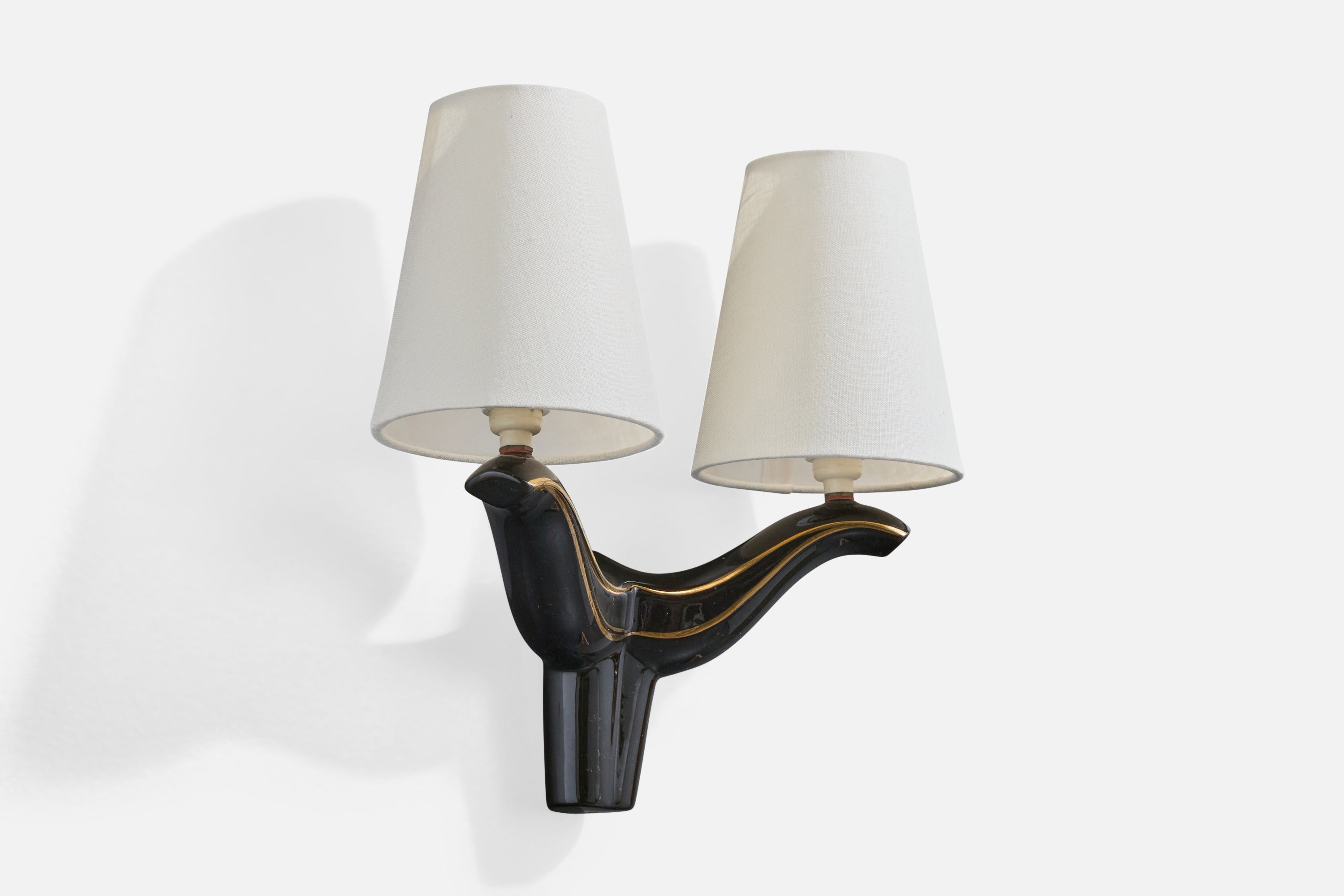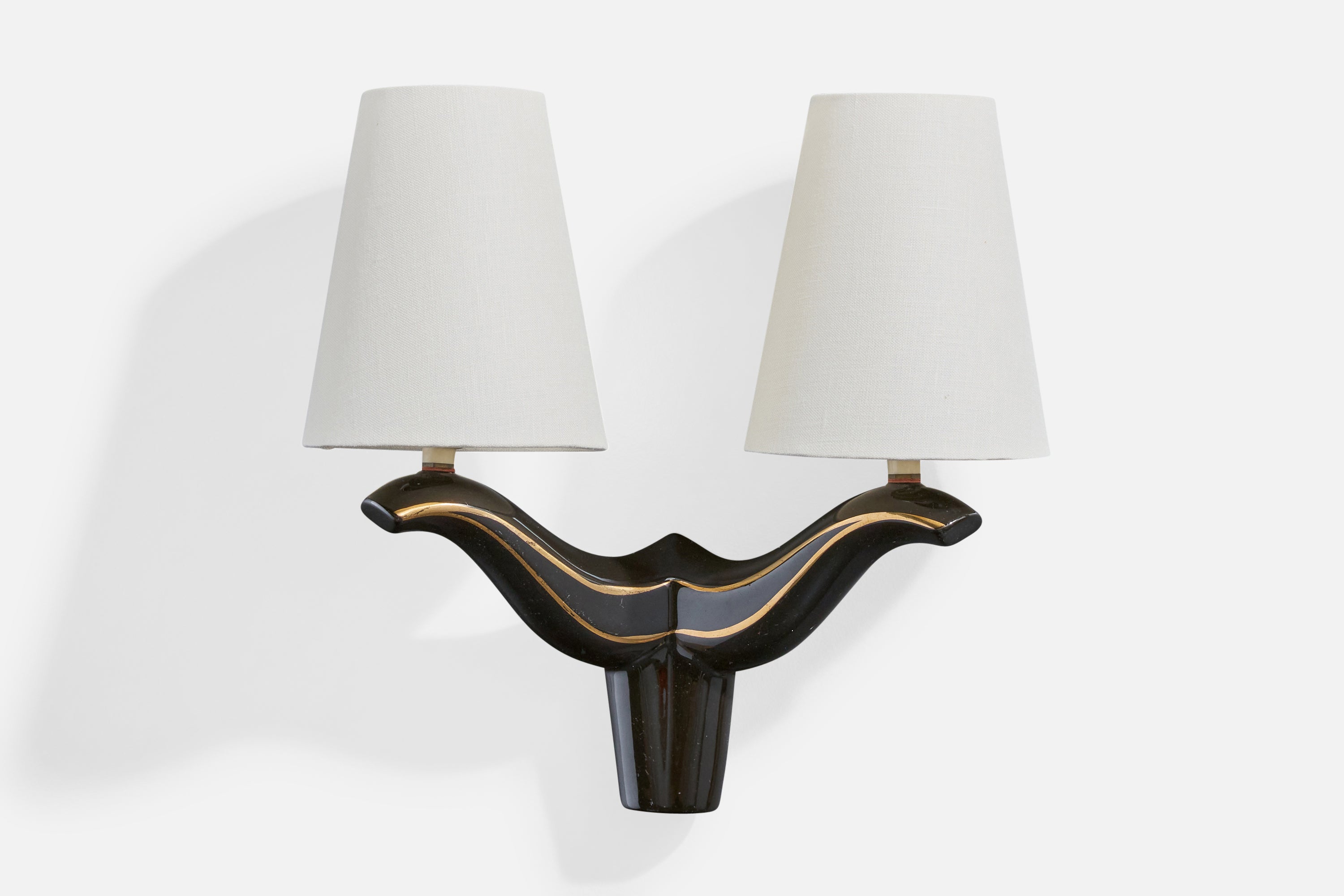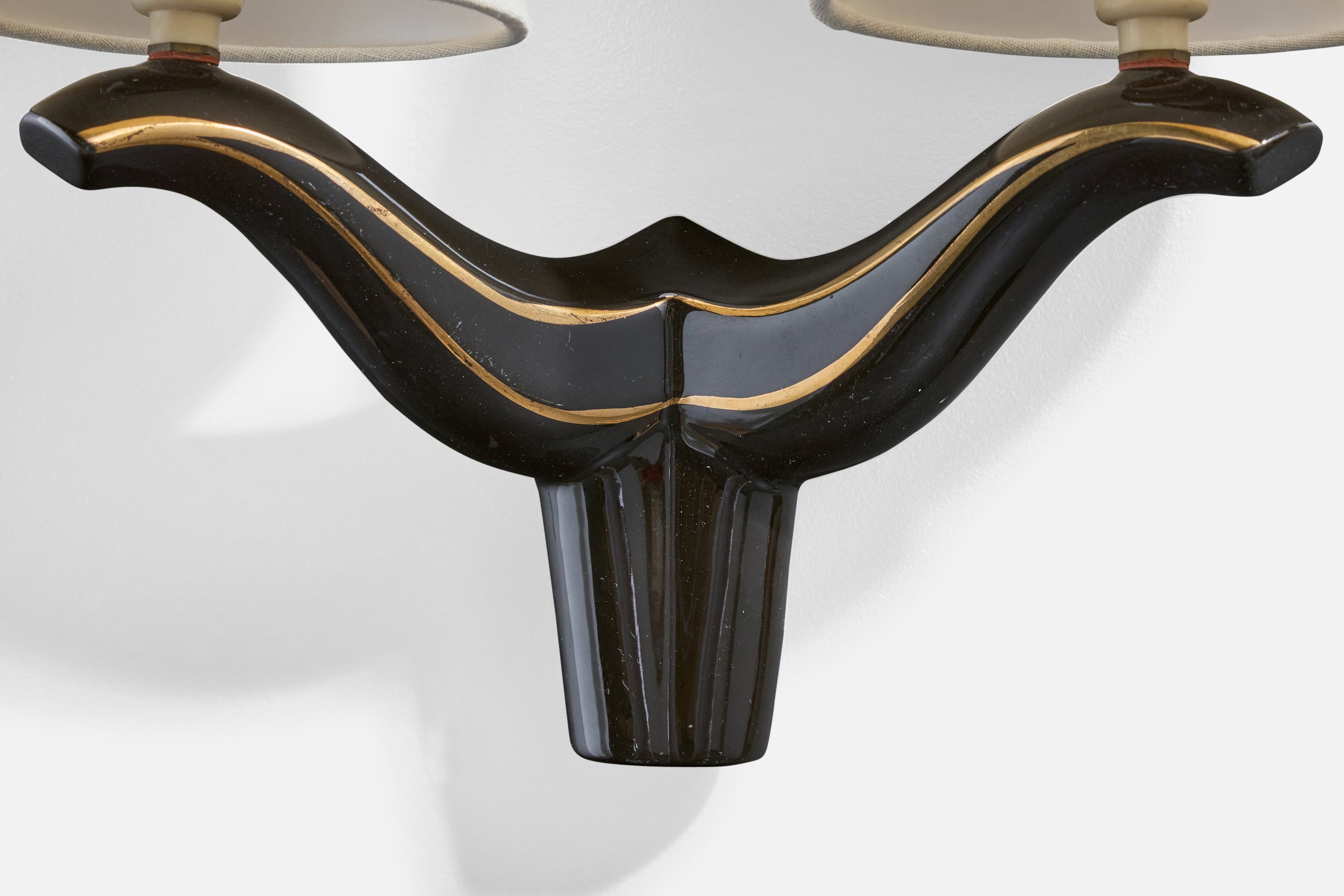 A black-glazed, gold-painted ceramic and white fabric wall light designed and produced in France, c. 1960s.
