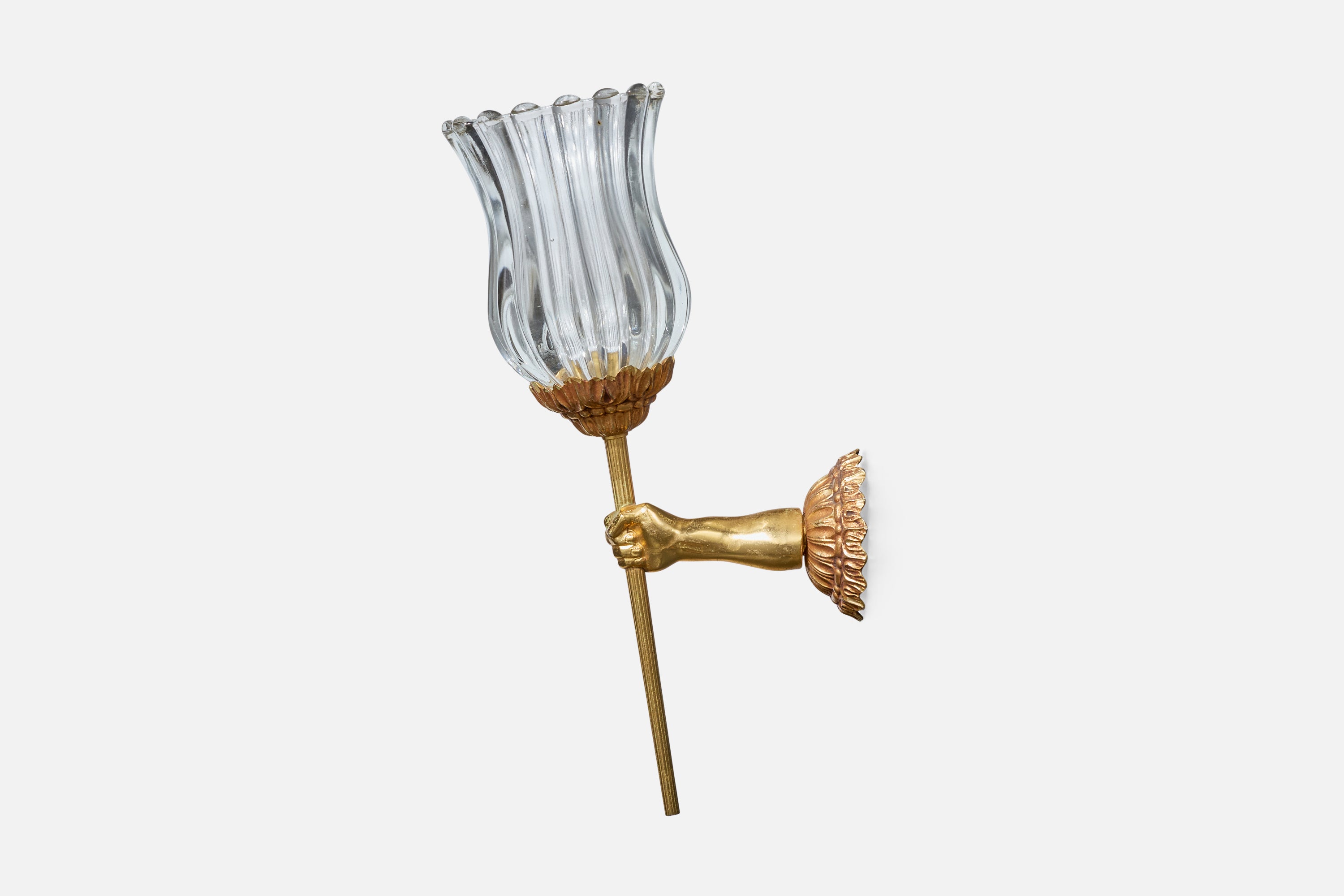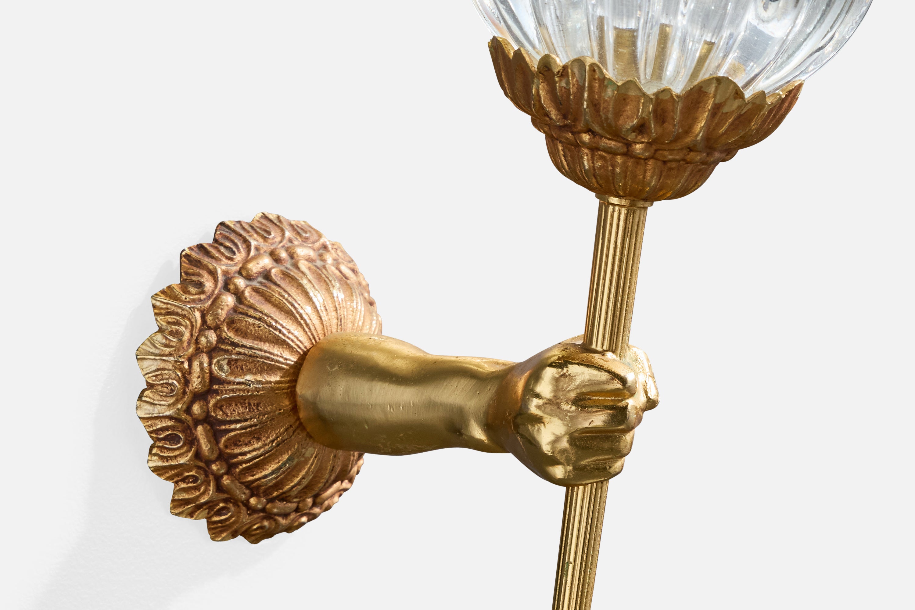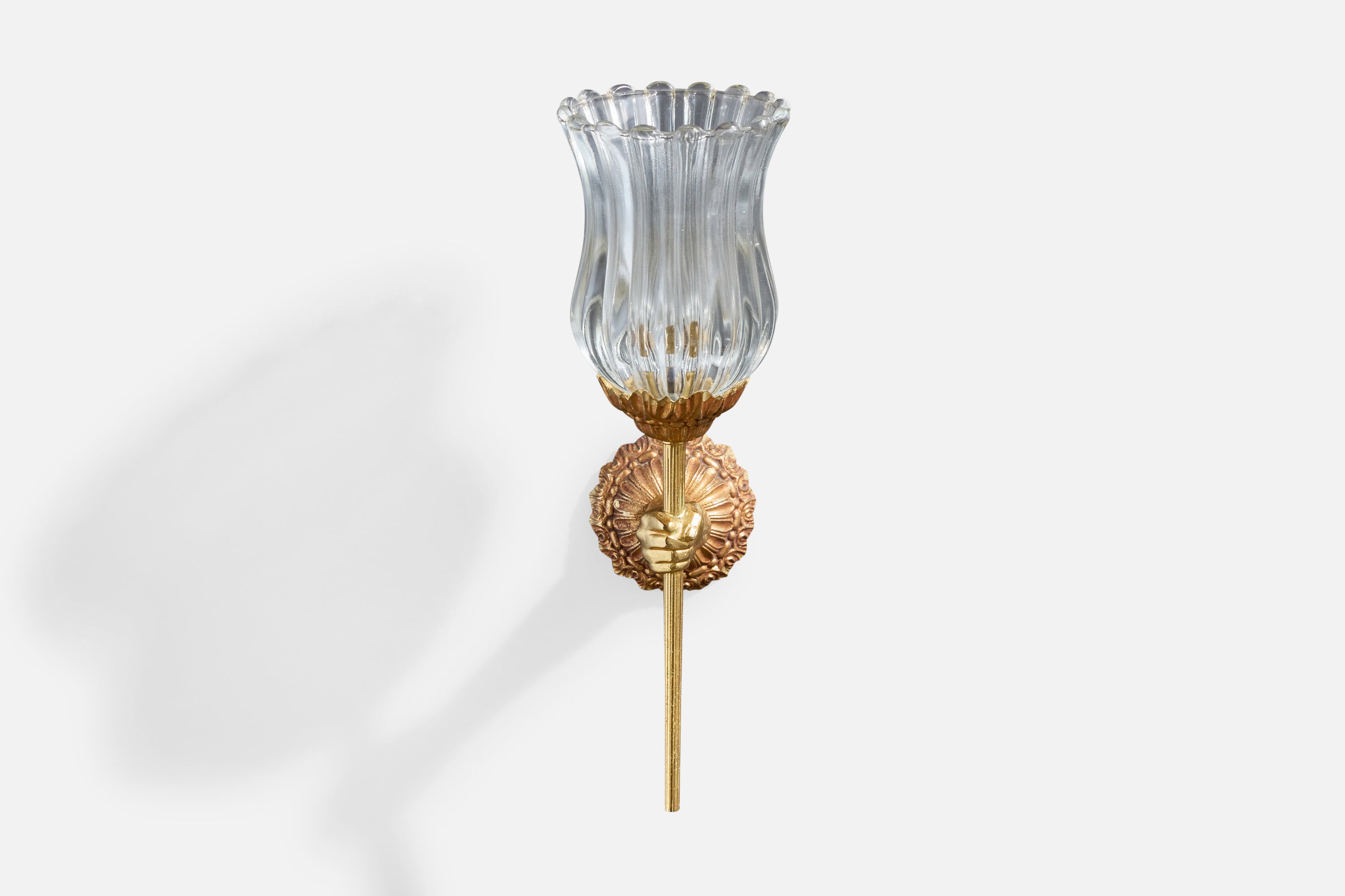 A brass and glass wall light designed and produced in France, c. 1950s.