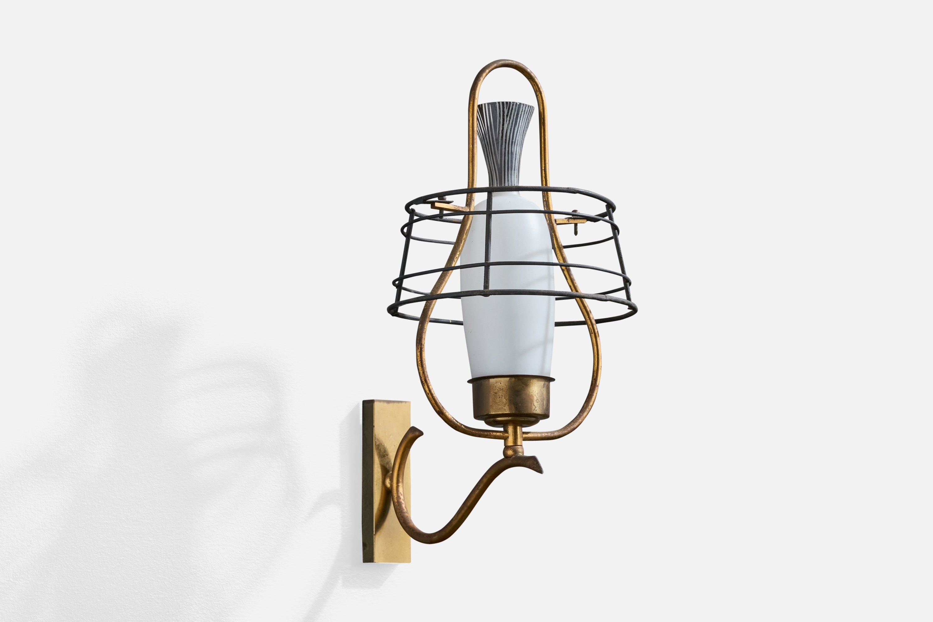 A pair of brass, glass and black-lacquered metal wall lights designed and produced in Italy, c. 1950s.