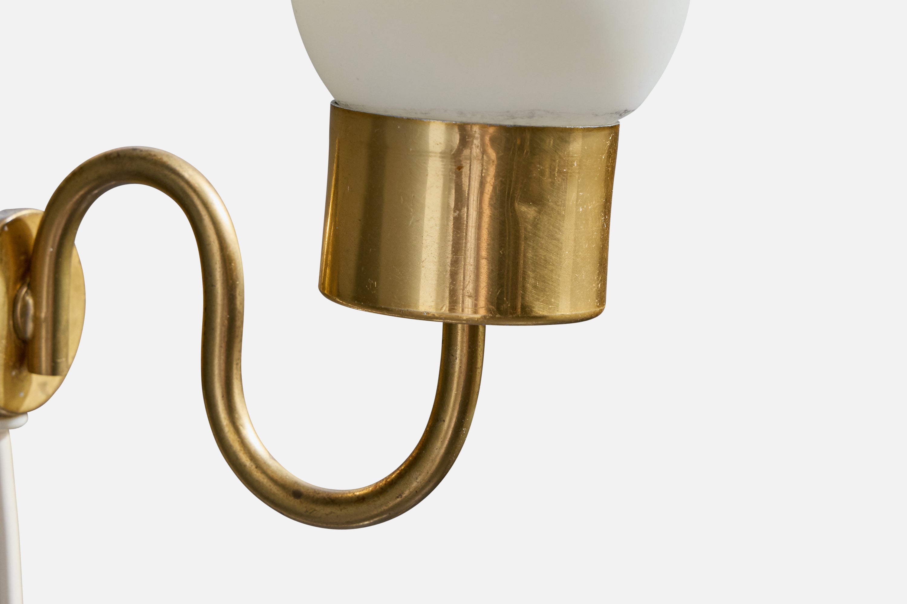 A brass and white opaline glass wall light designed and produced in Sweden, c. 1940s.