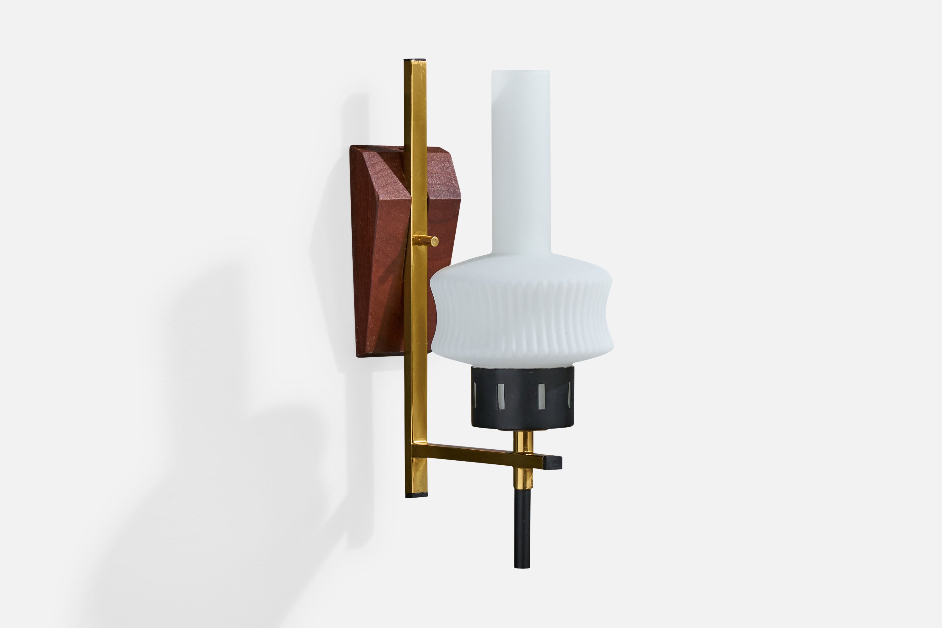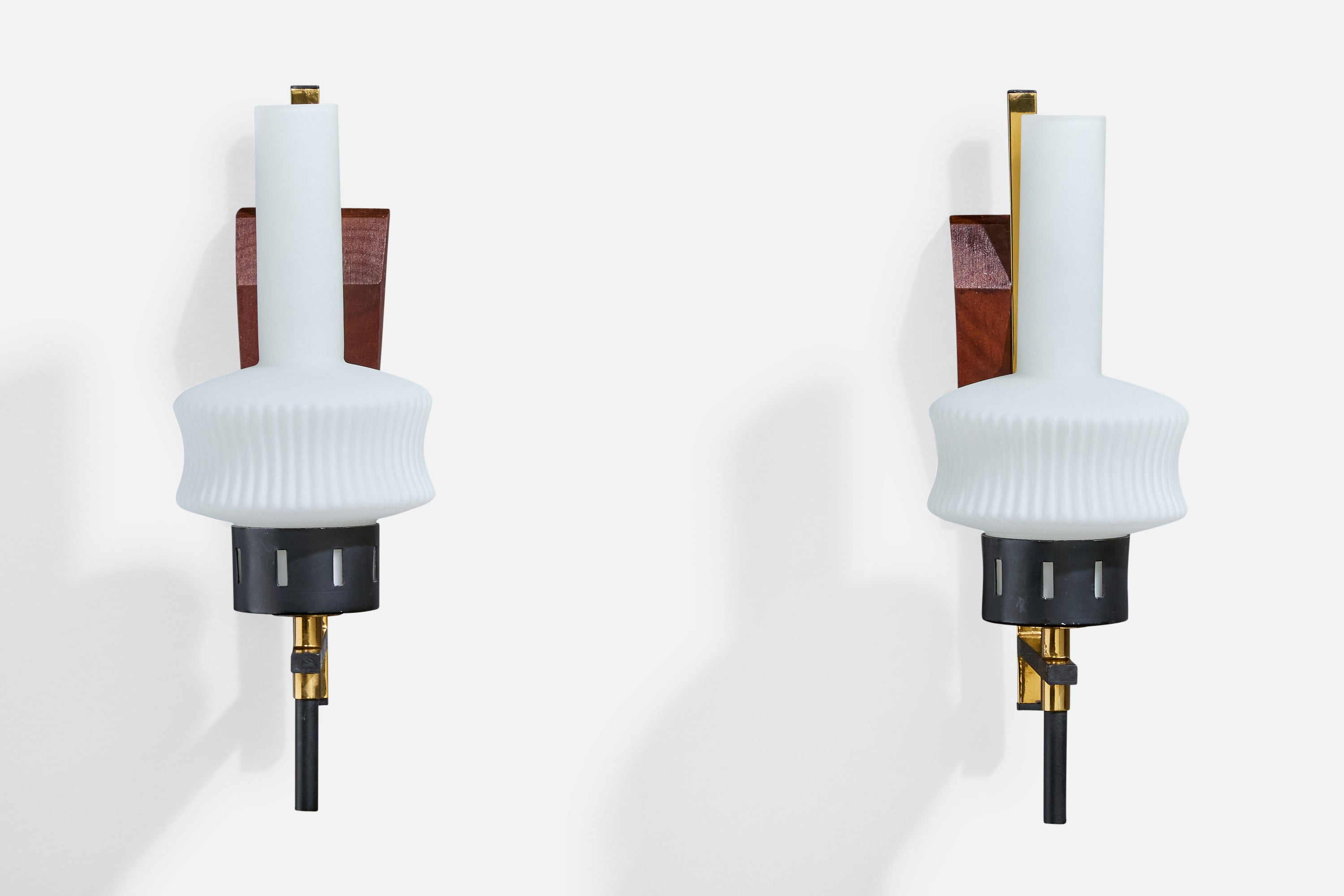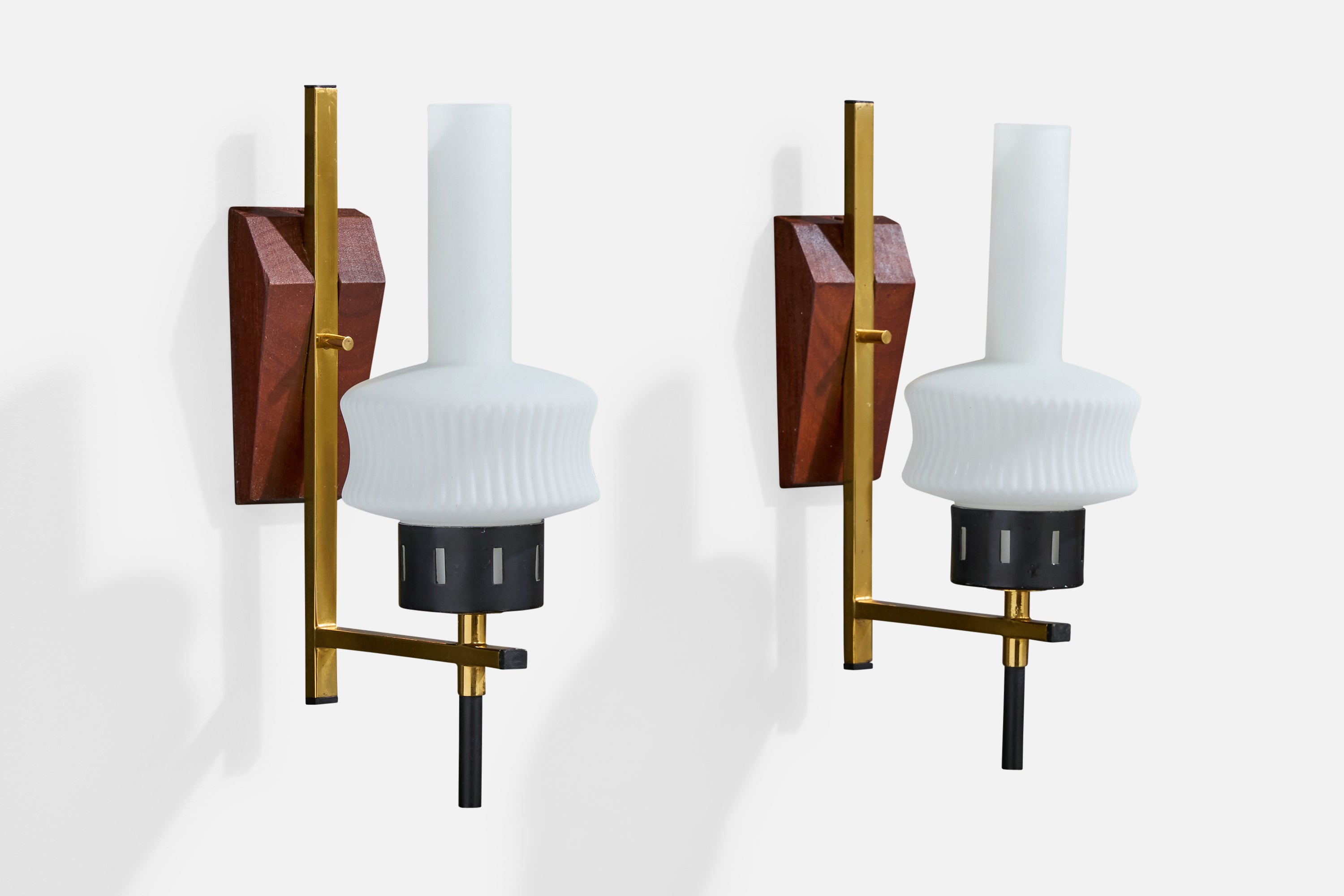 A pair of teak, brass, black-lacquered metal and white opaline glass wall lights designed and produced in Italy, c. 1950s.