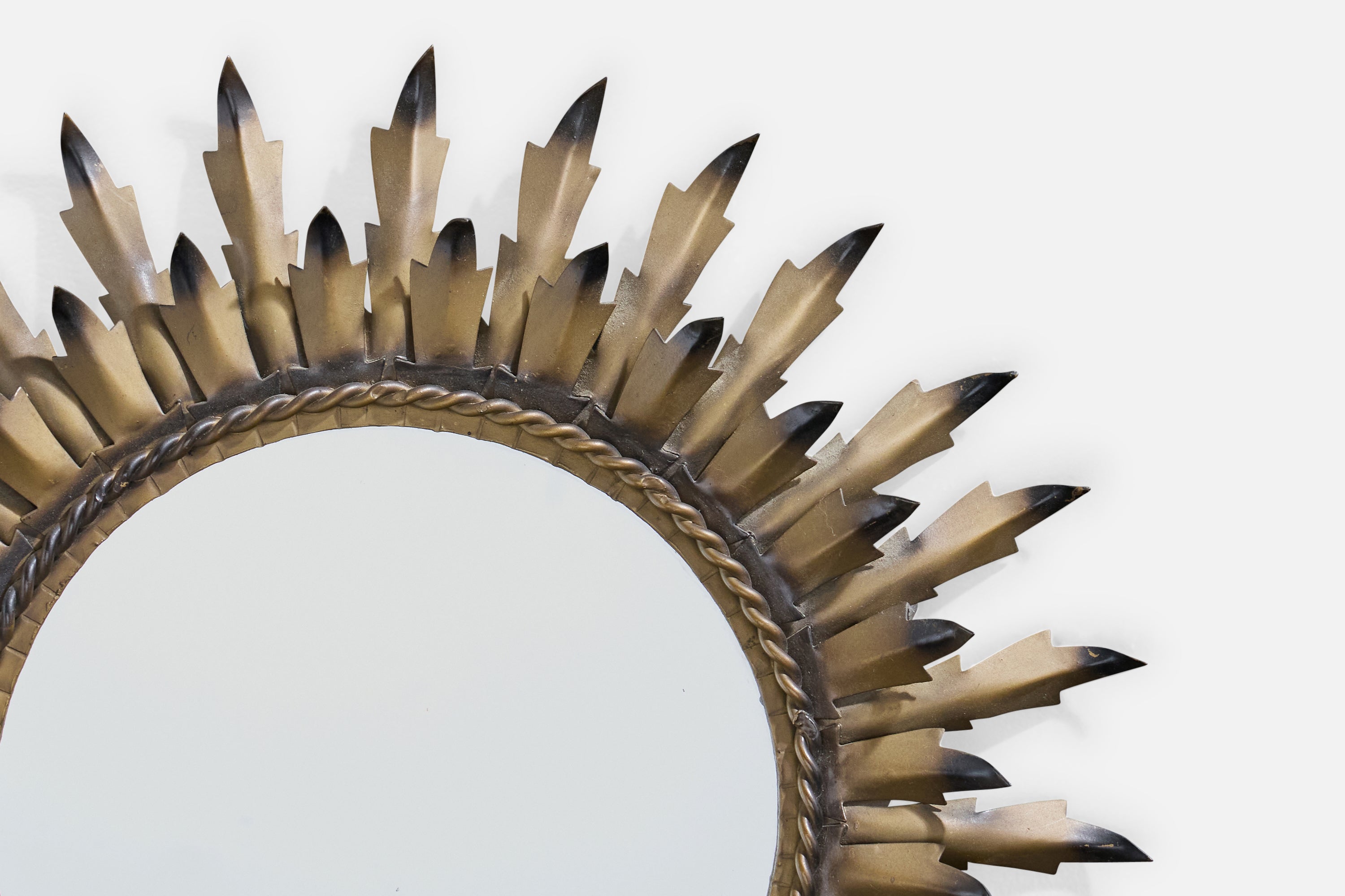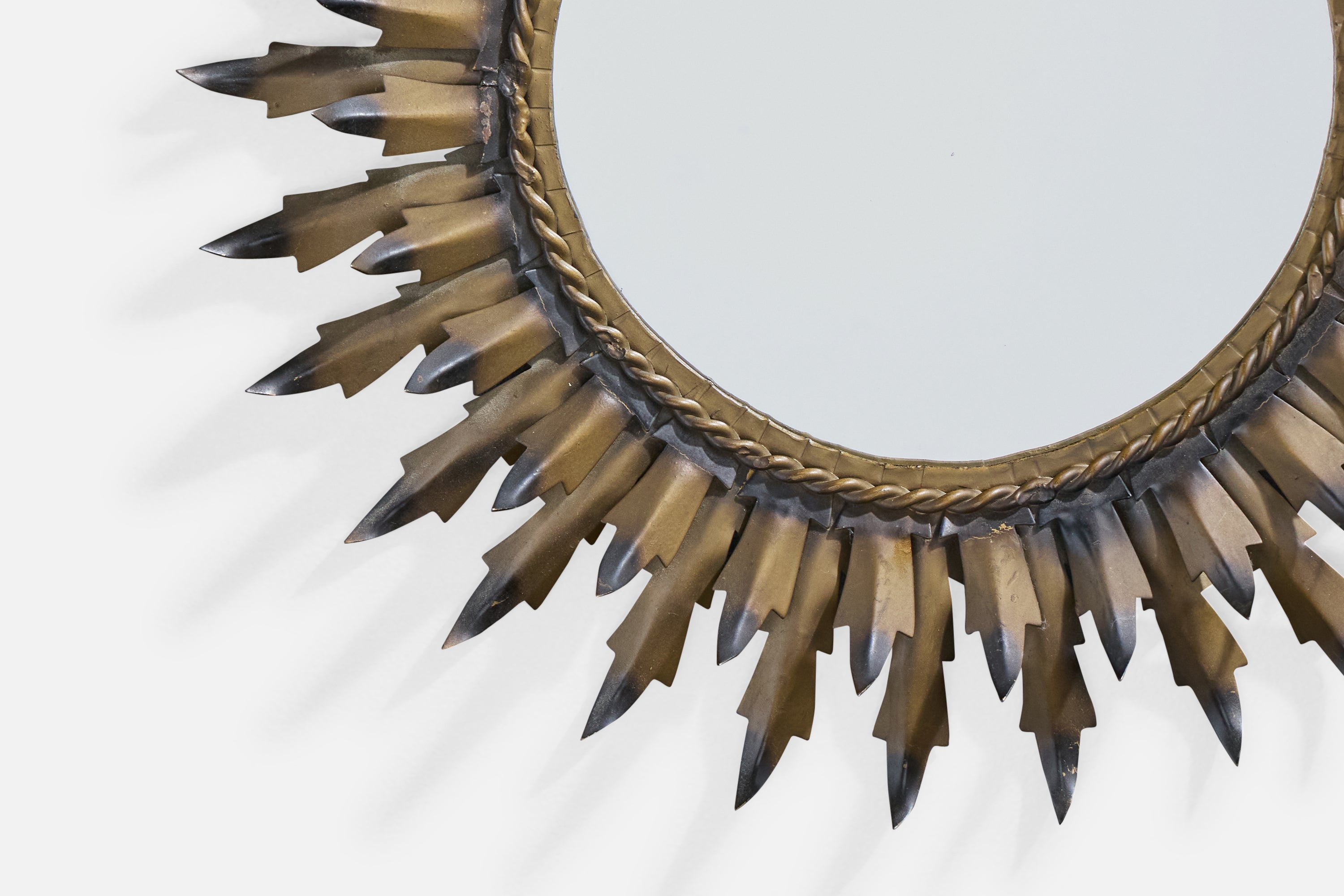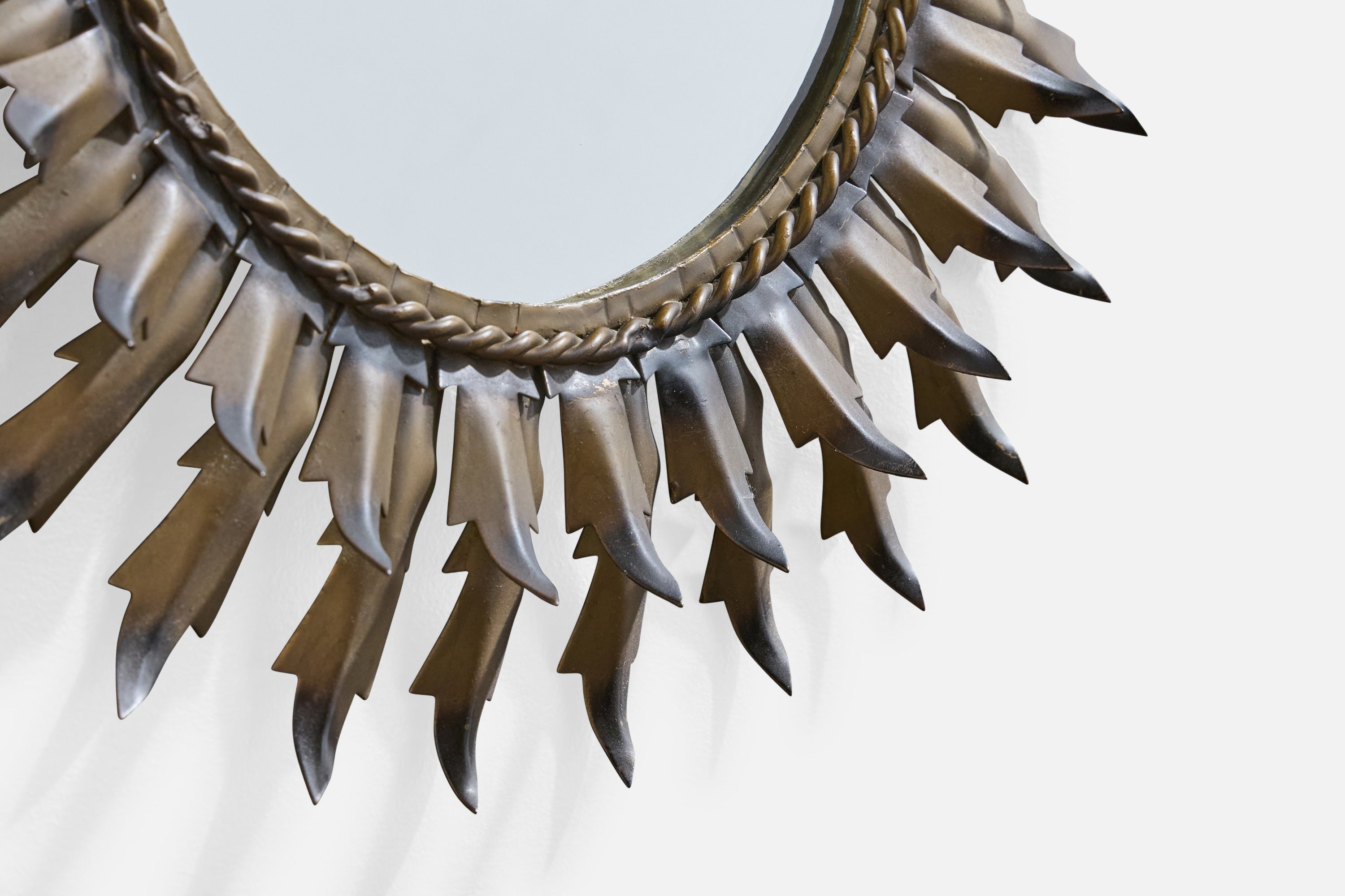 A black and bronze-lacquered metal wall mirror designed and produced in France, c. 1960s.