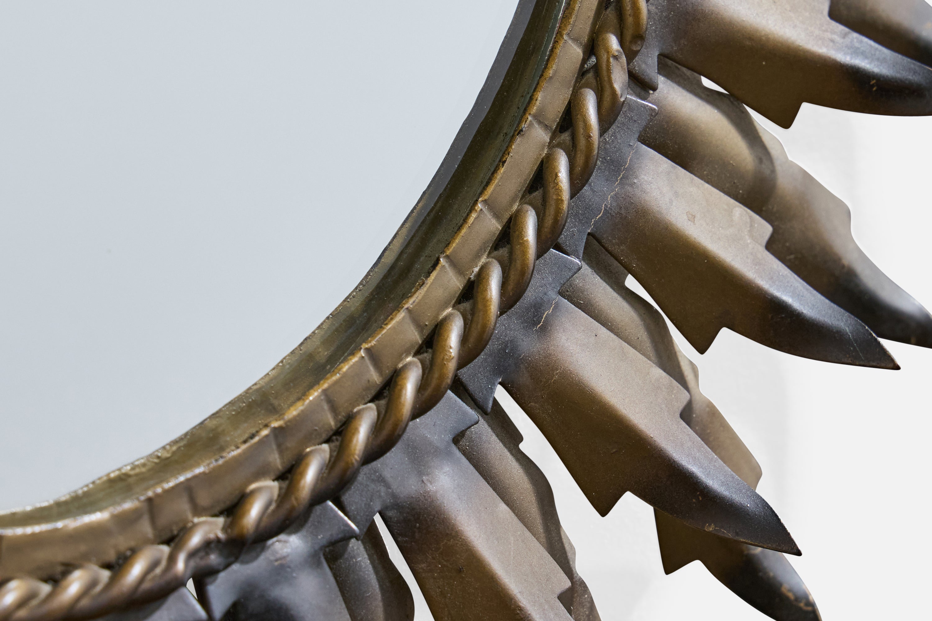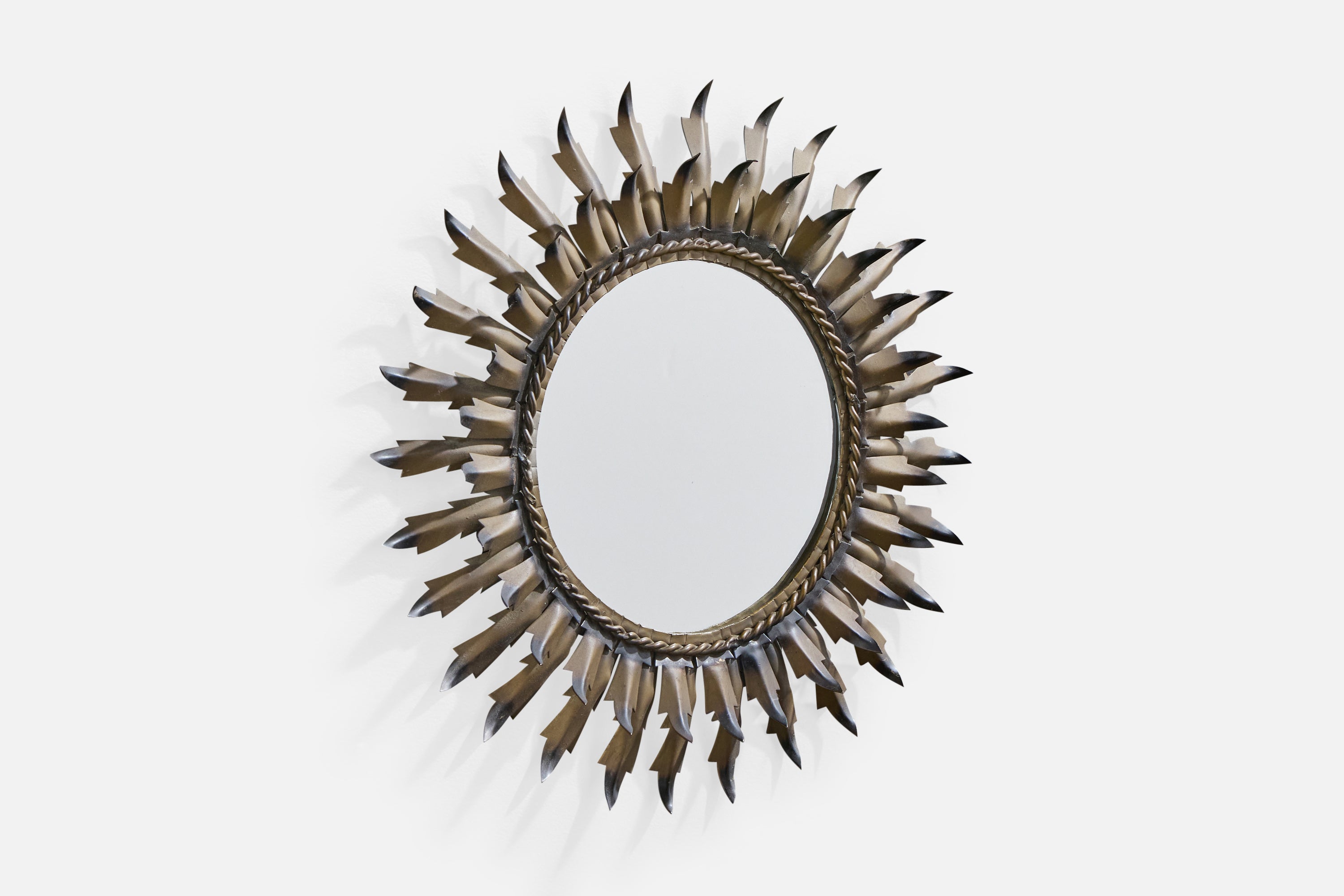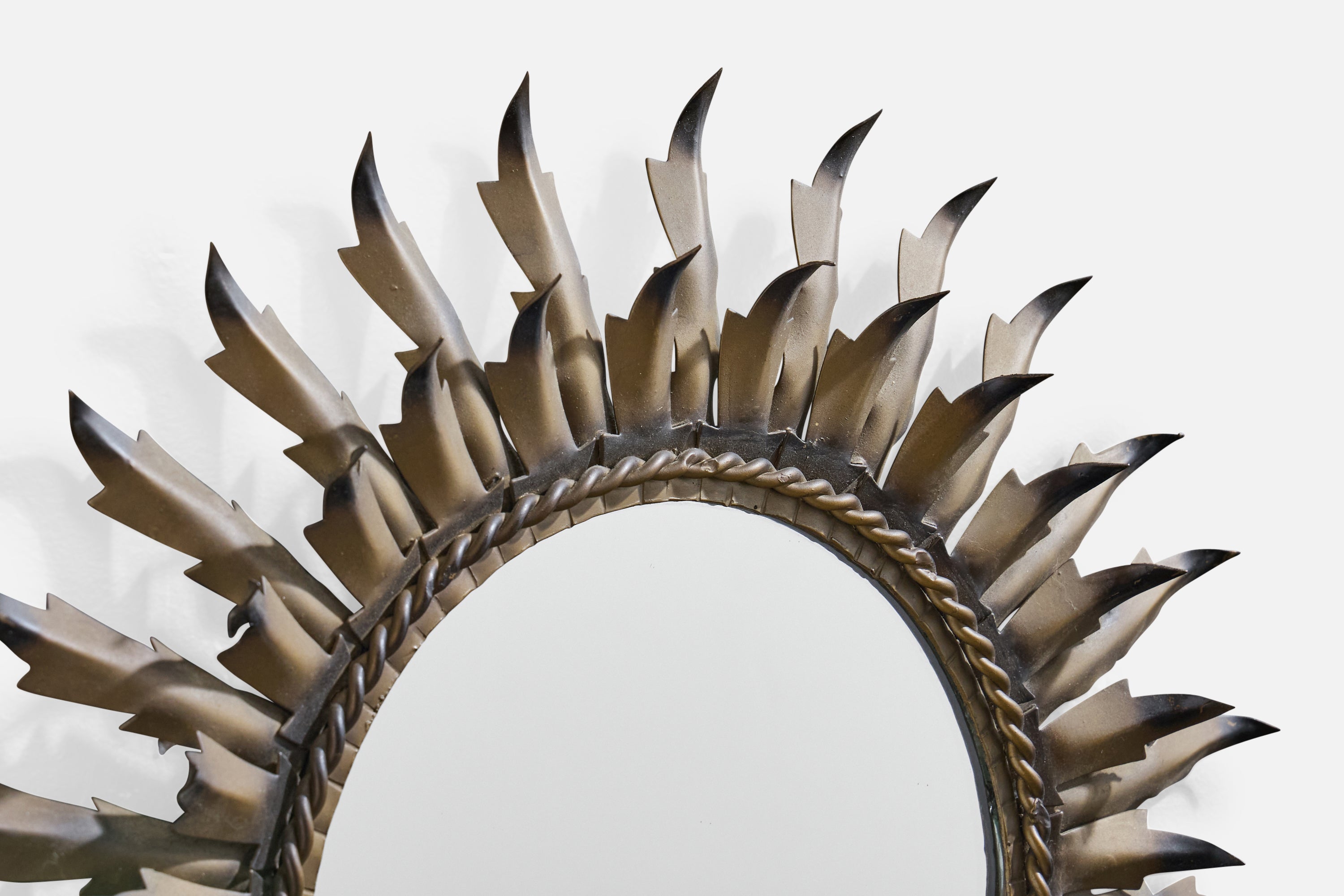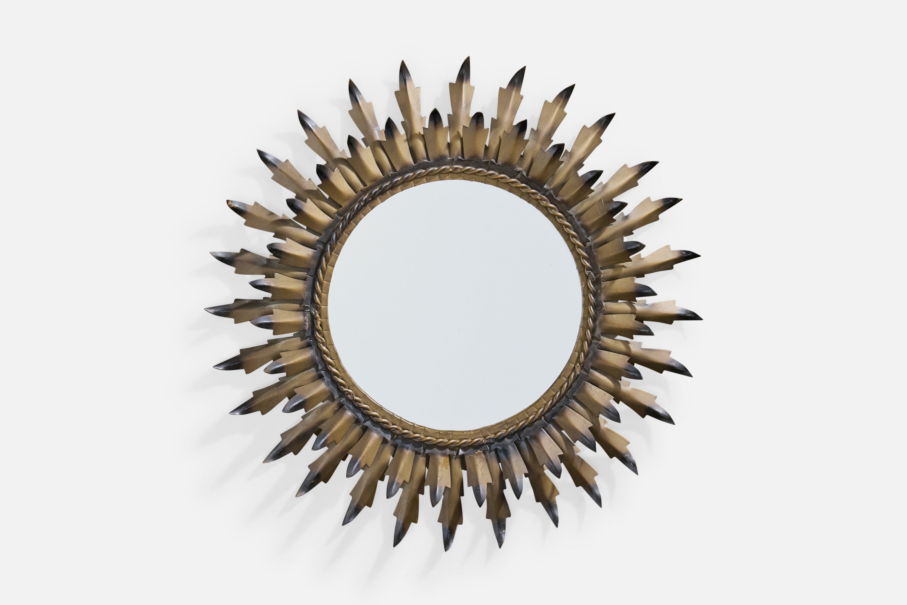 A black and bronze-lacquered metal wall mirror designed and produced in France, c. 1960s.