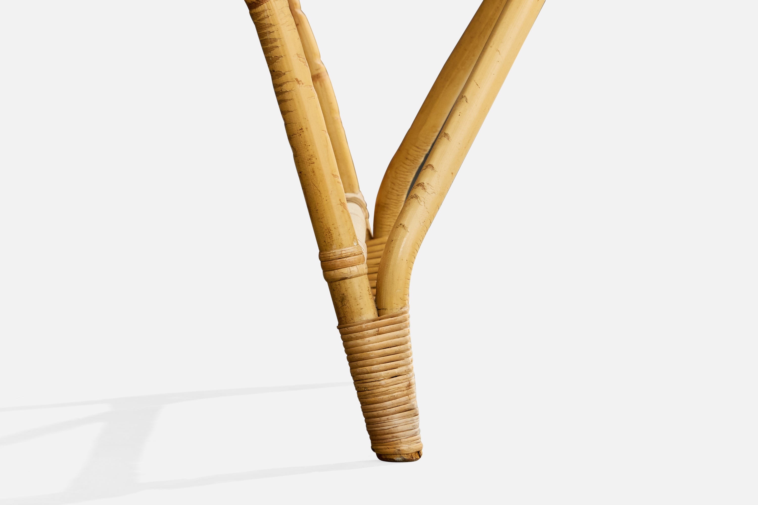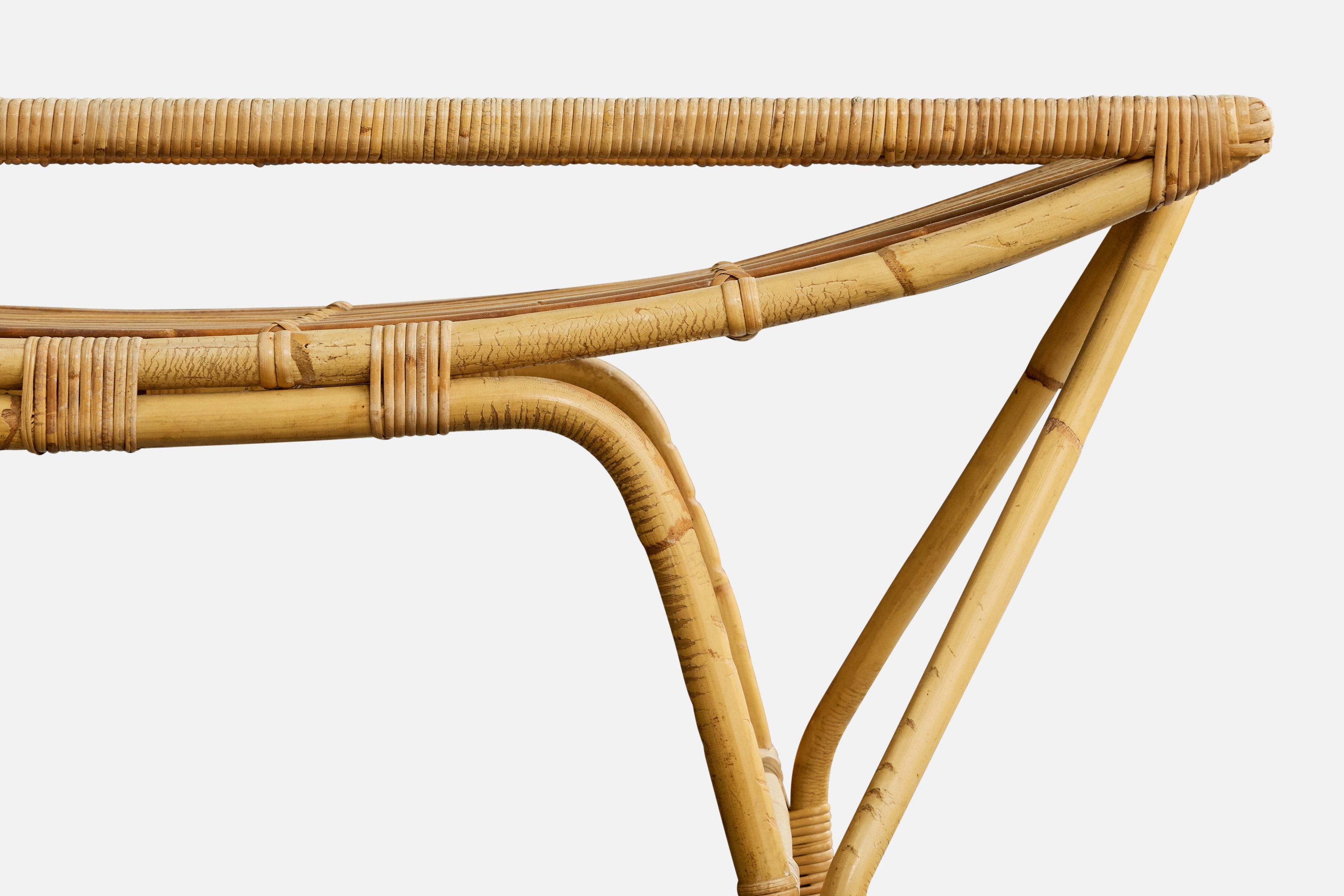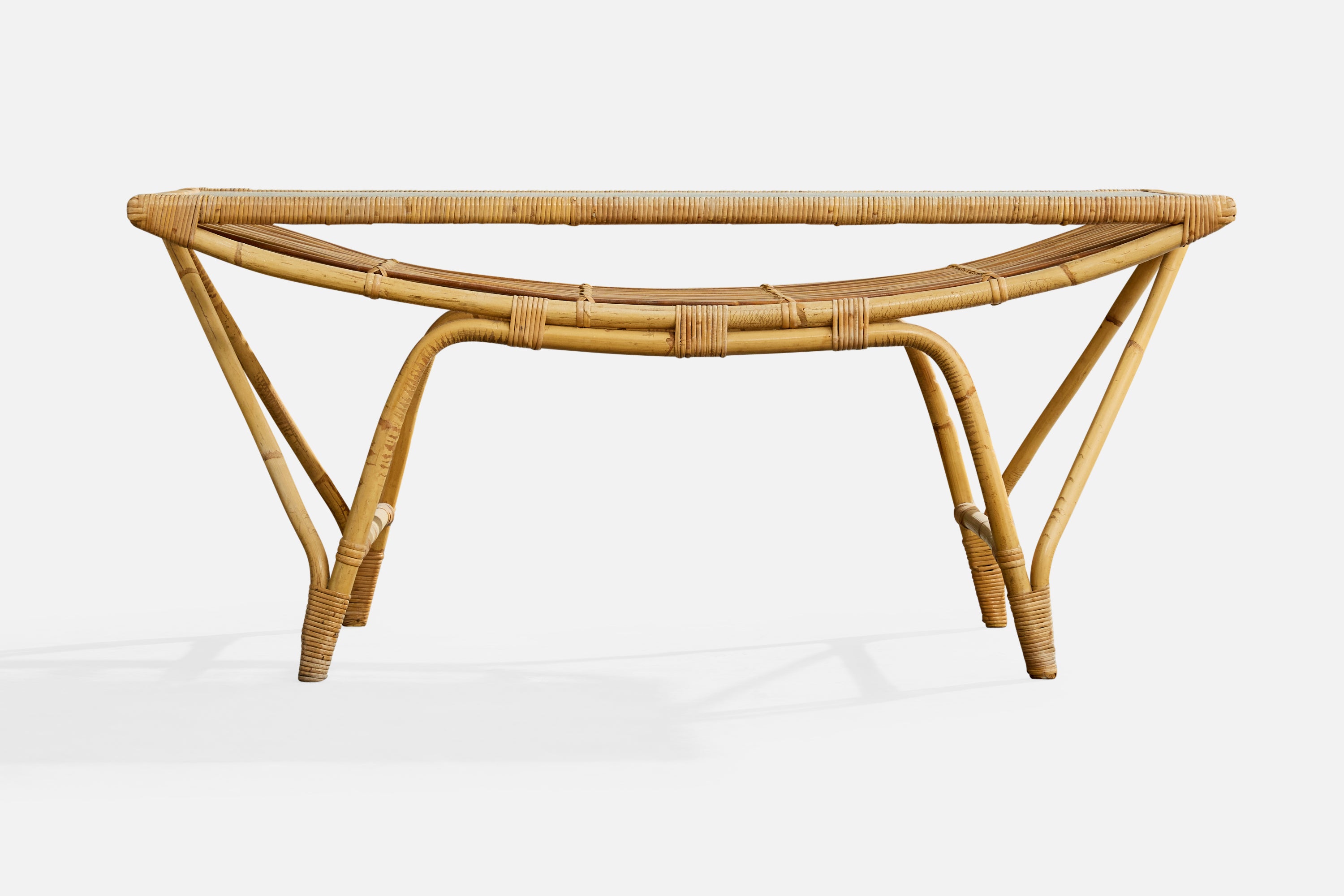 A bamboo, rattan and glass coffee table designed and produced in Denmark, c. 1950s.