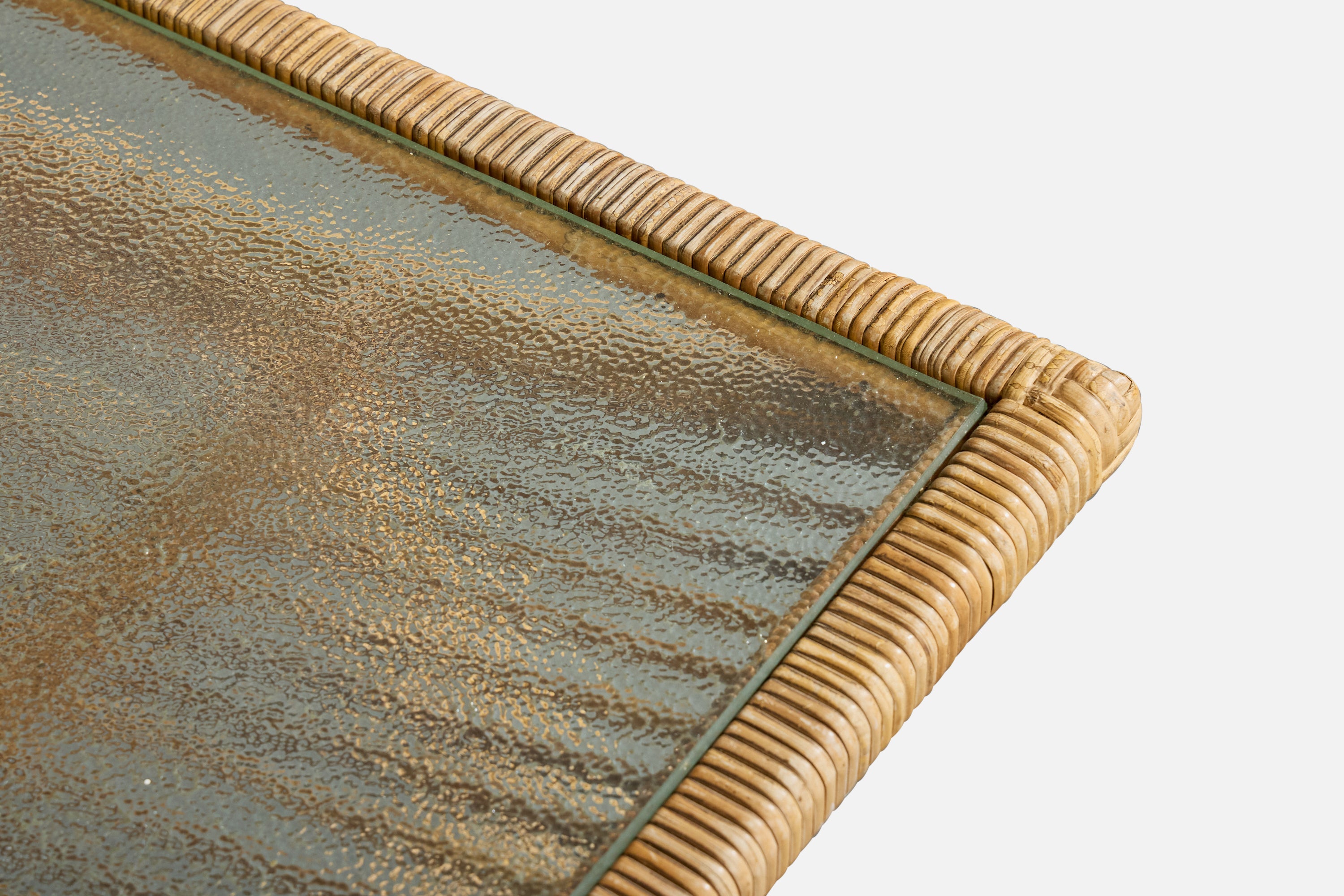 Moderate to heavy wear to rattan. Patina buildup between rattan of tabletop edges.