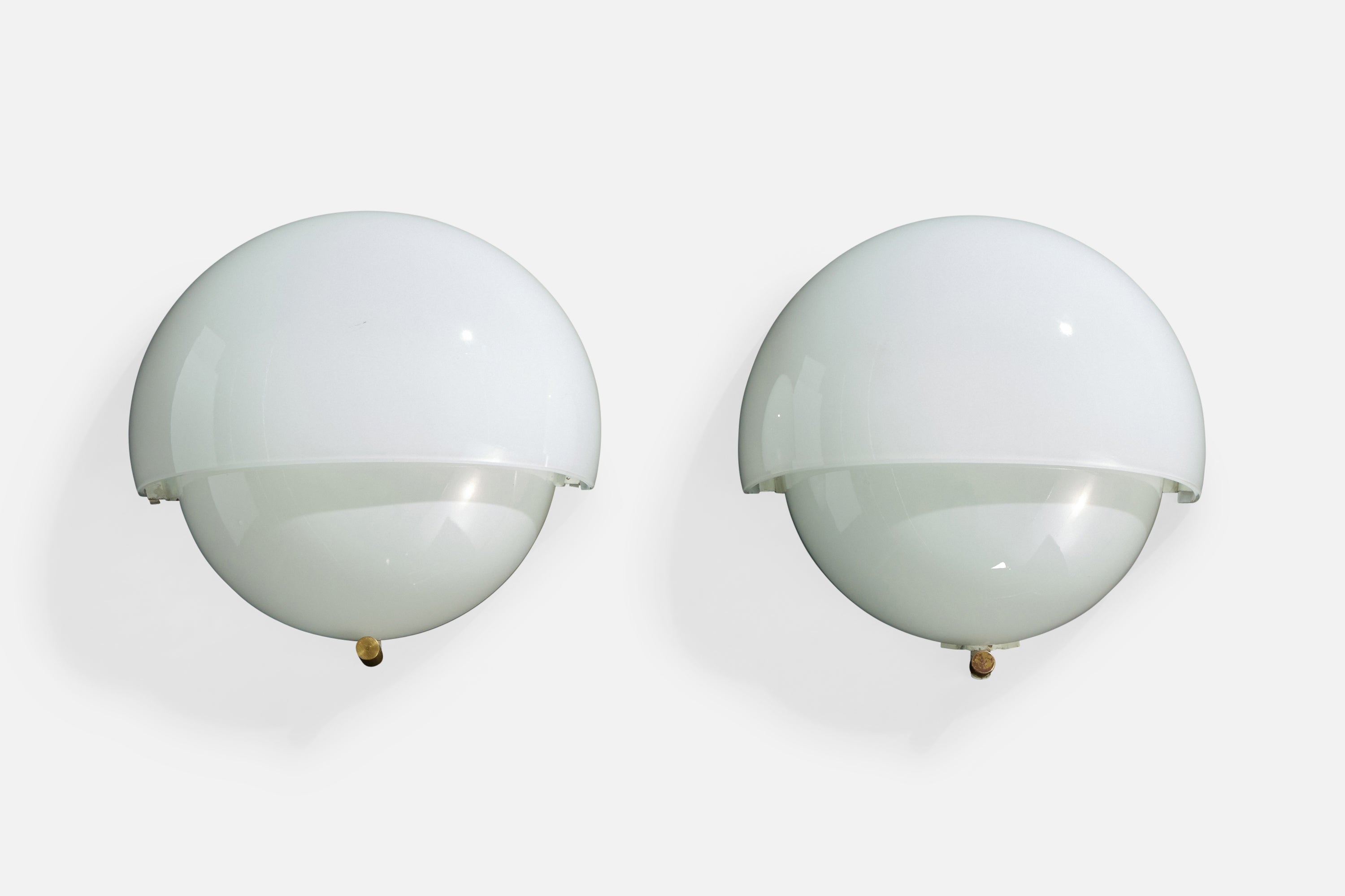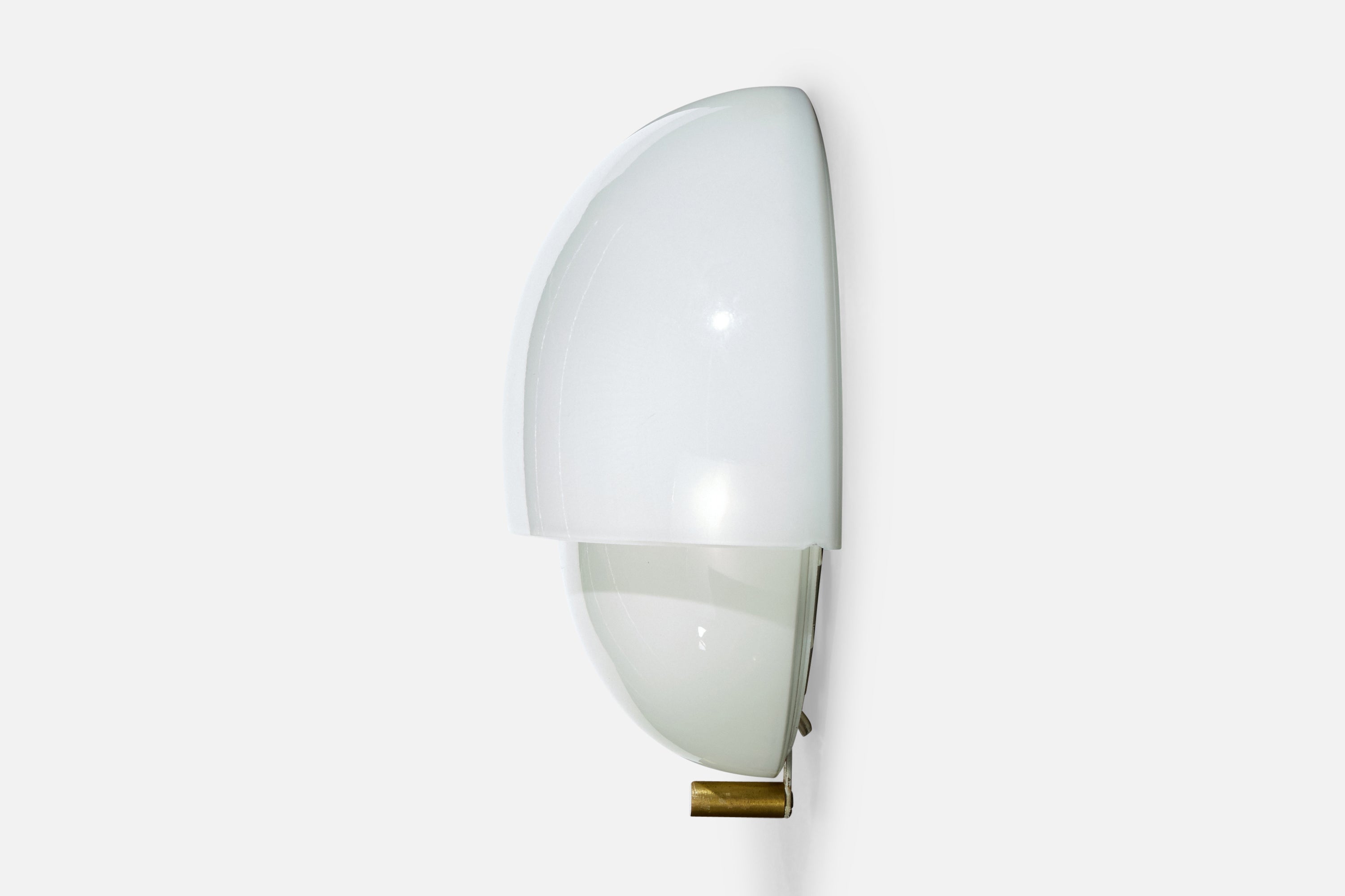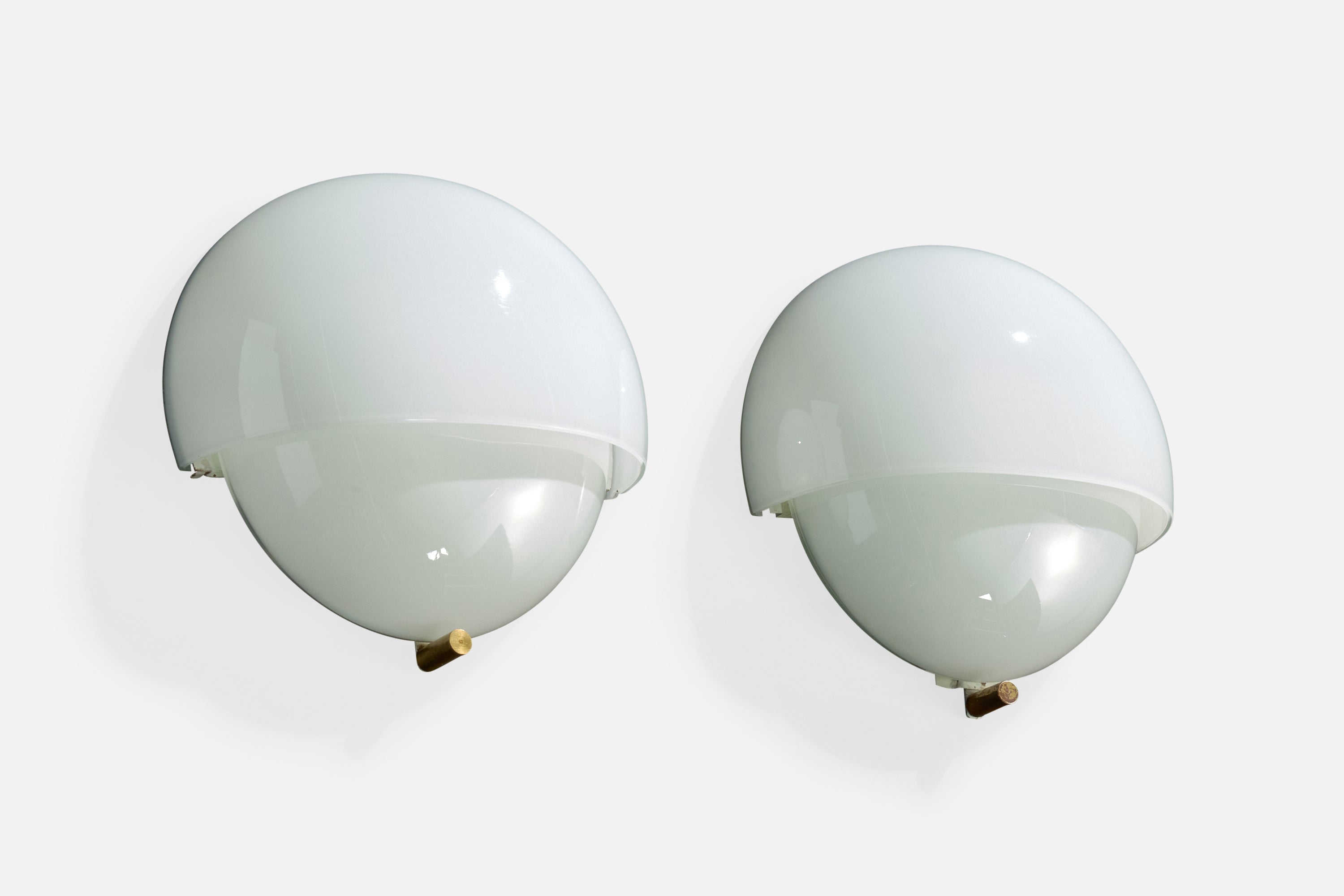 A pair of white opaline glass and brass wall lights, model Mania, designed by Vico Magistretti and produced by Artemide, Italy, 1960s.