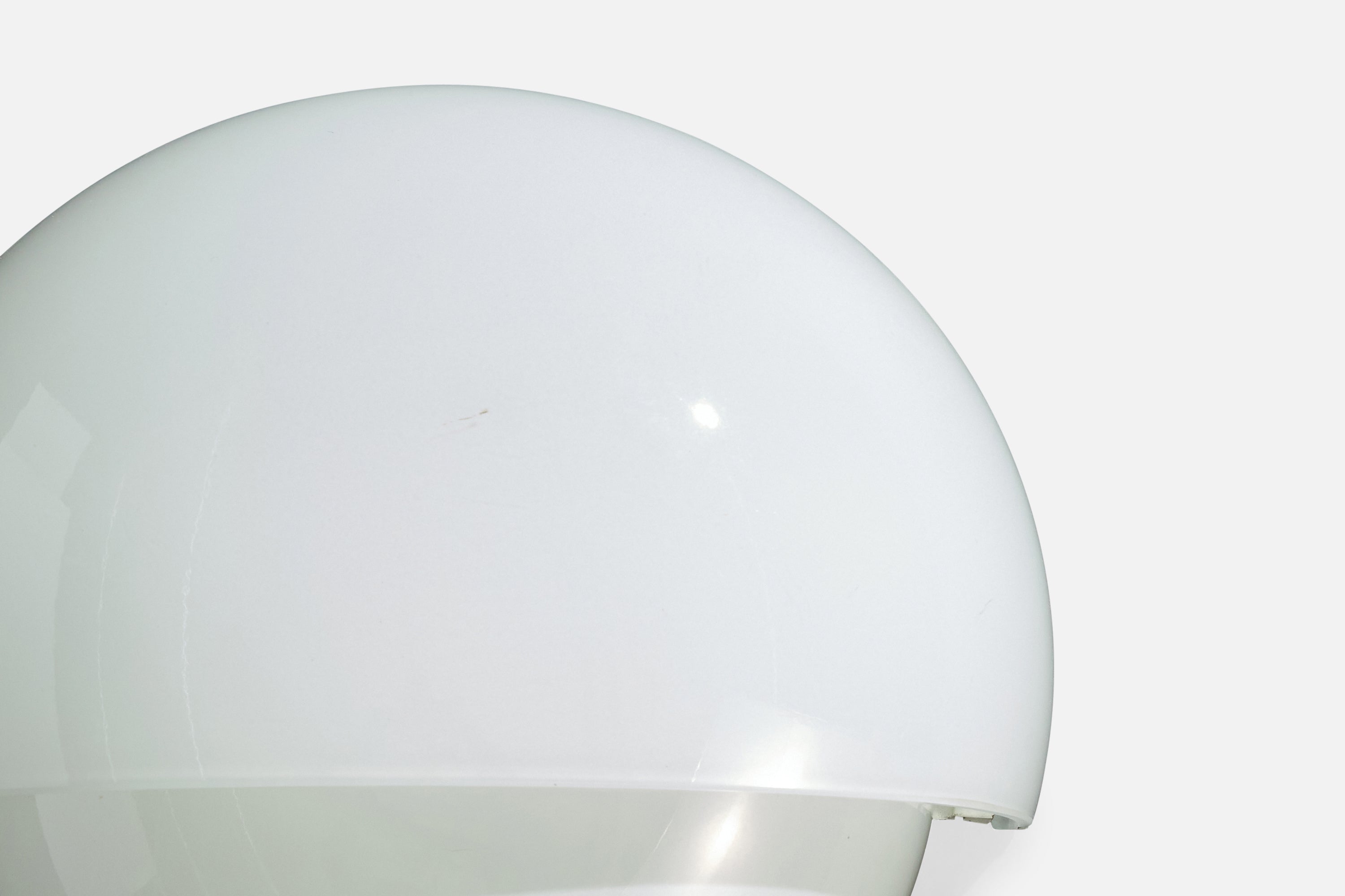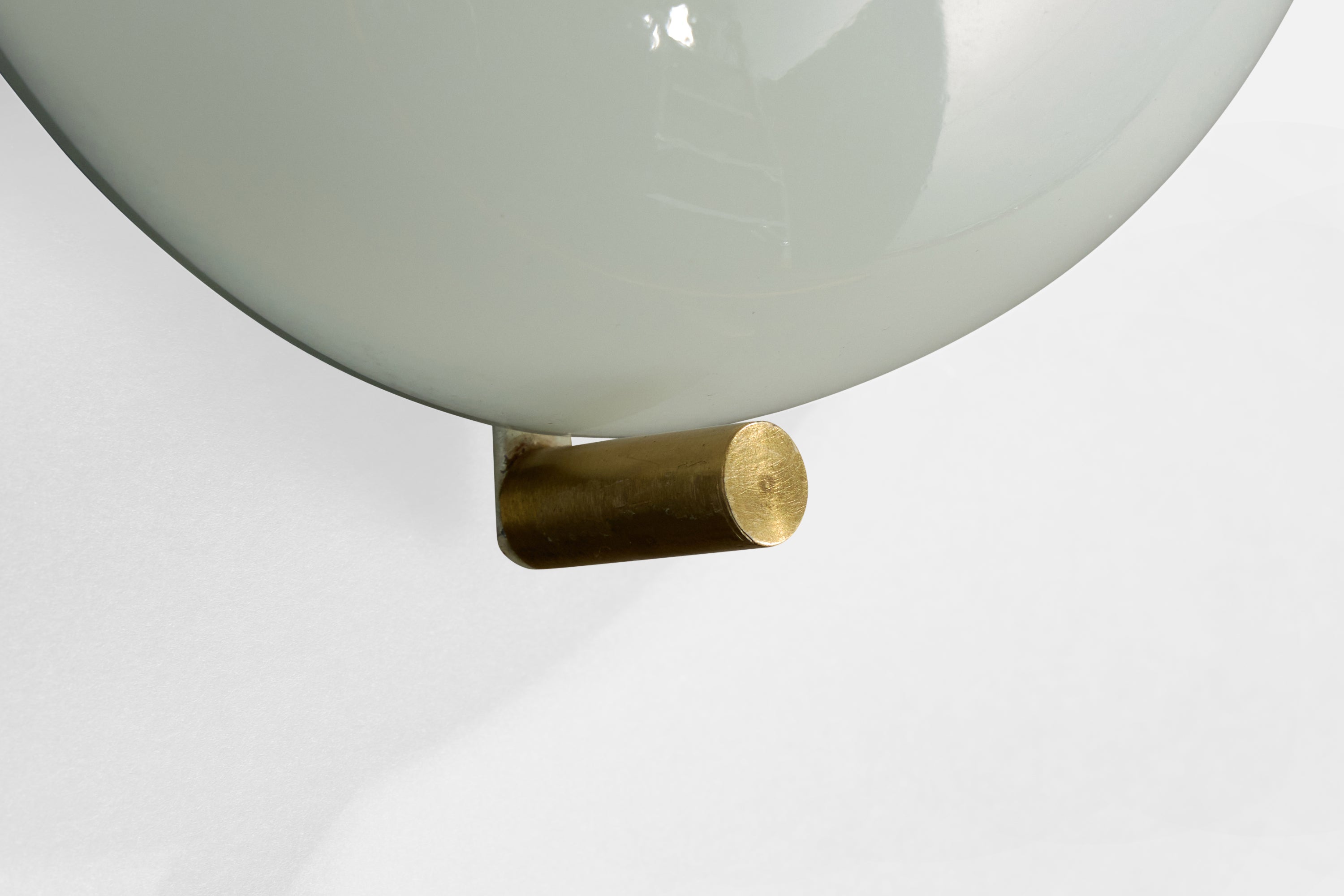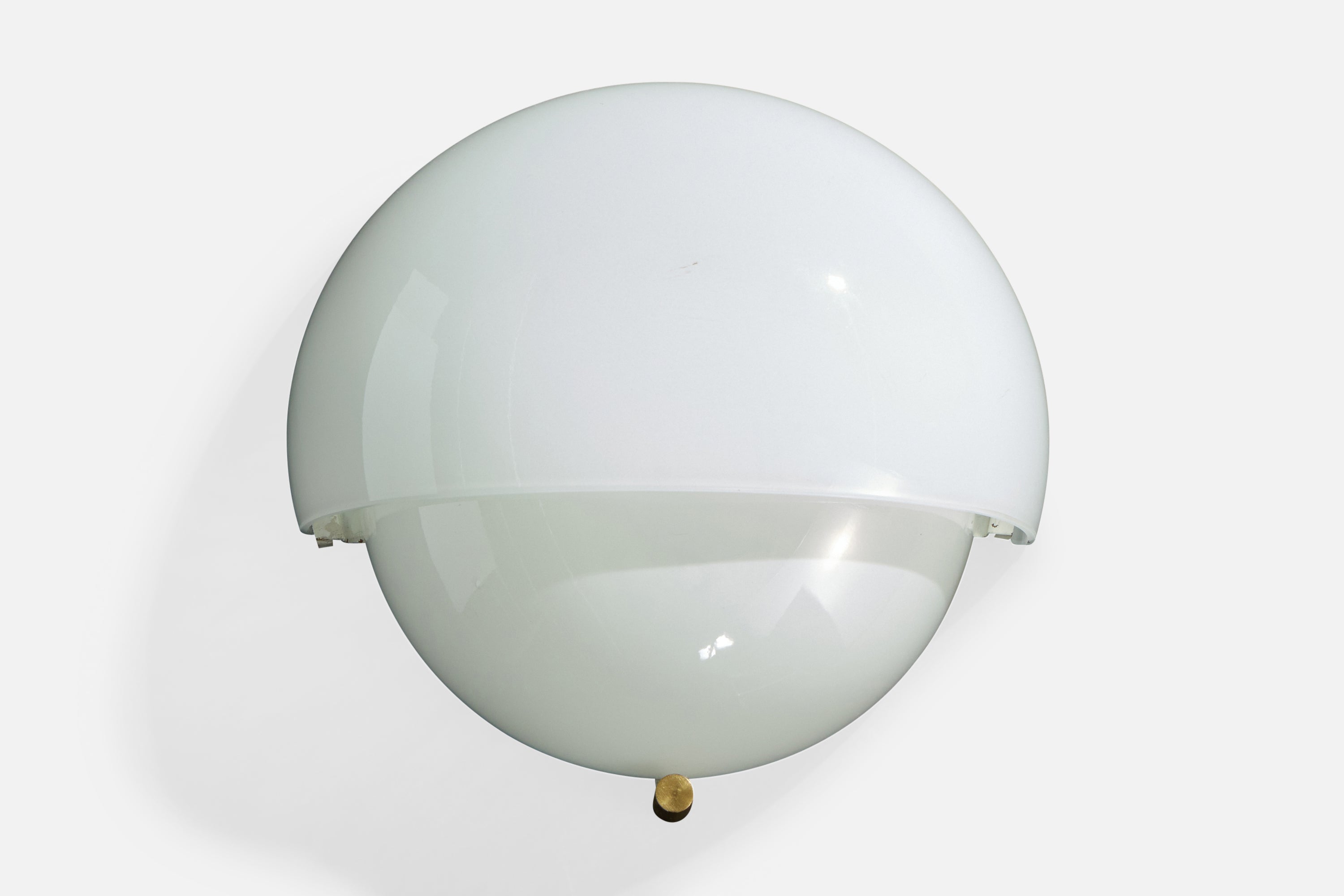A pair of white opaline glass and brass wall lights, model Mania, designed by Vico Magistretti and produced by Artemide, Italy, 1960s.