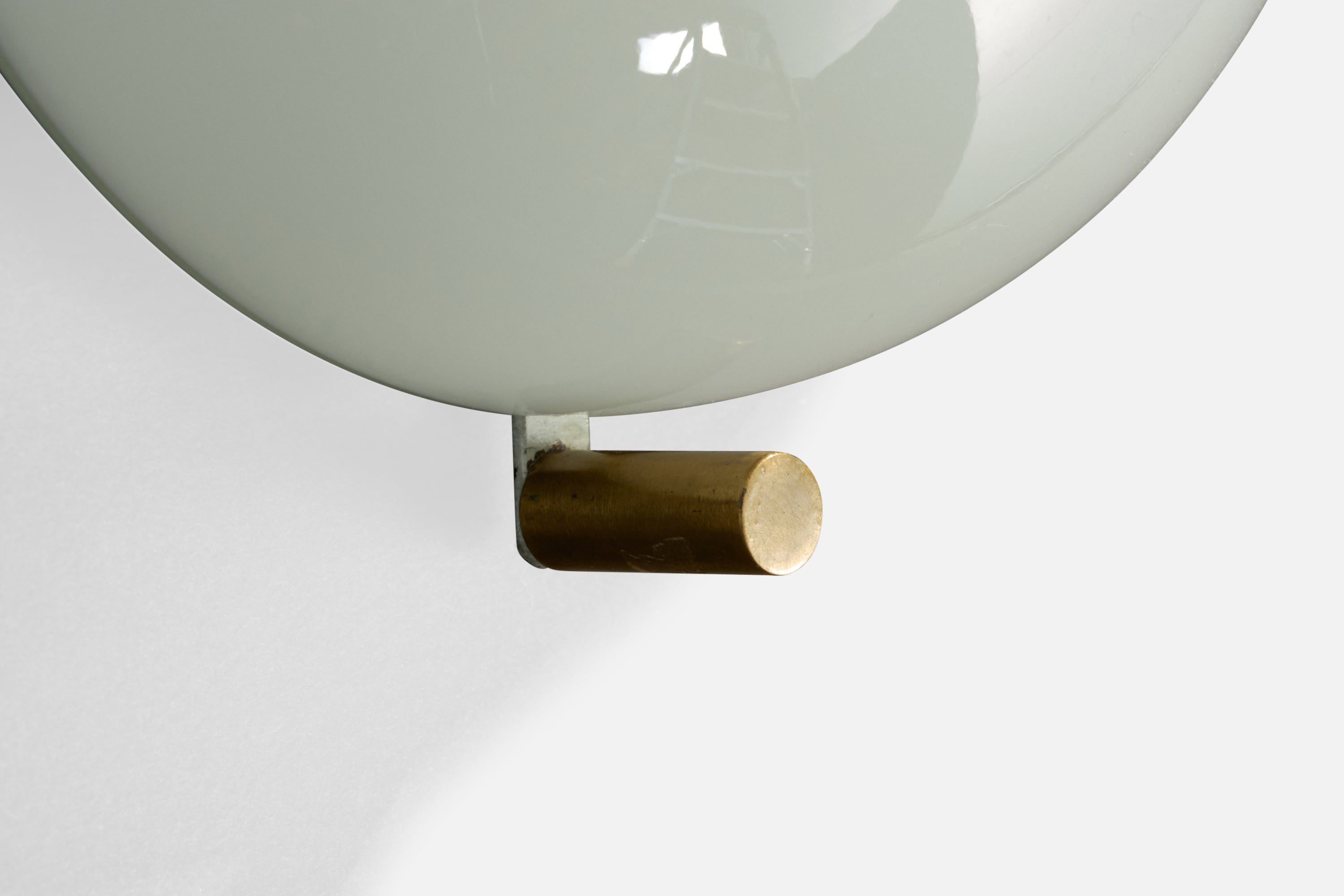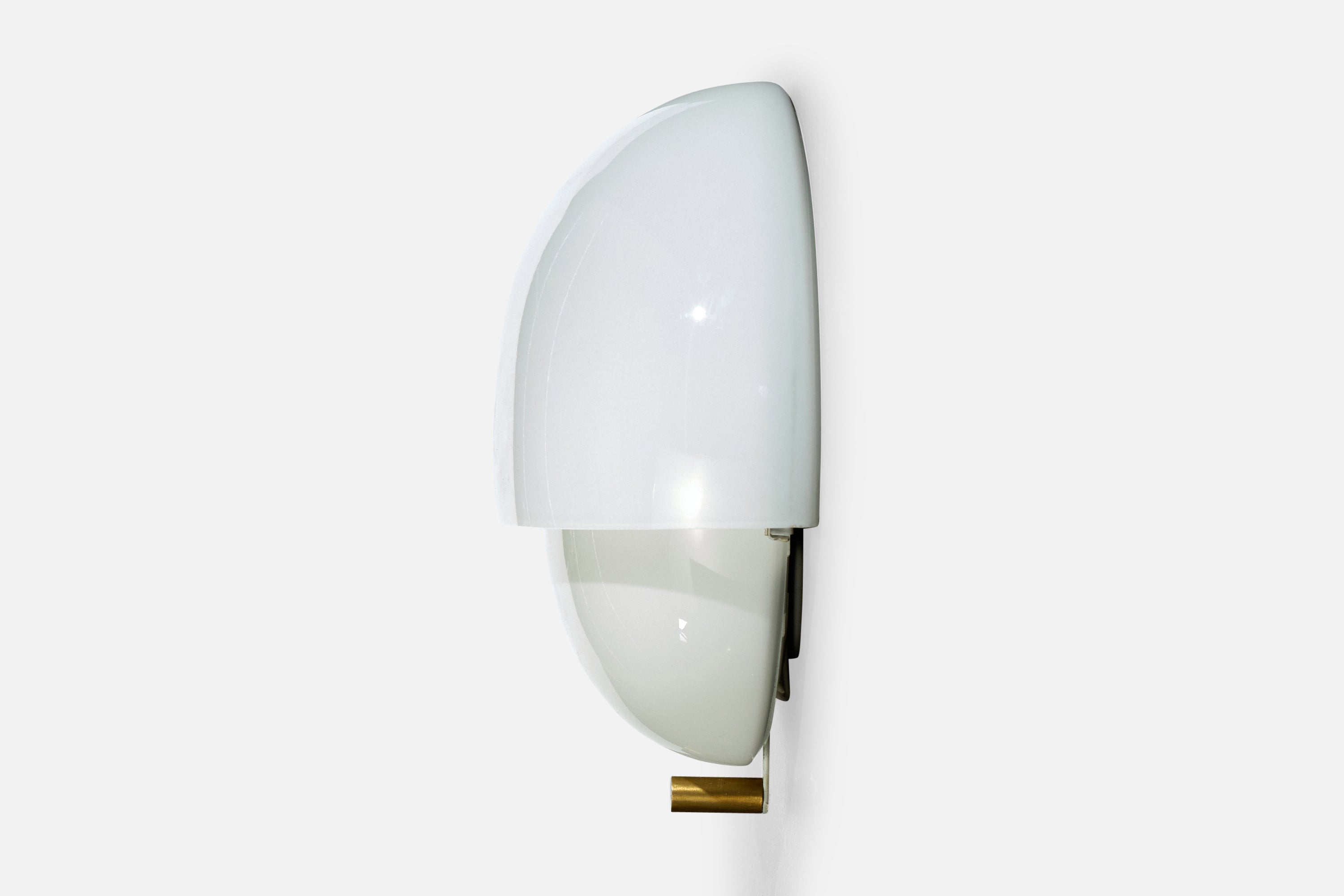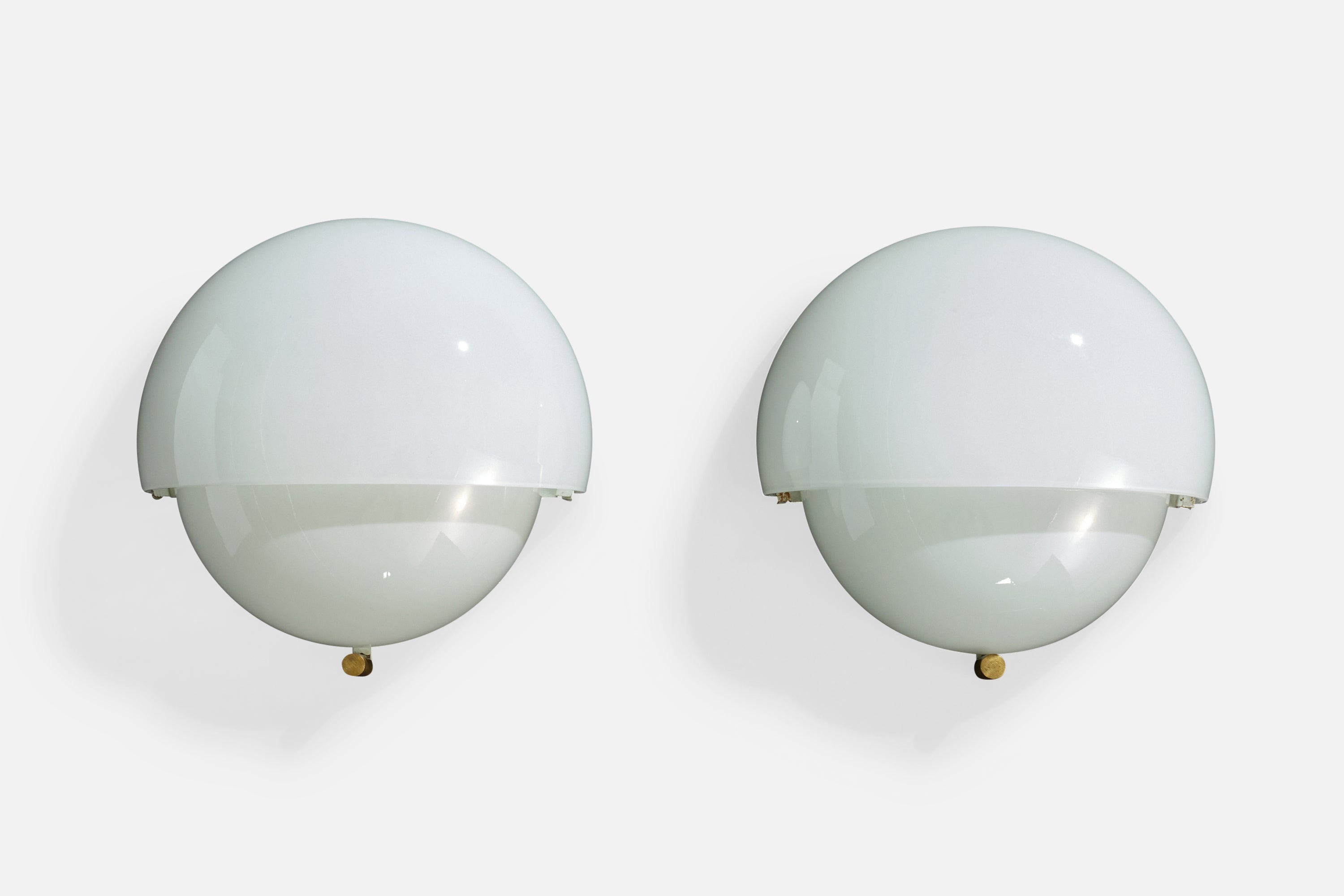 A pair of white opaline glass and brass wall lights, model Mania, designed by Vico Magistretti and produced by Artemide, Italy, 1960s.