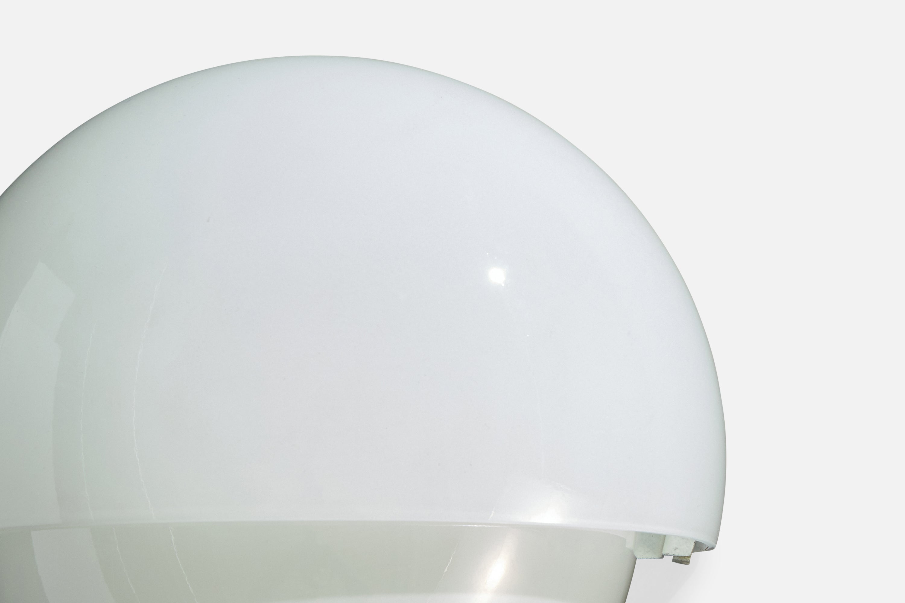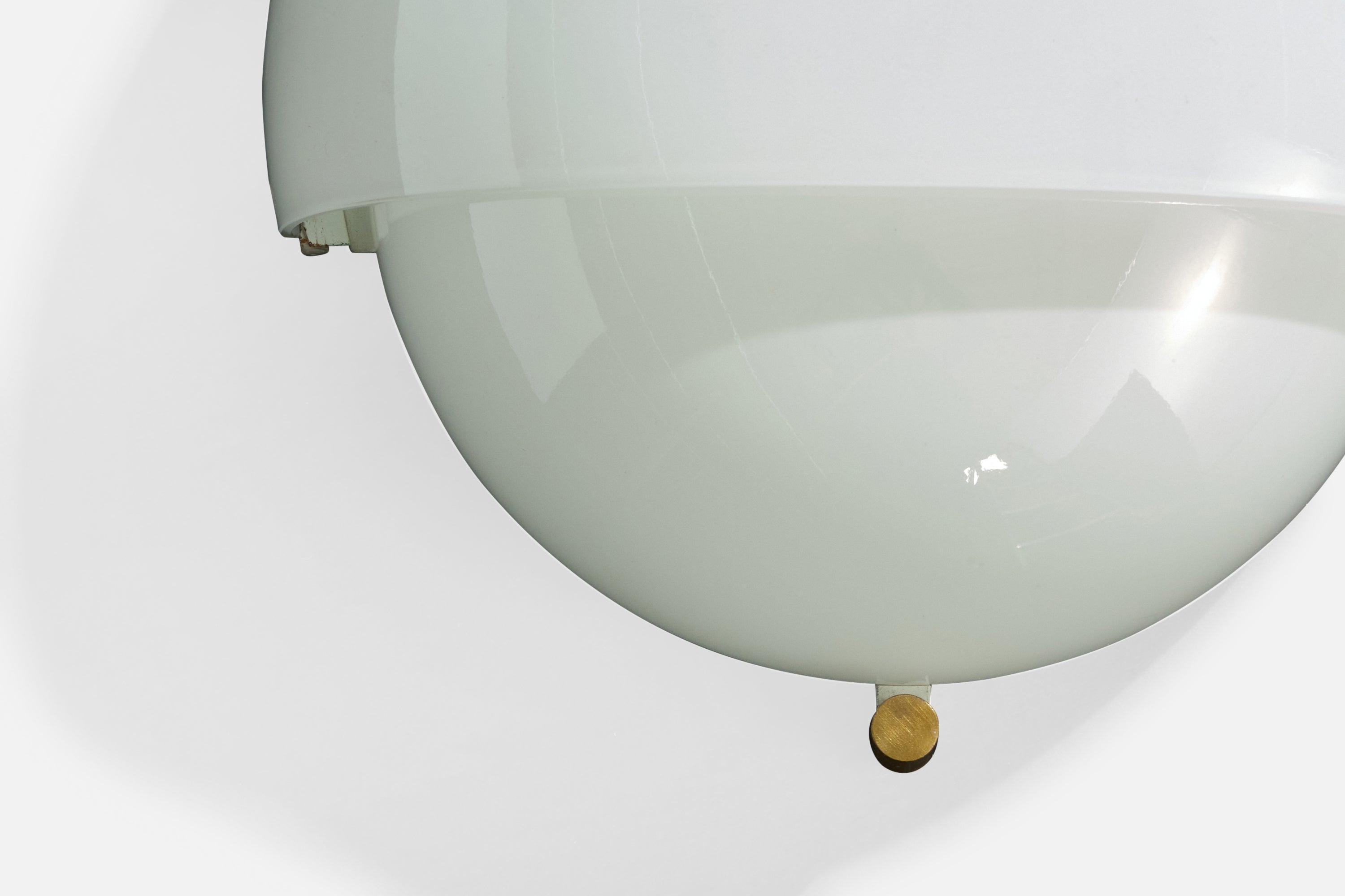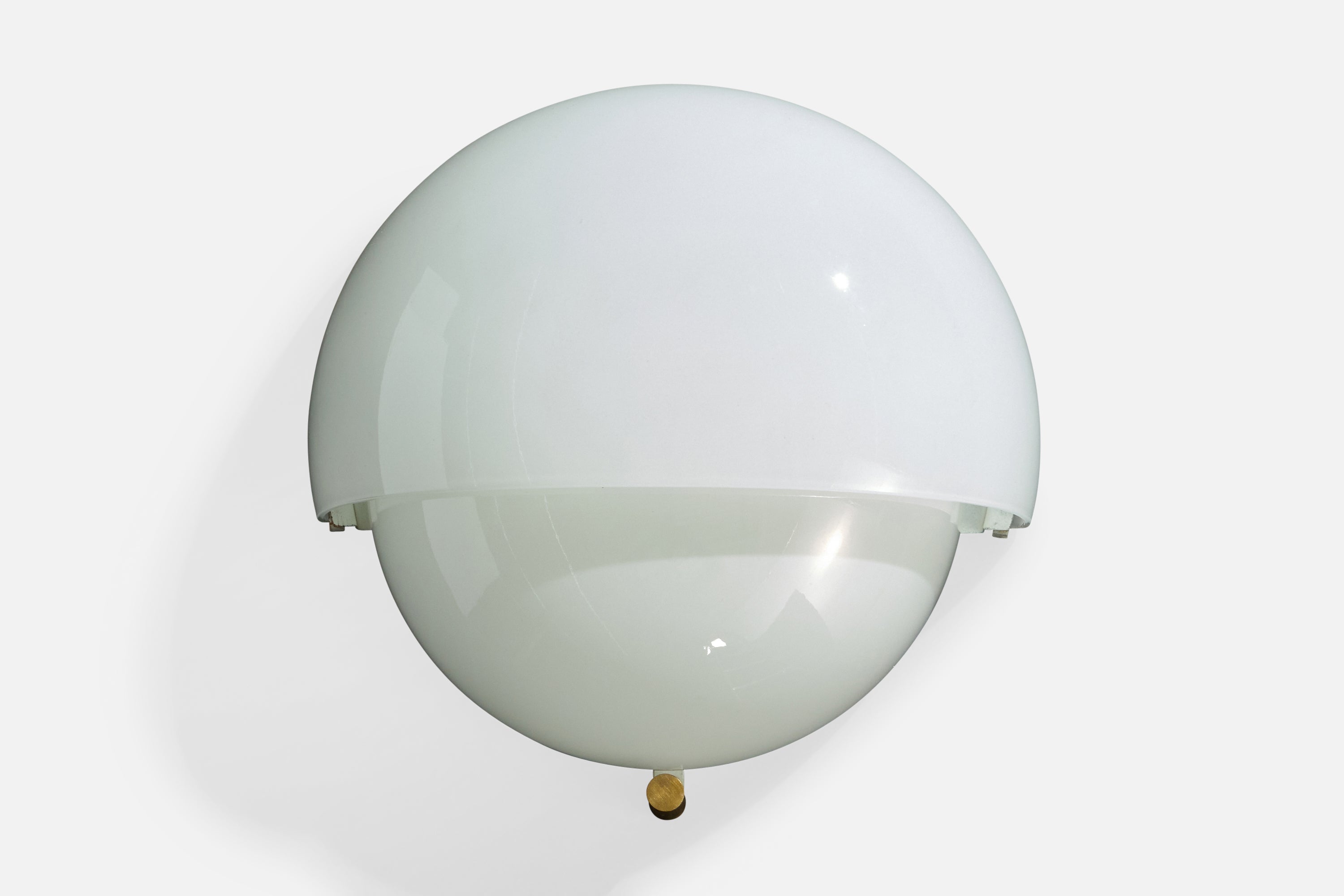 A pair of white opaline glass and brass wall lights, model Mania, designed by Vico Magistretti and produced by Artemide, Italy, 1960s.