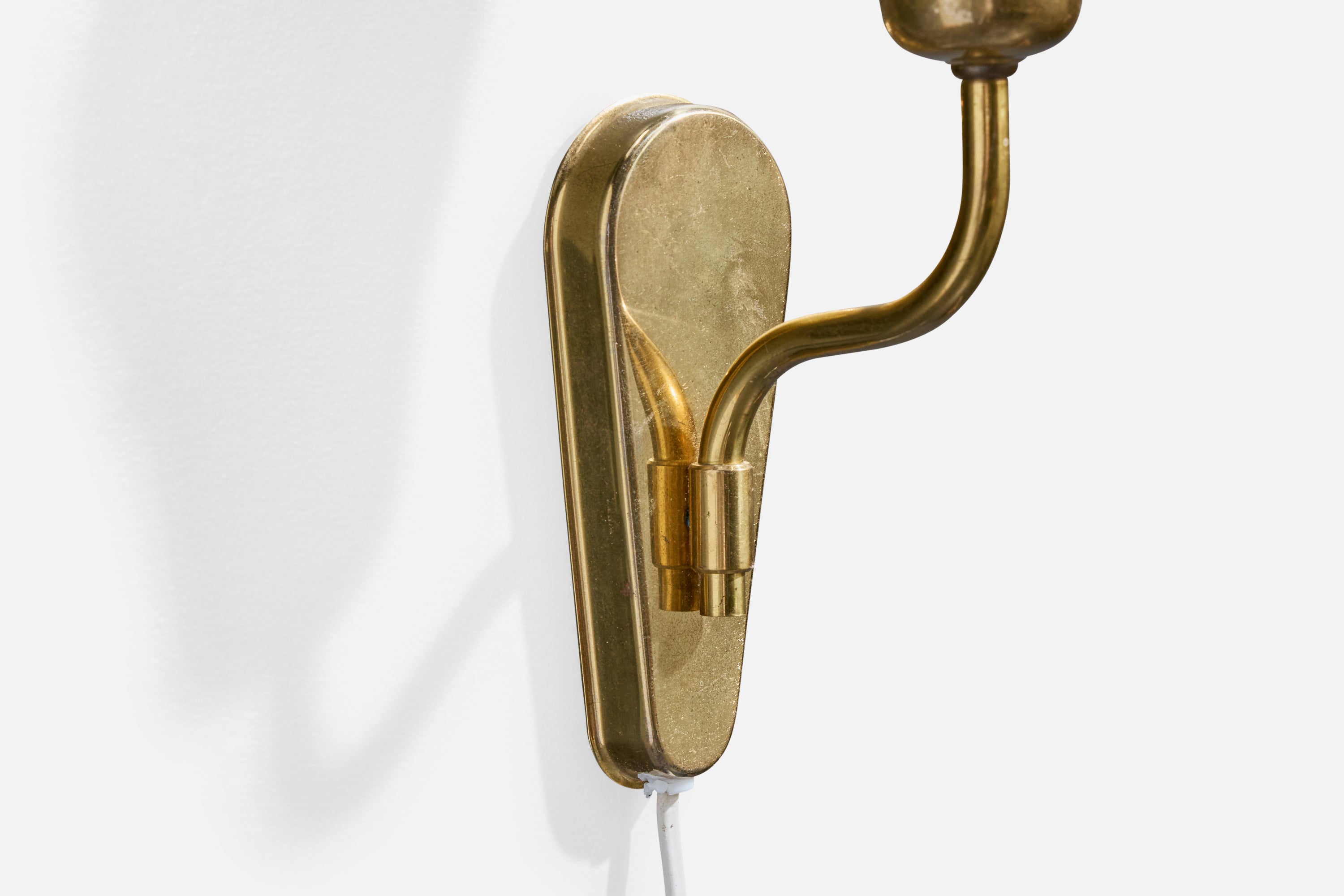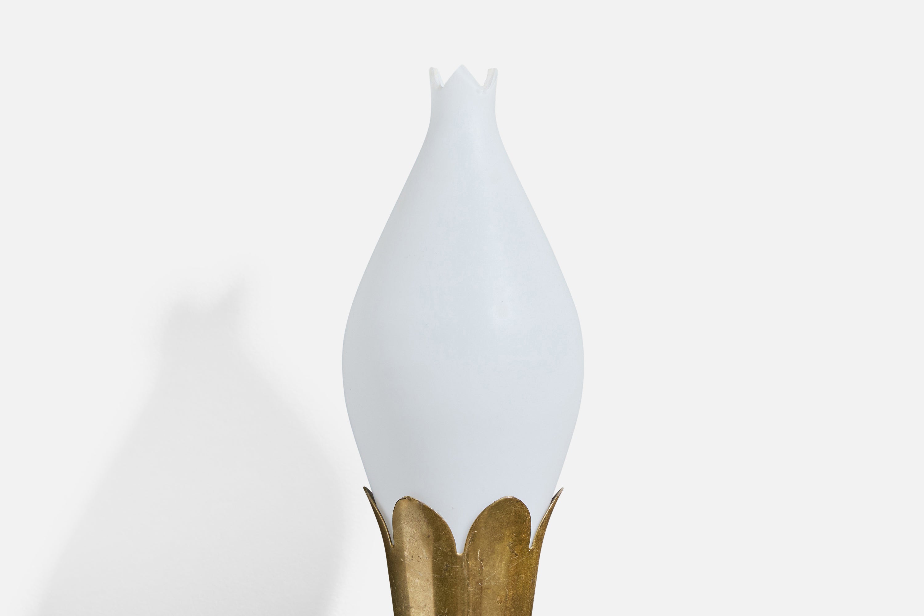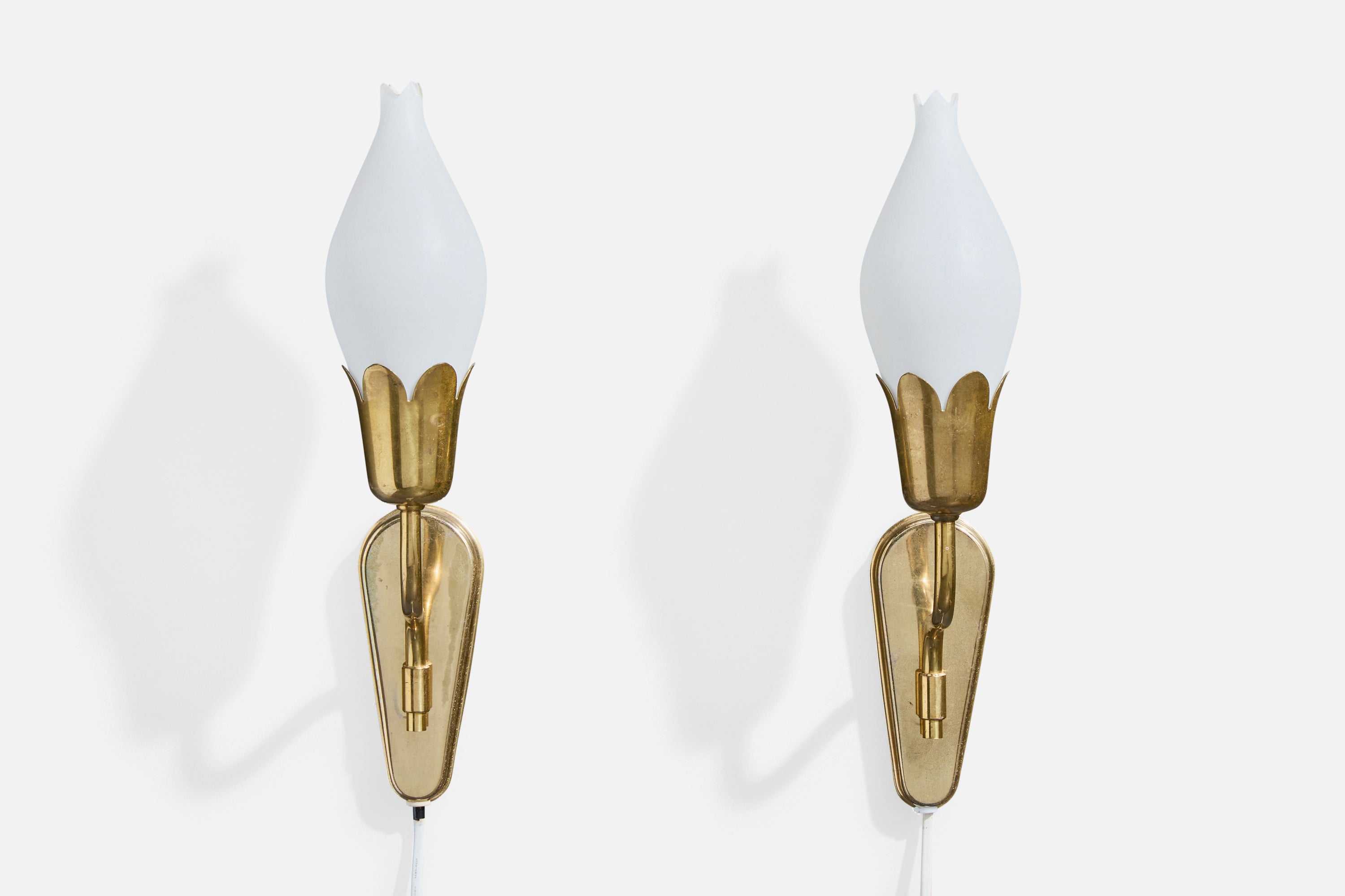 A pair of brass and white opaline glass wall lights, designed and produced by Fog & Mørup, Denmark, c. 1940s.
